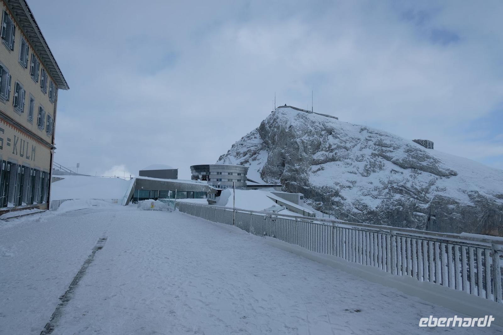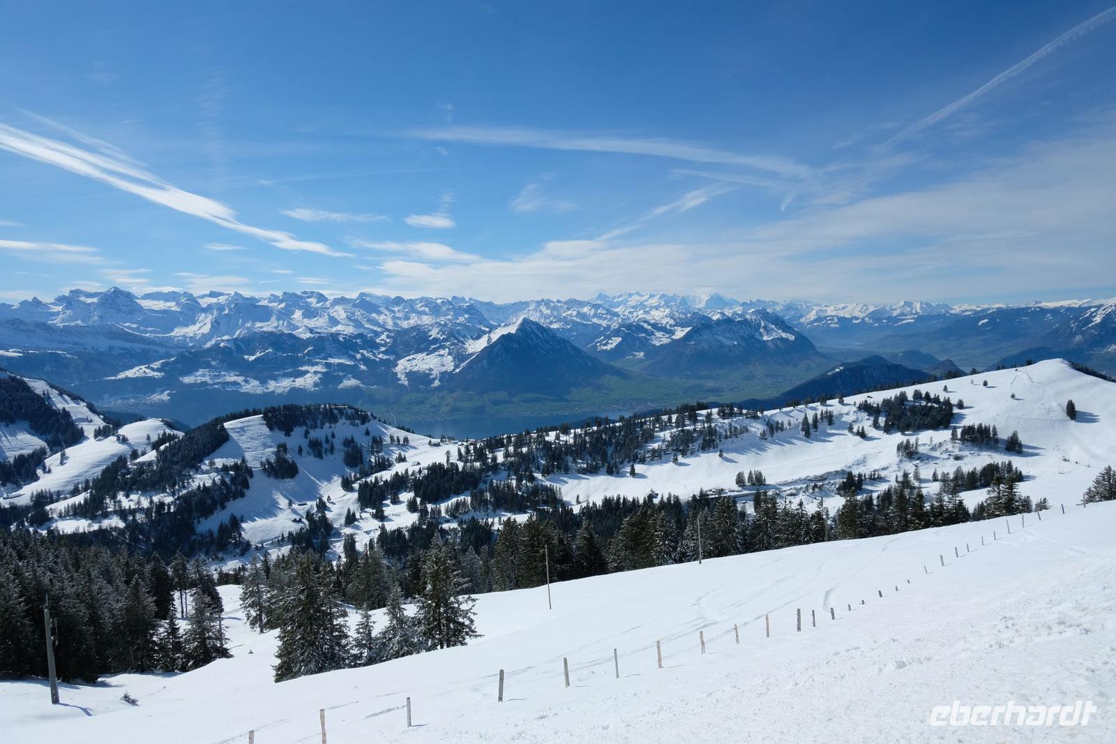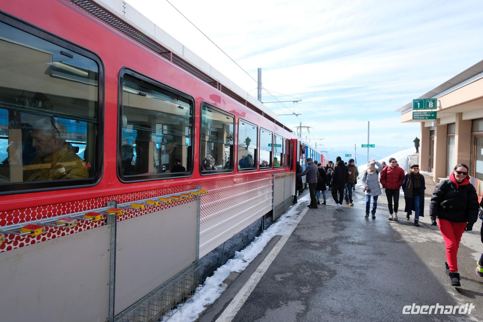 Auf dem Berg angekommen, erwartete uns eine traumhafte Sicht. Einige machten ausgiebige Schneewanderungen, andere zog es sofort in das Restaurant. Die Aepli-Makronen wurden von einigen begeistert verzehrt. Die schneebedeckten Berge von Titlis und Pilatus bis zu den Giganten des Berner Oberlandes mit Eiger, Mönch, und Jungfrau, und den anderen Drei- und Viertausendern zeigen sich uns in ihrer ganzen Pracht. Wir waren begeistert!