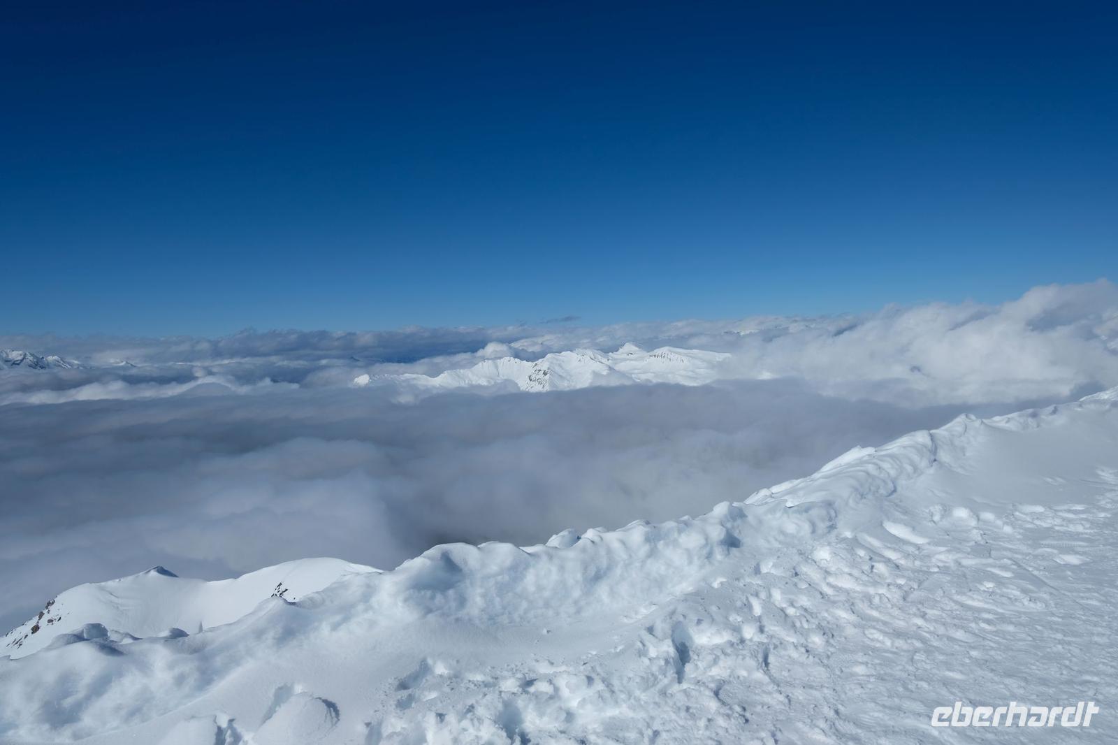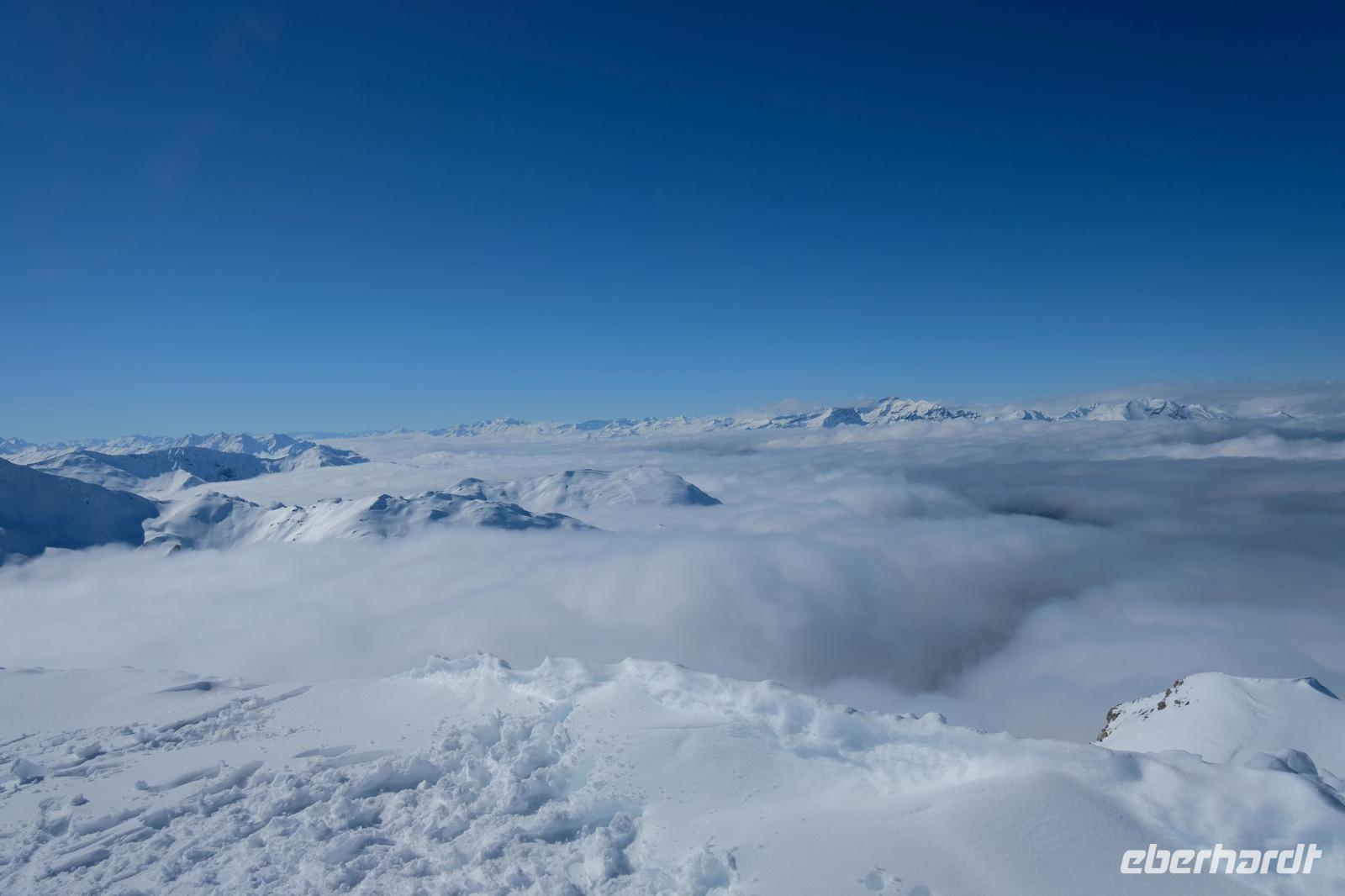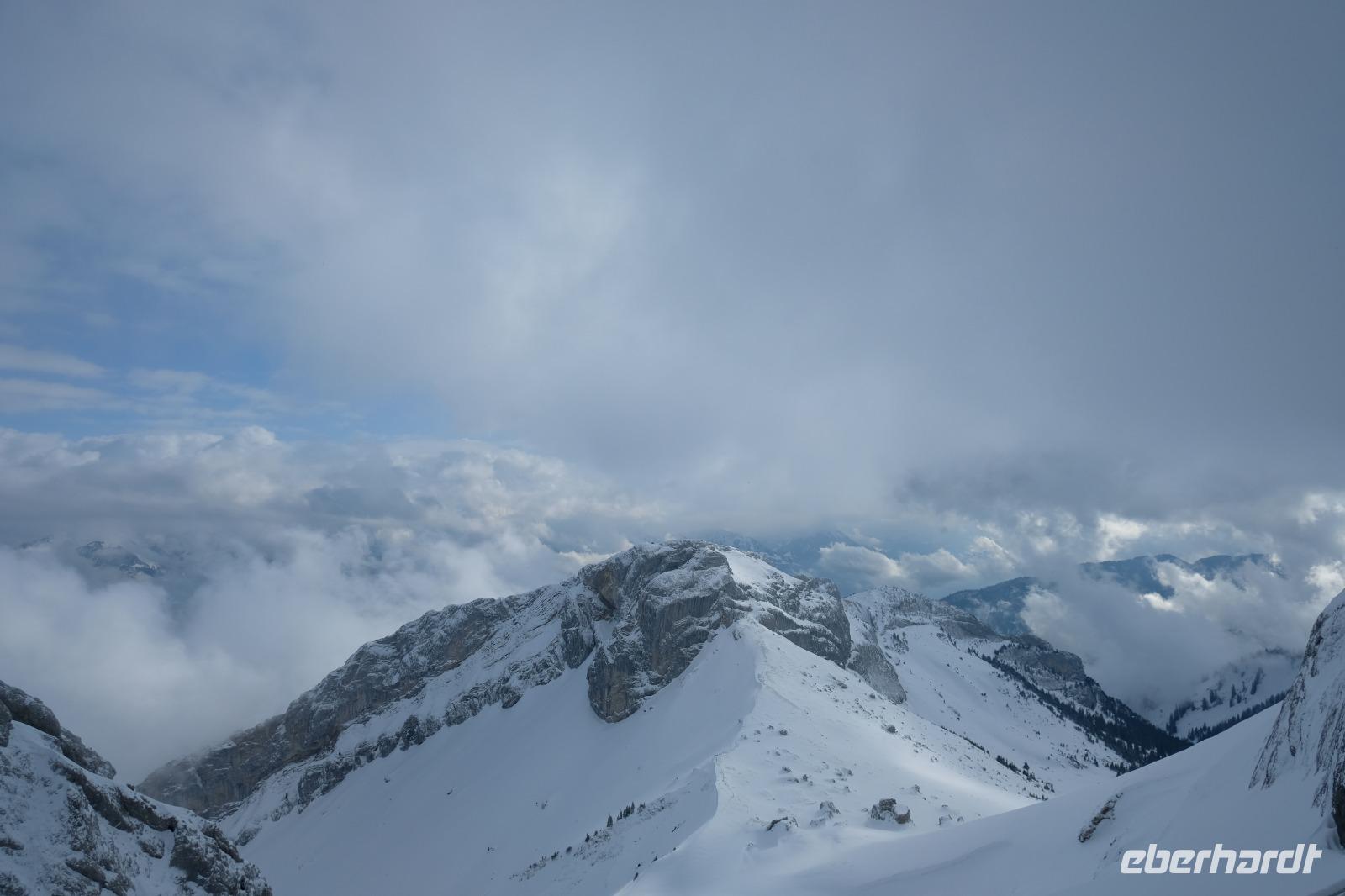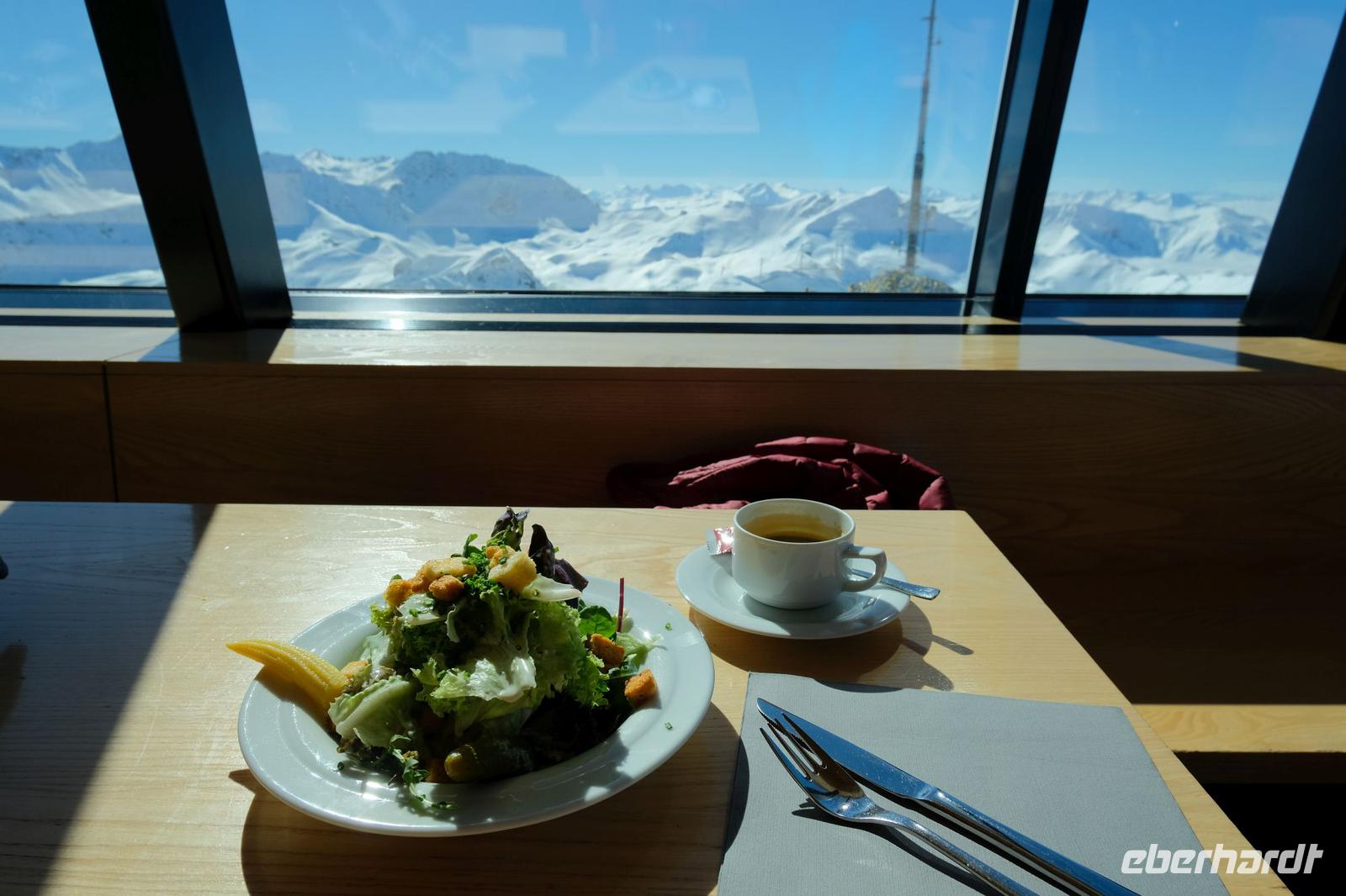 Auf dem Berg angekommen, erwartete uns eine traumhafte Sicht. Einige machten ausgiebige Schneewanderungen, andere zog es sofort in das Restaurant. Die Aepli-Makronen wurden von einigen begeistert verzehrt. Die schneebedeckten Berge von Titlis und Pilatus bis zu den Giganten des Berner Oberlandes mit Eiger, Mönch, und Jungfrau, und den anderen Drei- und Viertausendern zeigen sich uns in ihrer ganzen Pracht. Wir waren begeistert!