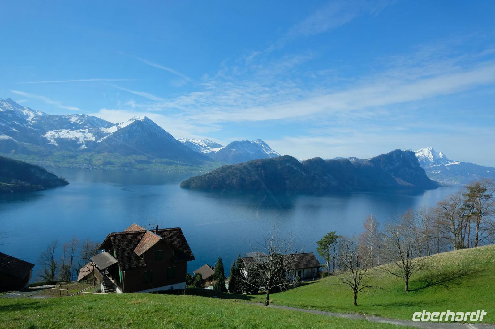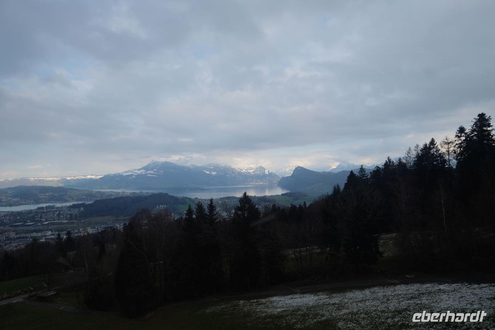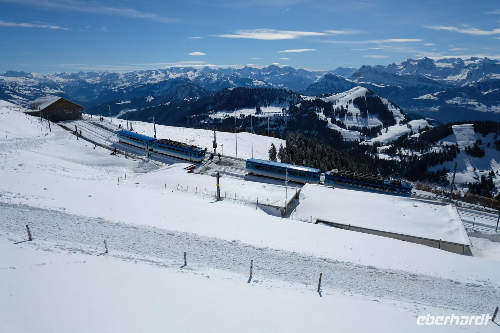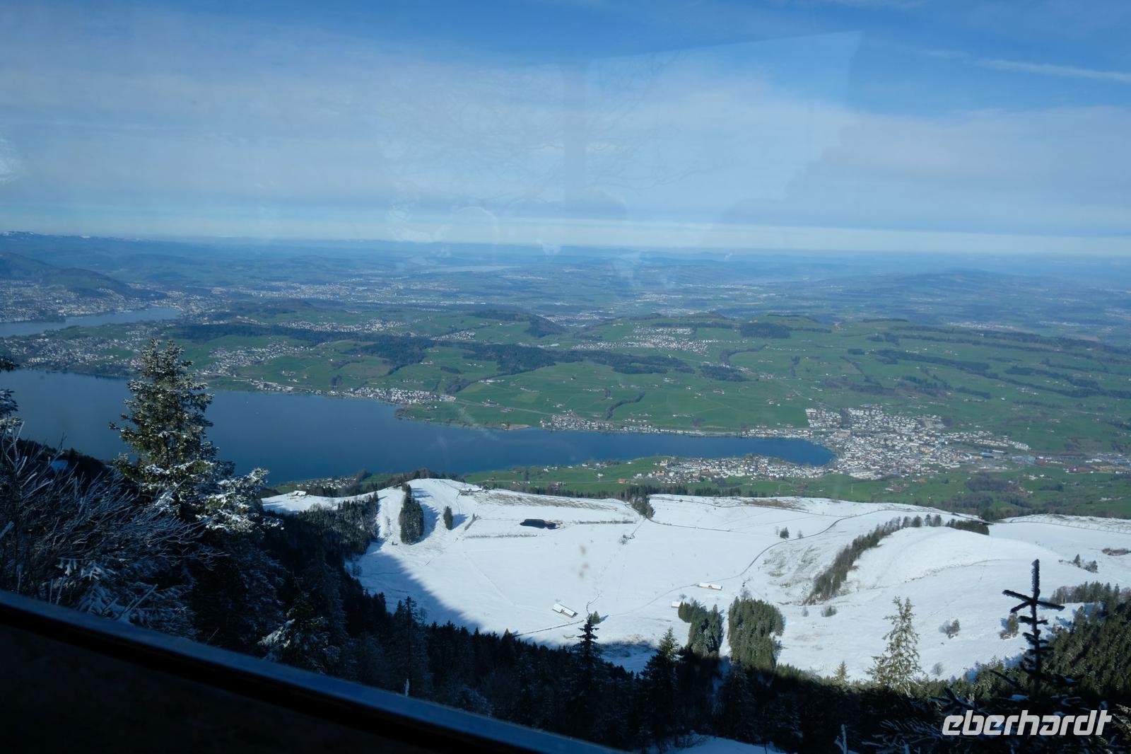 Die Sonne lacht am Morgen und so fuhren wir alle frohgelaunt nach Vitznau. Wir kamen gerade zur rechten Zeit um mit der bereits wartenden Elektrobahn auf die Rigi zu fahren. Die Blicke ins Tal waren atemberaubend, am See schon Frühling und je höher wir fuhren umso größer wurden die Schneeberge. Die Fahrt ging in reichlich 30 Minuten bis auf 1798 m.