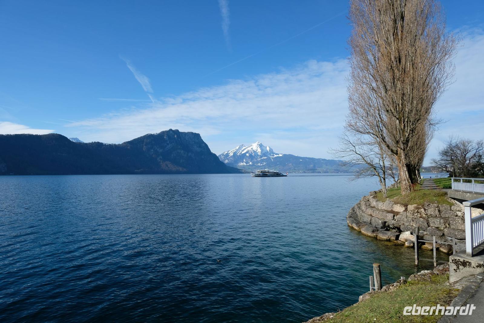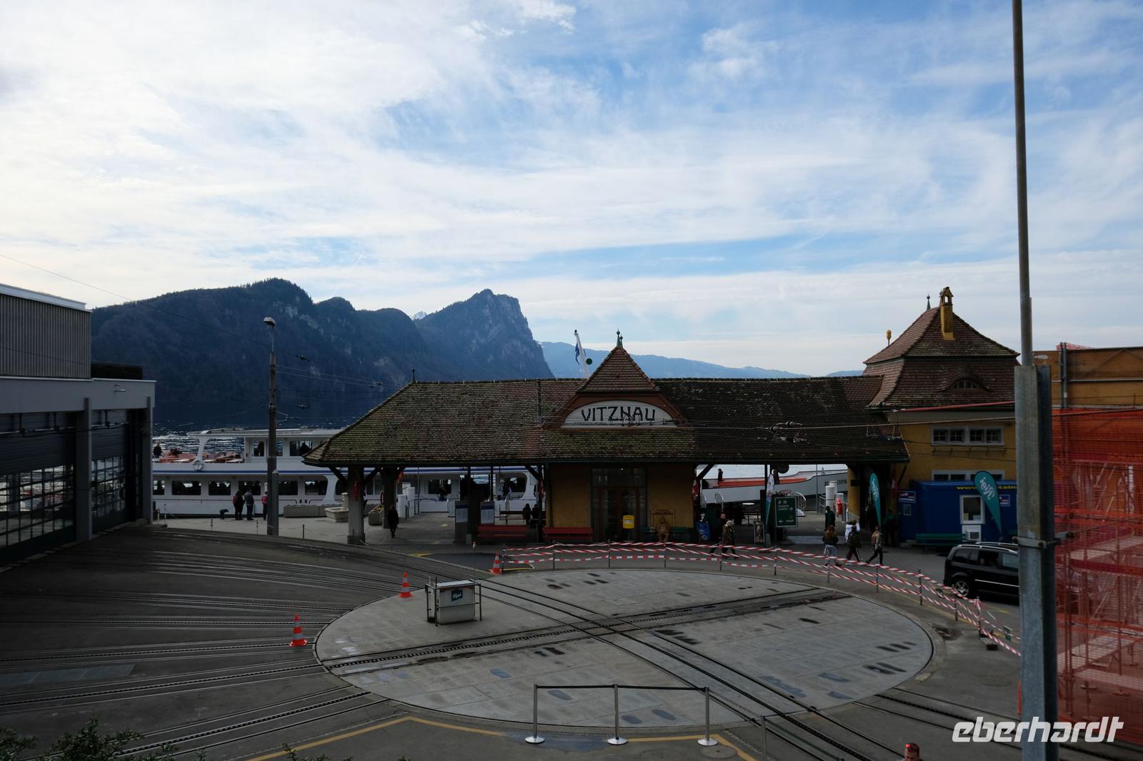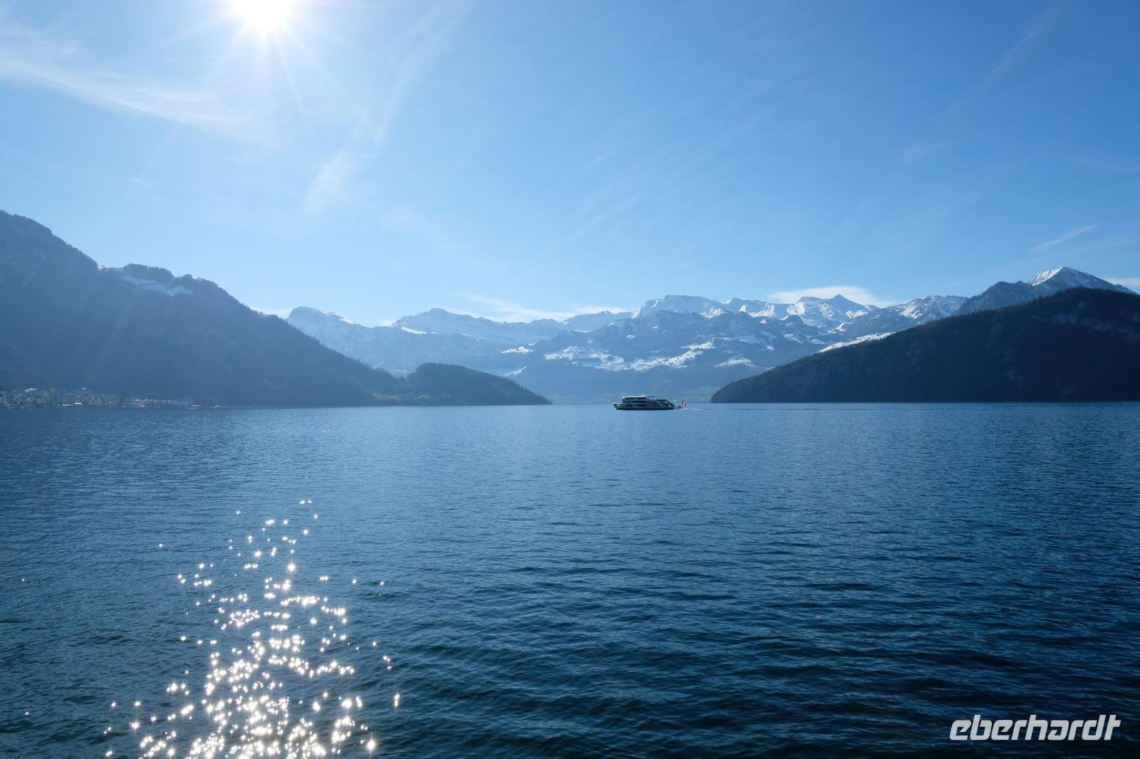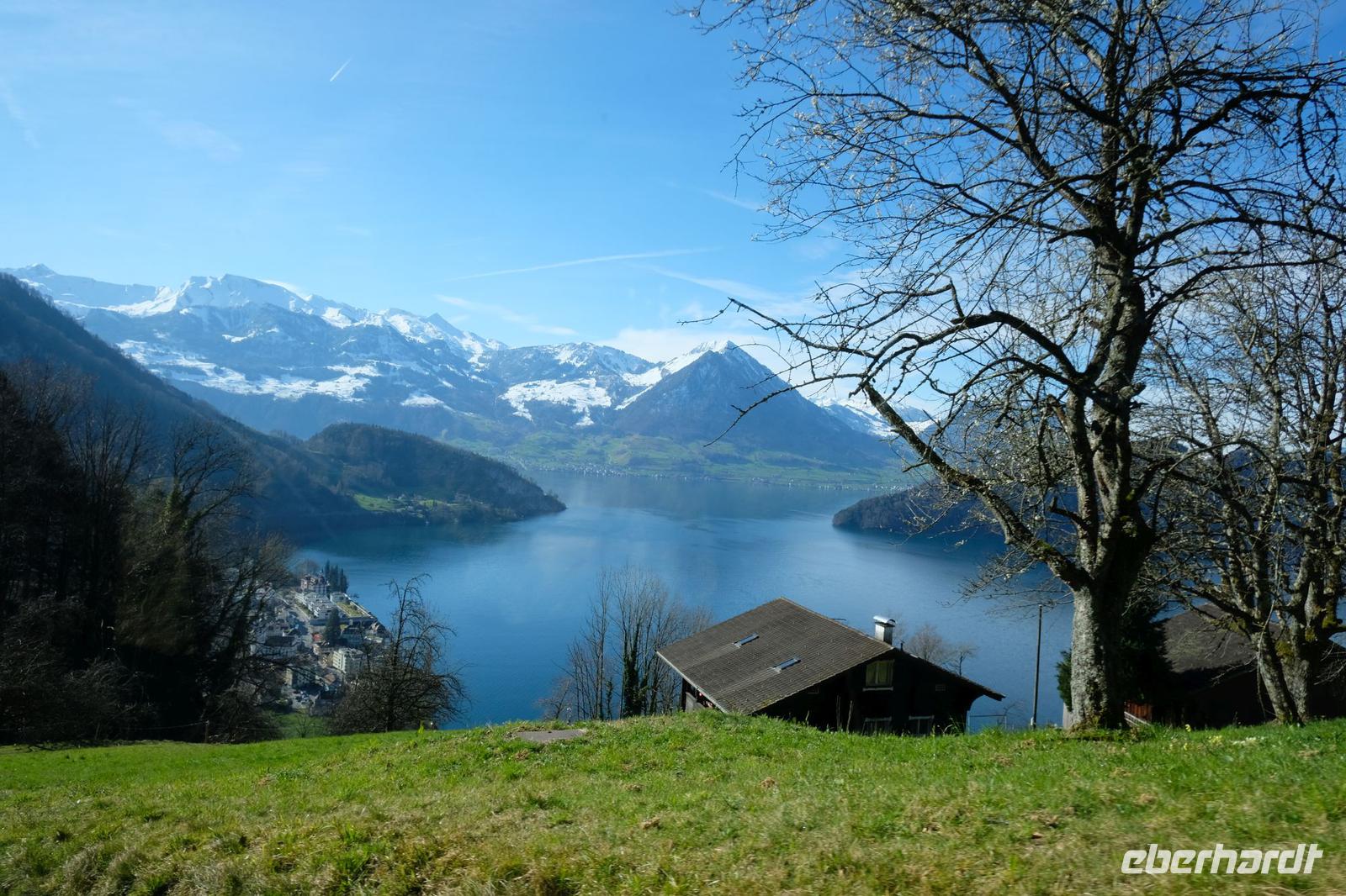 Die Sonne lacht am Morgen und so fuhren wir alle frohgelaunt nach Vitznau. Wir kamen gerade zur rechten Zeit um mit der bereits wartenden Elektrobahn auf die Rigi zu fahren. Die Blicke ins Tal waren atemberaubend, am See schon Frühling und je höher wir fuhren umso größer wurden die Schneeberge. Die Fahrt ging in reichlich 30 Minuten bis auf 1798 m.