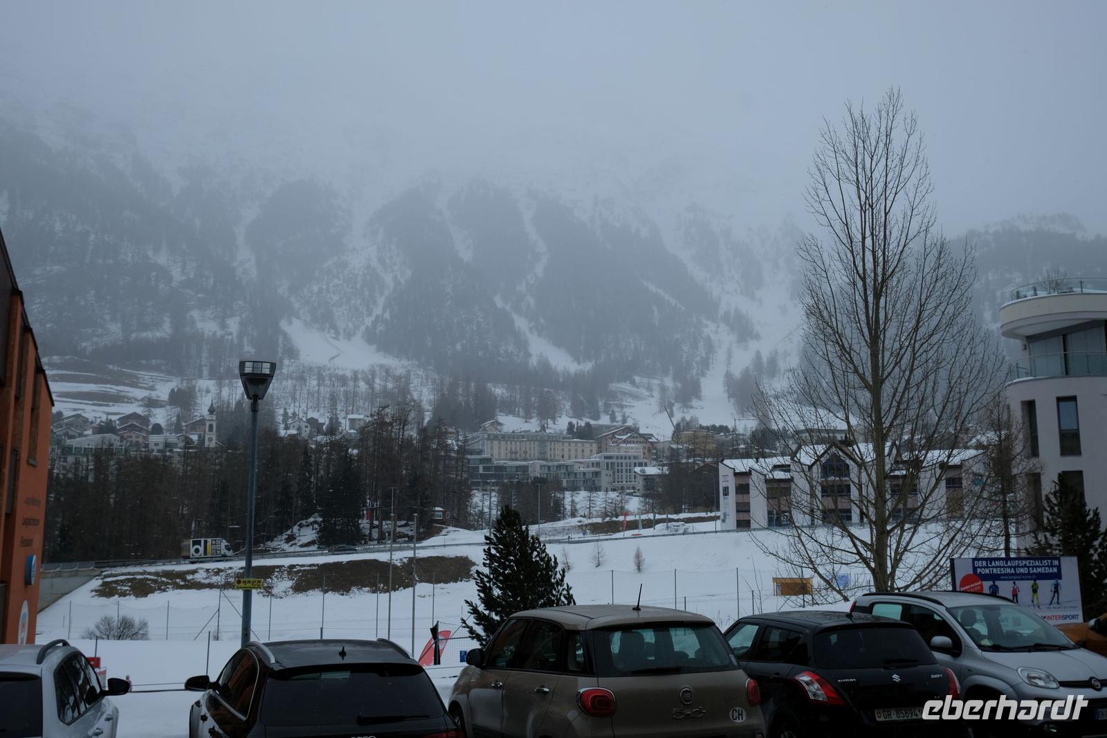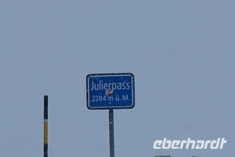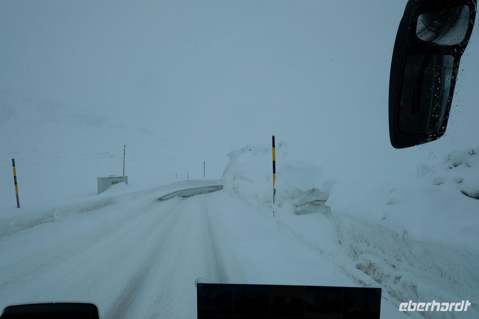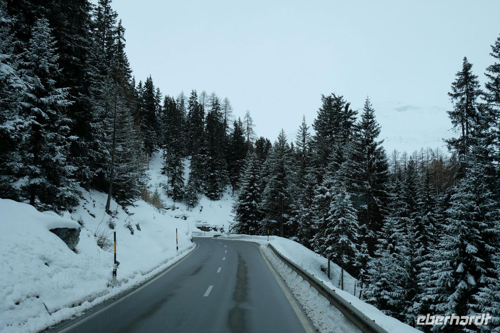 In Campocologno verließen wir den Zug, denn eine Weiterfahrt über die italienische Grenze war nicht möglich. Aber unser Busfahrer Jan wusste Bescheid uns so konnten wir sofort in unseren Bus umsteigen und in Richtung St. Moritz zurückfahren. Einen kurzen Fotostopp am Viadukt von Brusio legten wir noch ein. In St Moritz haben wir uns 1 Stunde Zeit genommen um den Ort ein wenig kennenzulernen. Leider war der Schneefall wieder kräftig, sodass wir froh waren wieder im Bus zu sitzen. Zurück über der Julierpass, auch wieder bei Nebel, ging die Fahrt zurück nach Thusis. Allerdings wurde auch der Schneefall immer schlimmer. Der Schnee blieb auf der Straße liegen, sodass unser Busfahrer Jan seine ganze Konzentration für die Fahrt brauchte.
