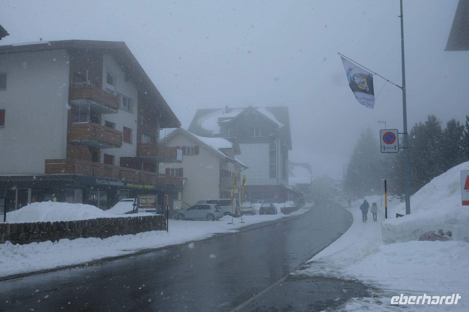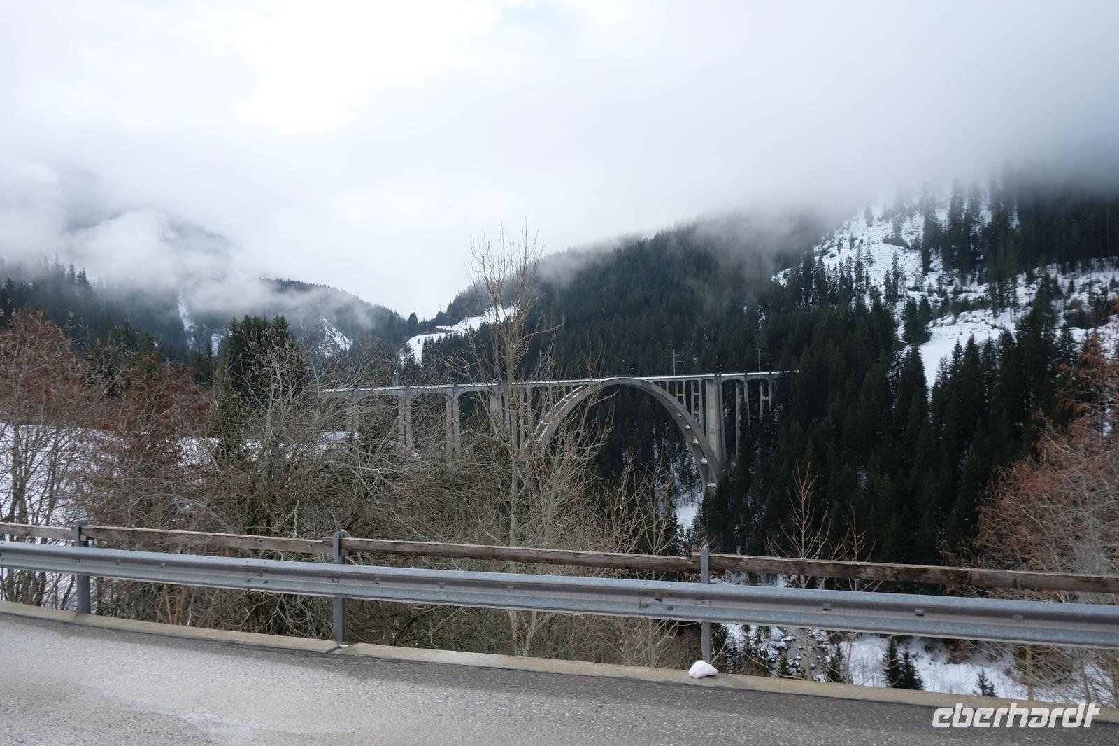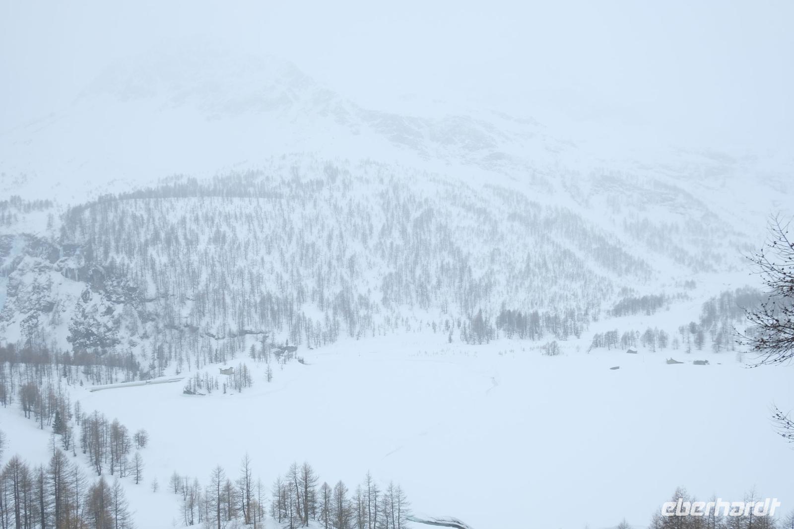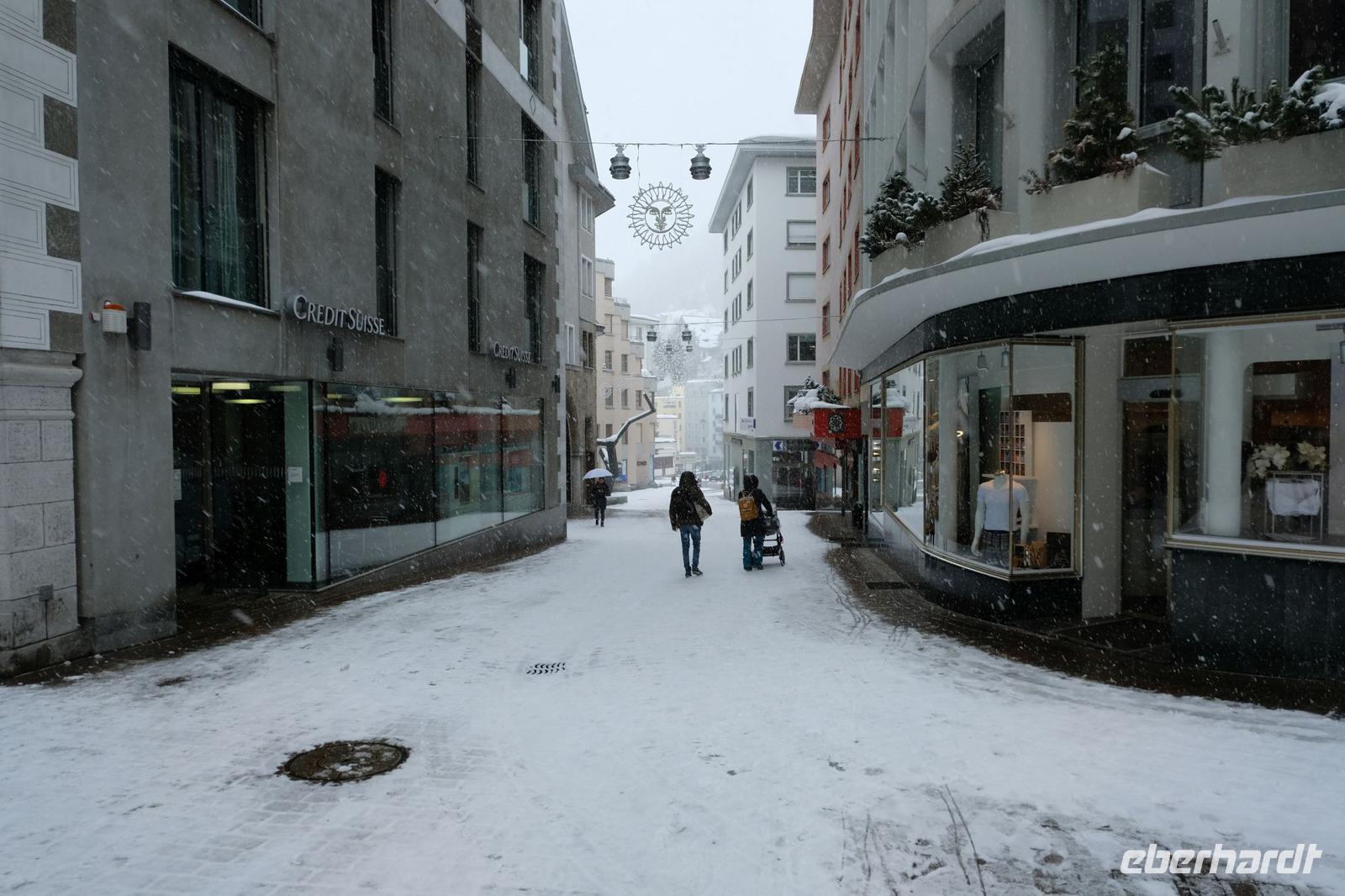 In Campocologno verließen wir den Zug, denn eine Weiterfahrt über die italienische Grenze war nicht möglich. Aber unser Busfahrer Jan wusste Bescheid uns so konnten wir sofort in unseren Bus umsteigen und in Richtung St. Moritz zurückfahren. Einen kurzen Fotostopp am Viadukt von Brusio legten wir noch ein. In St Moritz haben wir uns 1 Stunde Zeit genommen um den Ort ein wenig kennenzulernen. Leider war der Schneefall wieder kräftig, sodass wir froh waren wieder im Bus zu sitzen. Zurück über der Julierpass, auch wieder bei Nebel, ging die Fahrt zurück nach Thusis. Allerdings wurde auch der Schneefall immer schlimmer. Der Schnee blieb auf der Straße liegen, sodass unser Busfahrer Jan seine ganze Konzentration für die Fahrt brauchte.