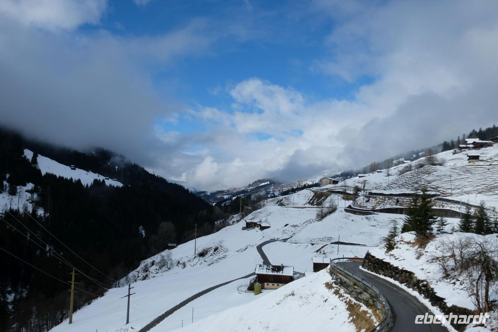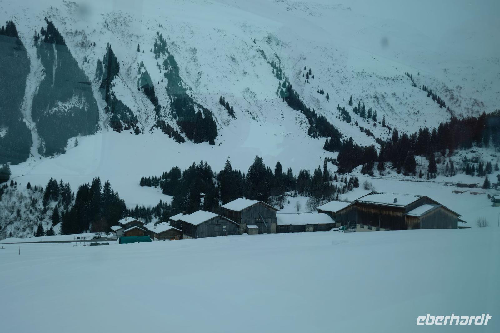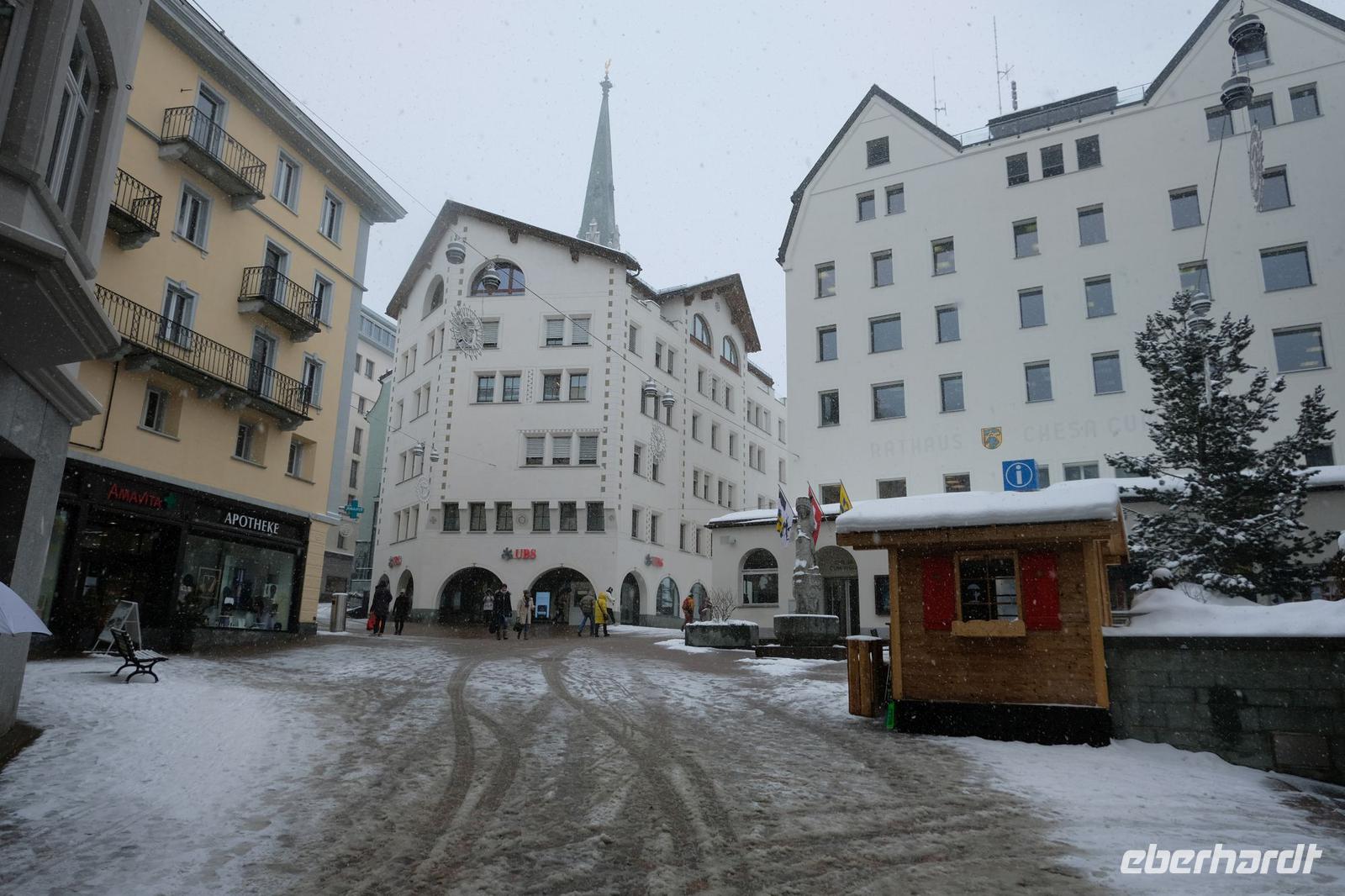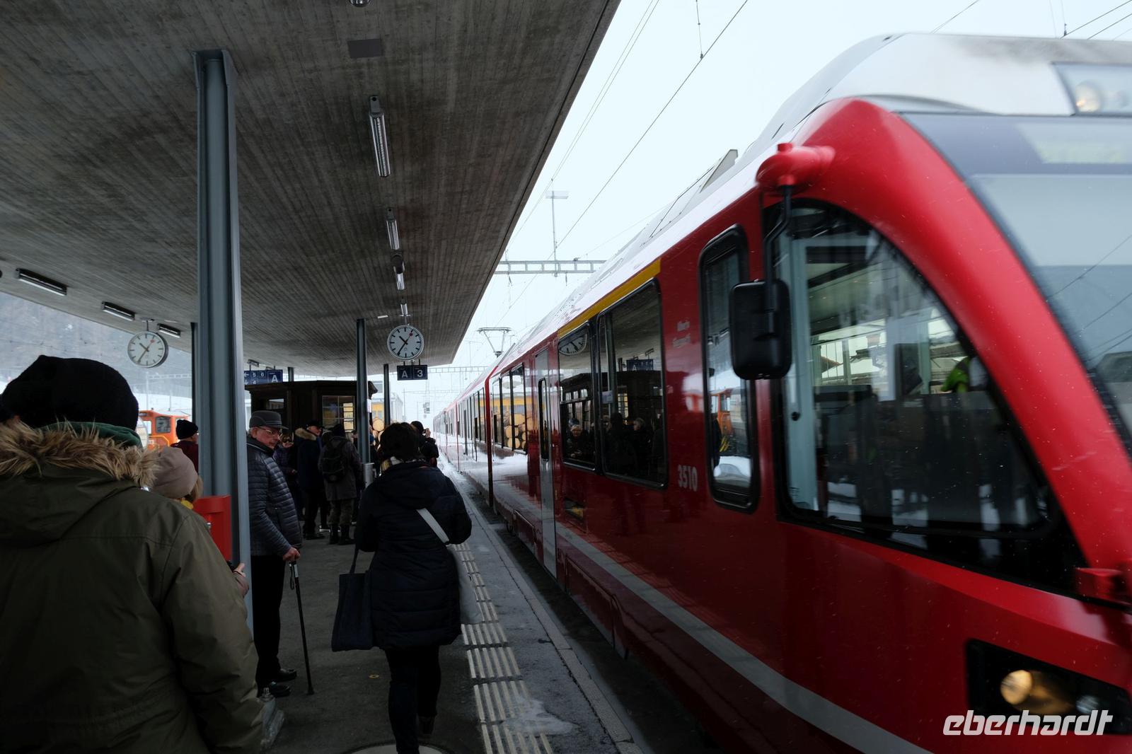 In Campocologno verließen wir den Zug, denn eine Weiterfahrt über die italienische Grenze war nicht möglich. Aber unser Busfahrer Jan wusste Bescheid uns so konnten wir sofort in unseren Bus umsteigen und in Richtung St. Moritz zurückfahren. Einen kurzen Fotostopp am Viadukt von Brusio legten wir noch ein. In St Moritz haben wir uns 1 Stunde Zeit genommen um den Ort ein wenig kennenzulernen. Leider war der Schneefall wieder kräftig, sodass wir froh waren wieder im Bus zu sitzen. Zurück über der Julierpass, auch wieder bei Nebel, ging die Fahrt zurück nach Thusis. Allerdings wurde auch der Schneefall immer schlimmer. Der Schnee blieb auf der Straße liegen, sodass unser Busfahrer Jan seine ganze Konzentration für die Fahrt brauchte.