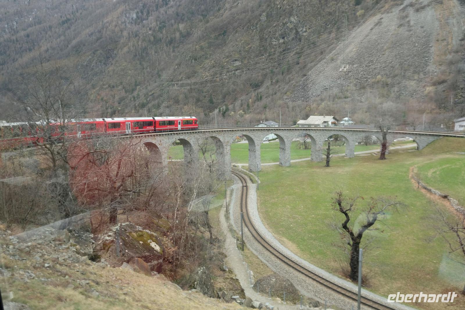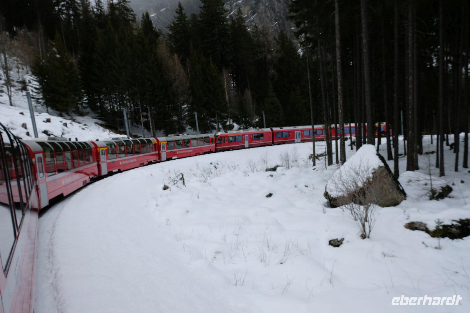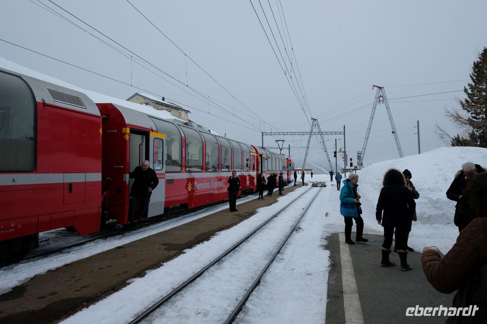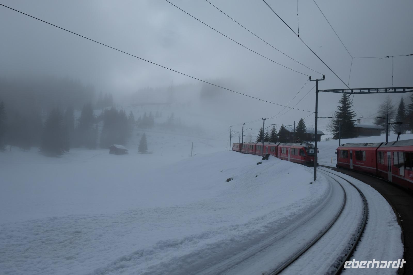 In Alp Grüm hielt der Bernina Express länger und wir hatten hier Gelegenheit, auszusteigen und zu fotografieren. Der Nebel und der frisch gefallene Schnee verhinderten farbenfrohe Bilder. Am Kreisviadukt Brusio erleben wir die hohe Kunst der Eisenbahntechnik, denn hier ermöglicht das angelegte Viadukt eine künstliche Streckenausweitung auf engsten Raum, damit die Bahn den Höhenunterschied meistern kann.