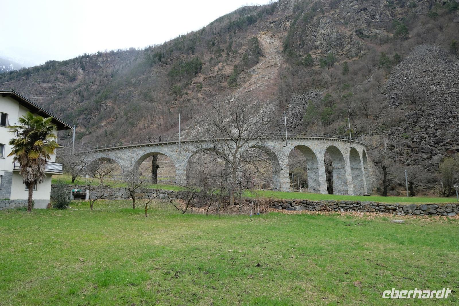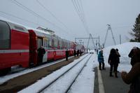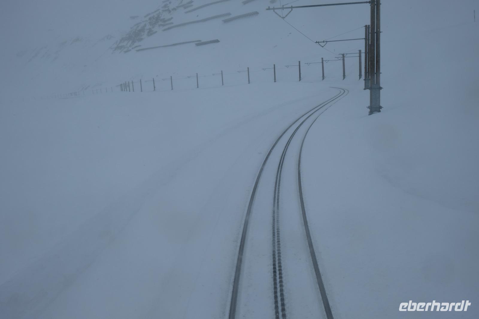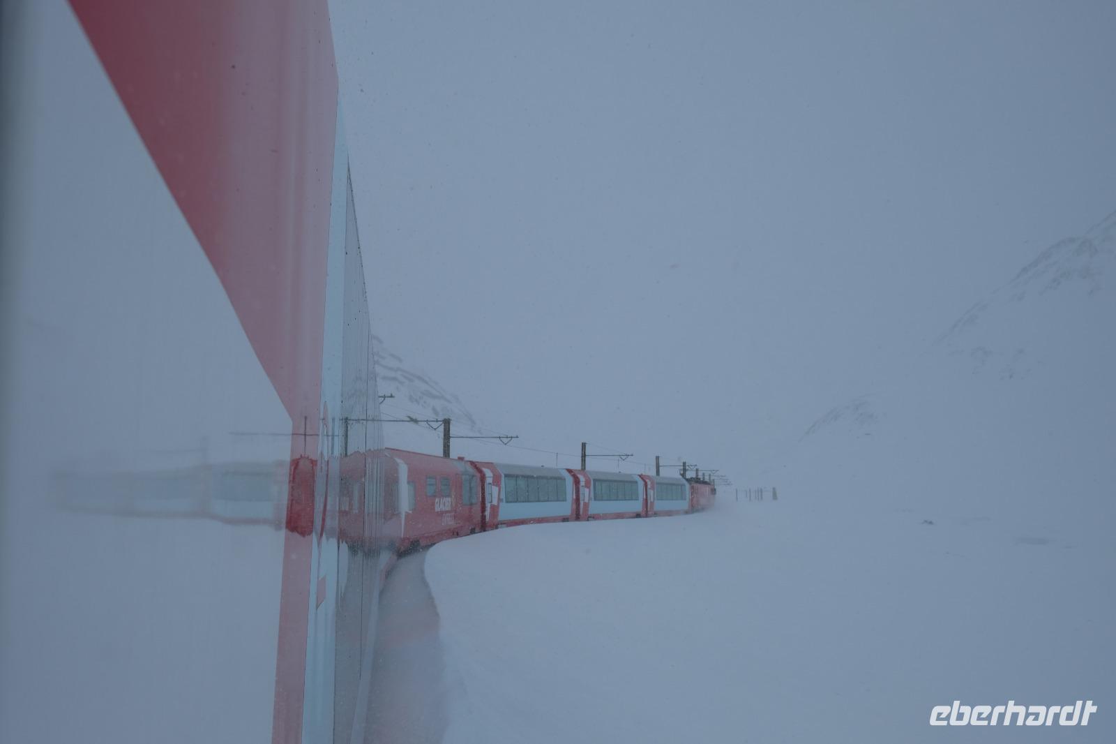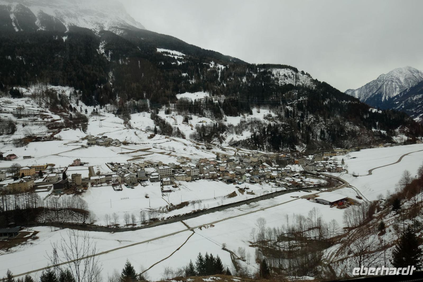 In Alp Grüm hielt der Bernina Express länger und wir hatten hier Gelegenheit, auszusteigen und zu fotografieren. Der Nebel und der frisch gefallene Schnee verhinderten farbenfrohe Bilder. Am Kreisviadukt Brusio erleben wir die hohe Kunst der Eisenbahntechnik, denn hier ermöglicht das angelegte Viadukt eine künstliche Streckenausweitung auf engsten Raum, damit die Bahn den Höhenunterschied meistern kann.