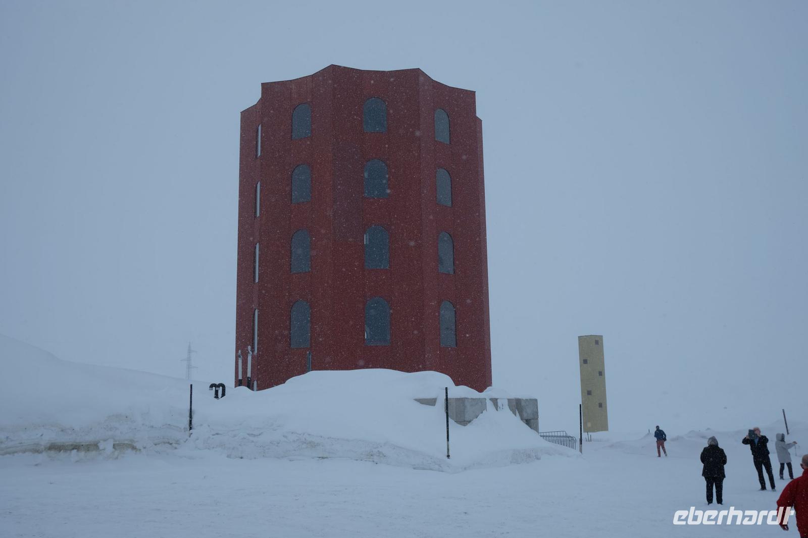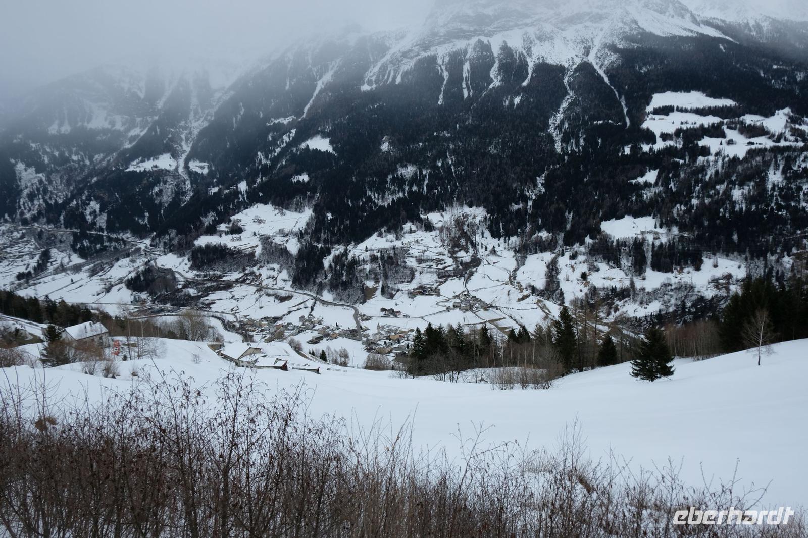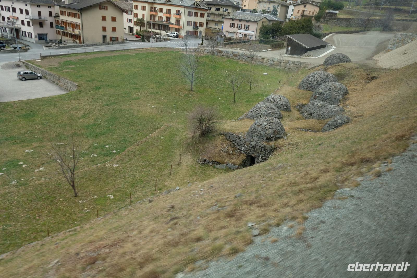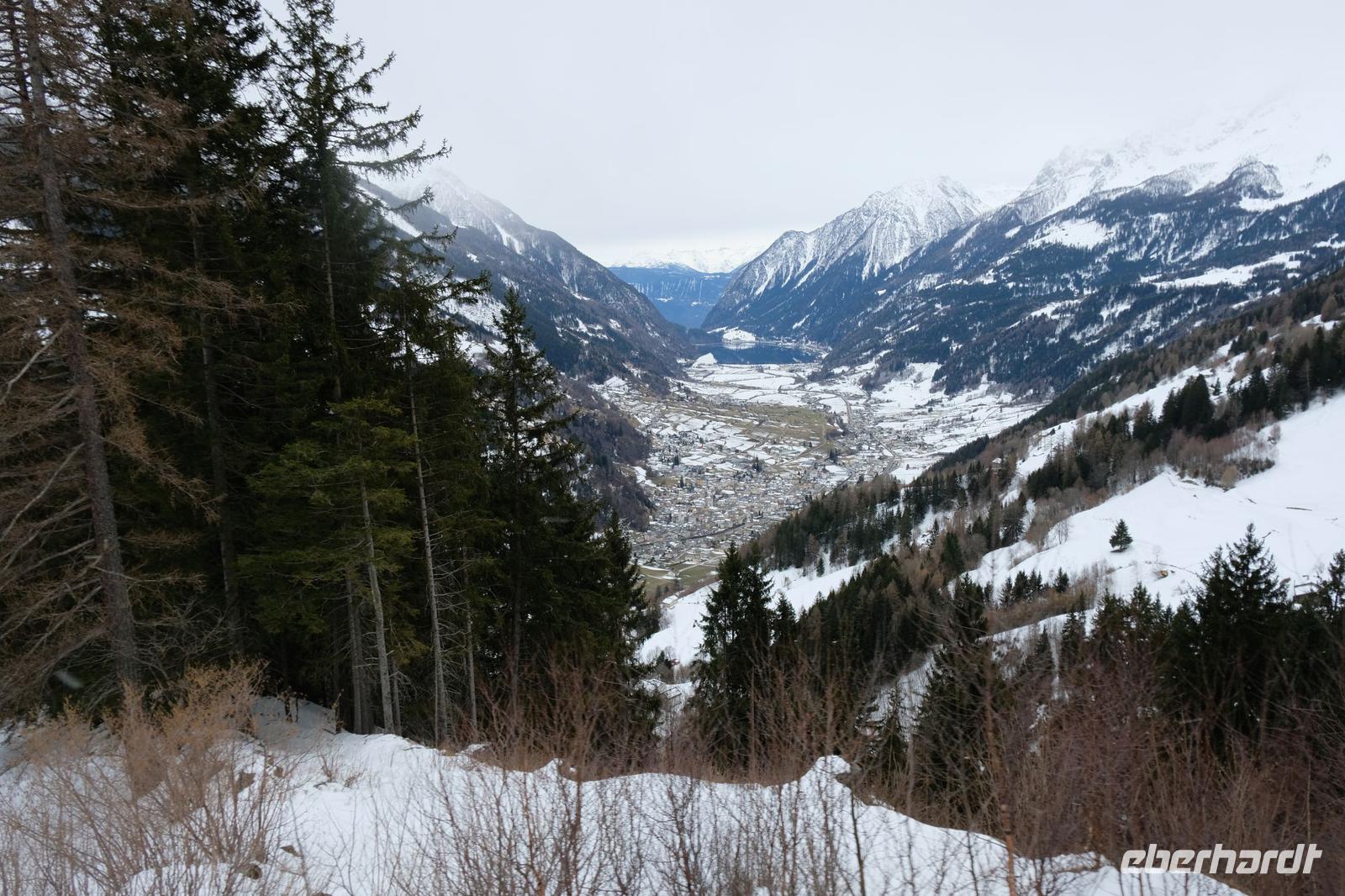 In Alp Grüm hielt der Bernina Express länger und wir hatten hier Gelegenheit, auszusteigen und zu fotografieren. Der Nebel und der frisch gefallene Schnee verhinderten farbenfrohe Bilder. Am Kreisviadukt Brusio erleben wir die hohe Kunst der Eisenbahntechnik, denn hier ermöglicht das angelegte Viadukt eine künstliche Streckenausweitung auf engsten Raum, damit die Bahn den Höhenunterschied meistern kann.