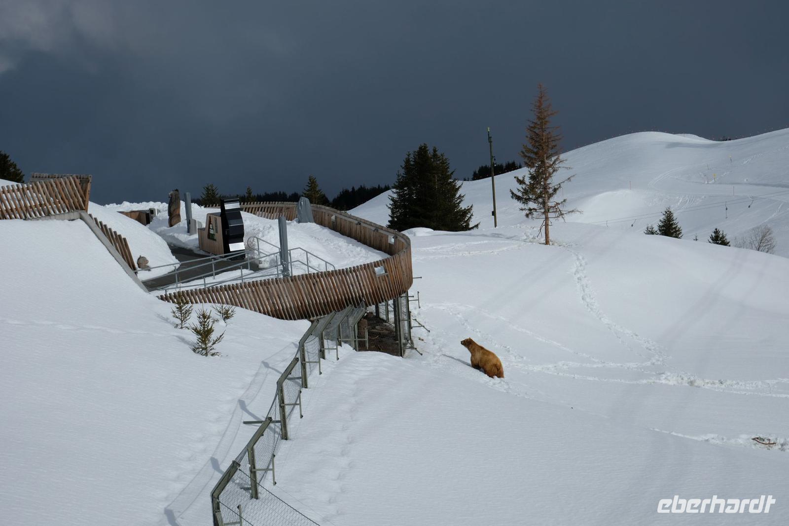 Trotz Nebel wagten wir sofort die Auffahrt mit der Kabinenbahn hinauf zum Weisshorn. Dort oben, auf 2653 m, erwartete uns purer Sonnenschein mit einem atemberaubenden Blick zu vielen Bergen in der Umgebung. Alle Gäste unserer Reisegruppe genossen den Ausblick und die wärmenden Strahlen der Sonne. Zurück zum Tal machten einige Gäste noch Halt auf der Mittelstation und bestaunten einen Braunbären im „Bärenland".