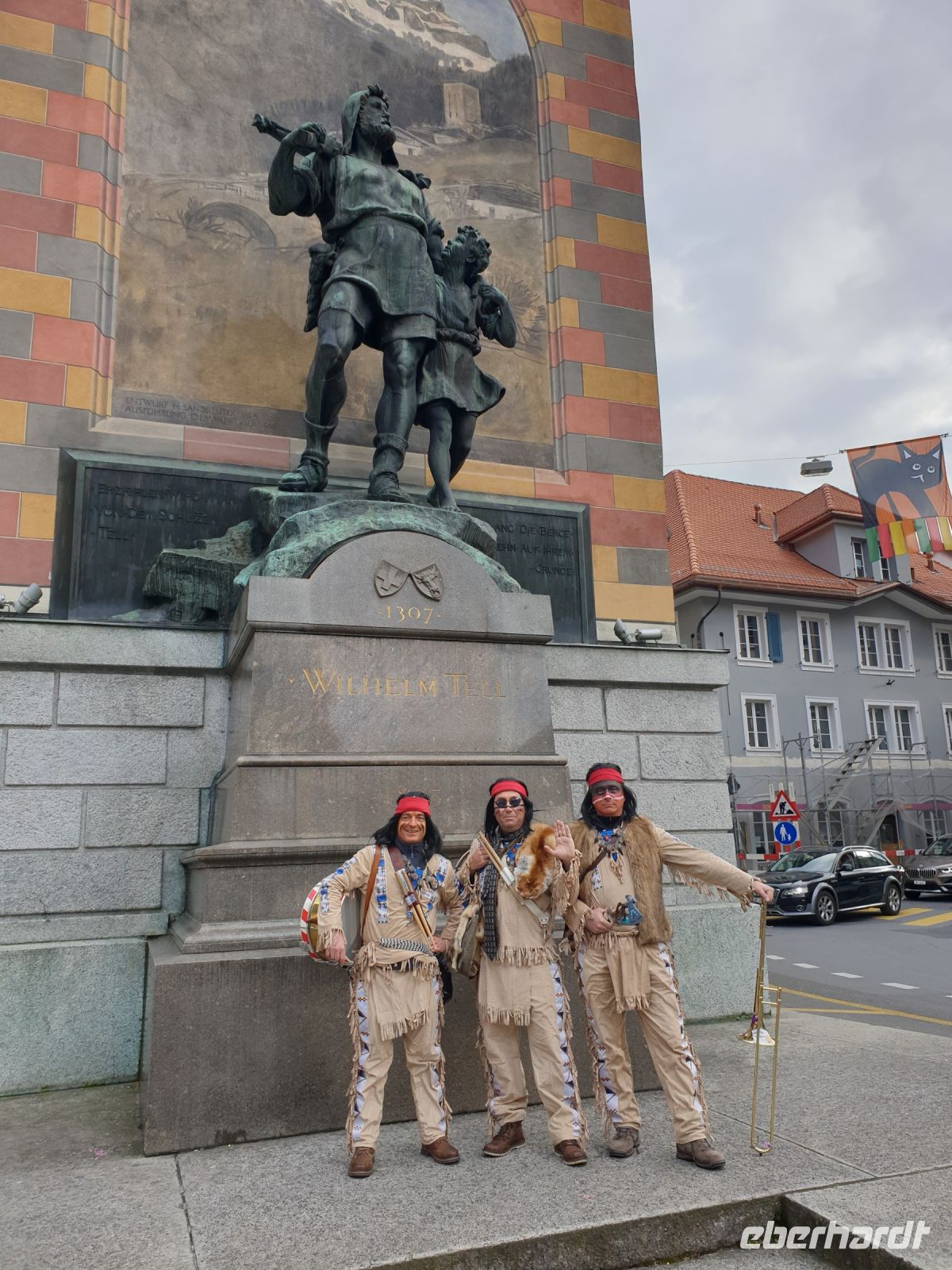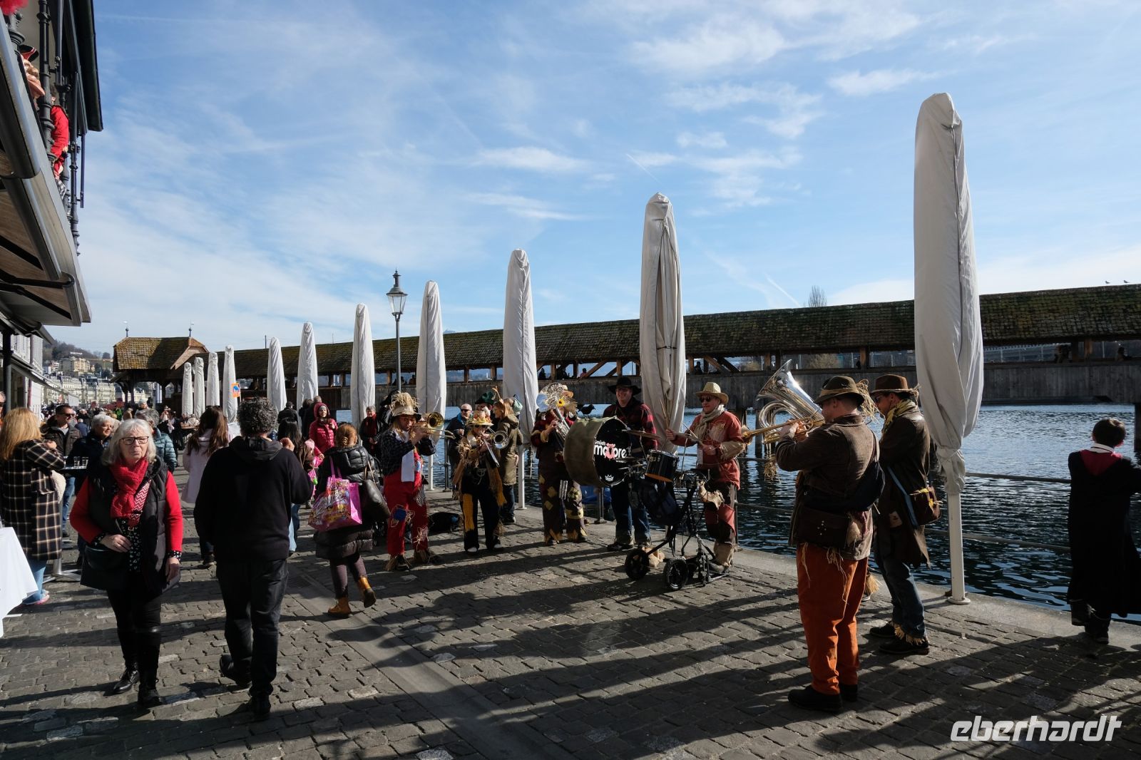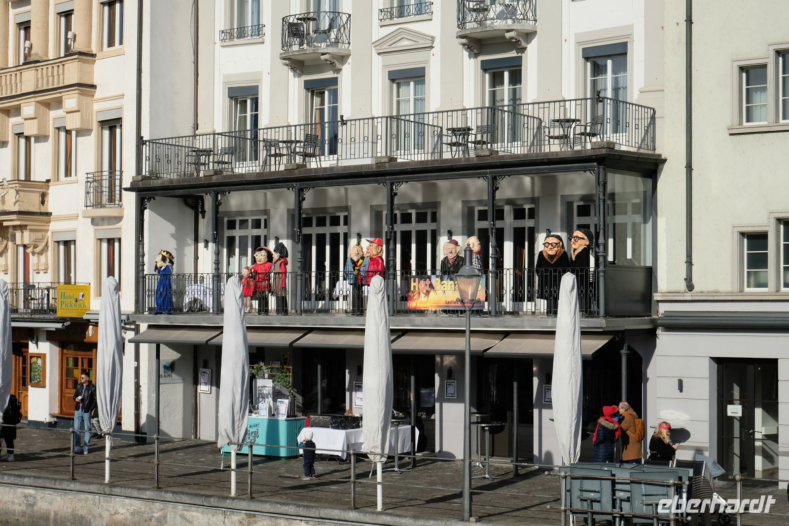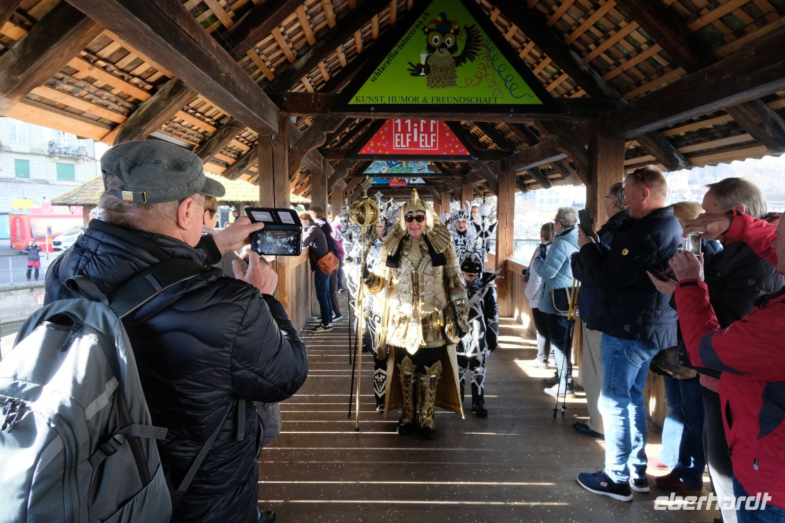 Nach unserem gemeinsamen Frühstück fuhren wir heute voller Erwartungen nach Luzern. Wir wussten dass heute Fasnacht ist, aber was das in Luzern bedeutet war uns nicht klar. Die Sonne lacht, und alle hatten beste Laune. Unser erstes Ziel war der Löwenplatz, wo uns schon Susy Hoffstetter, unsere Stadtführerin, erwartete. Nach umfangreichen Erklärungen am Löwendenkmal ging es dann zu Fuß durch die Stadt Luzern. Sie ist das Tor zur Zentralschweiz und eine der schönsten Städte des Landes. Susy führte uns über die Kapellbrücke und zur Jesuitenkirche. Leider war die Kirche wegen der Fastnachtsfeier geschlossen. Dann ging sie mit uns zum Marktplatz und weiter durch die Altstadt wieder zurück zum Schwanenplatz. Susy, die uns ihre Stadt sehr gut vermittelte, gab uns auch Einblicke in soziale Verhältnisse, Spannungsfelder und ökonomische Zwänge durch das Ausbleiben der asiatischen Gäste, aber auch über die Tradition der Fastnacht in Luzern. Die berühmte Guggenmusik begeisterte uns alle. Imposant die vielen Masken und Kostüme. Wir beobachteten wie sich die Stadt immer mehr in eine Fasnachtshochburg verwandelte. Nach der Verabschiedung unserer Stadtführerin blieb uns noch Zeit für einen individuellen Stadtbummel. Anschließend fuhren wir mit einigen Gästen nach Kriens. Sie wollten alle auf den Pilatus, in der Hoffnung auf atemberaubende Bergblicke. Zunächst mit der 4er Gondel bis nach Fräkmüntegg, danach weiter mit der Kabinenbahn bis zum Pilatus. Der Esel, als zentraler Gipfel (2122m) war nicht zu erklimmen, die Schneemassen waren noch zu heftig. Wir alle wurden nicht enttäuscht, die Berge waren zu sehen, selbst Eiger, Mönch und Jungfrau zeigten sich. Inzwischen hatte Jan, unser Busfahrer, den in der Stadt verbliebenen Gast geholt, und so konnten alle Reiseteilnehmer am späten Nachmittag zurück zum Hotel fahren. Zum Abendessen gab es ein leckeres Käsefondue.