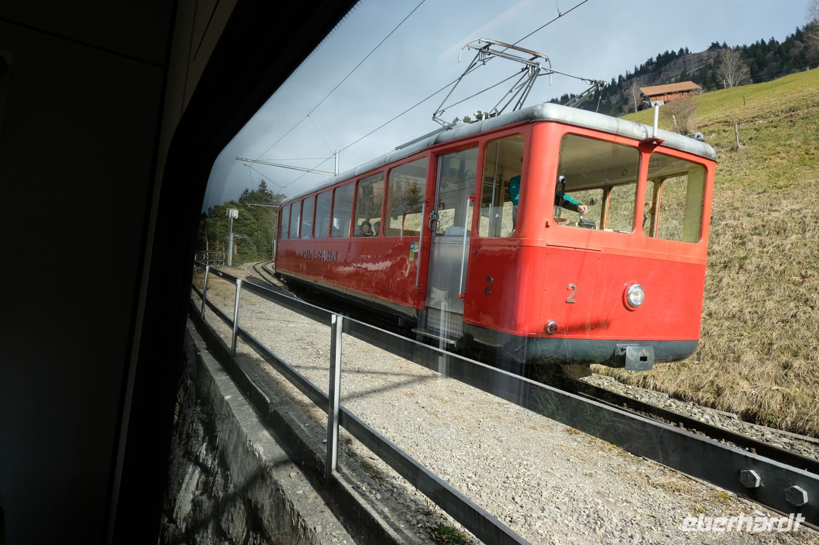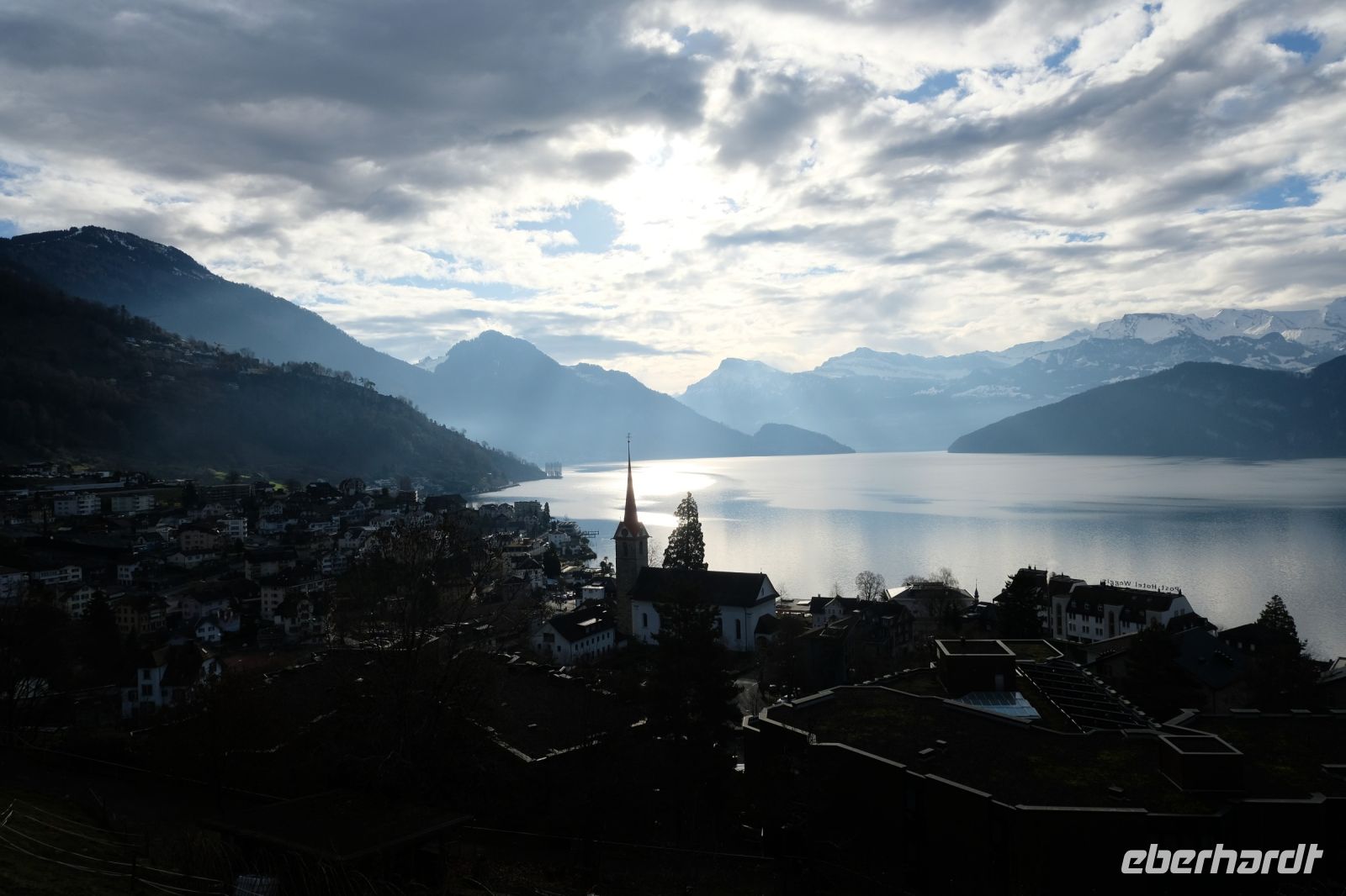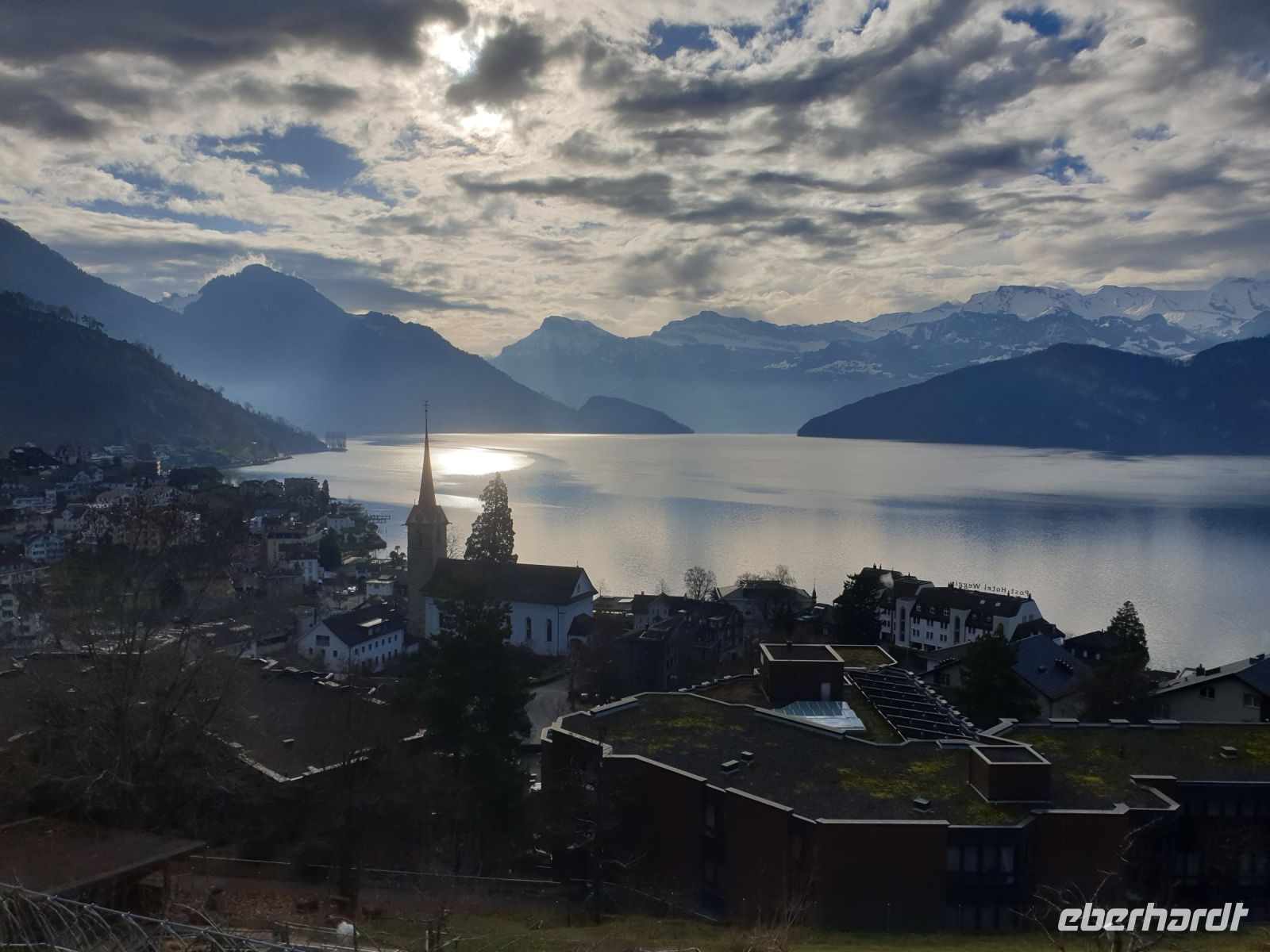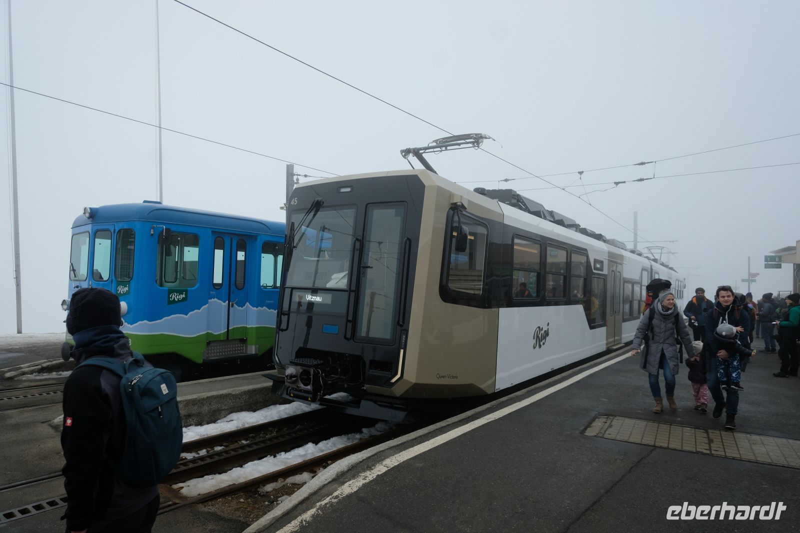 Heute war das Wetter sehr launisch und zwischen kurzem Sonnenschein regnete es auch ab und zu auf der Fahrt nach Vitznau. Zwischendurch machten wir noch 2 Fotostopps am Vierwaldstätter See. In Vitznau angekommen warteten schon die neuen Wagen der Rigi-Bahn um uns auf die Rigi zu fahren. Die Fahrt ging in reichlich 30 Minuten bis auf 1798 m. Auf dem Berg angekommen, erwartete uns ….Nebel. Leider keine gute Gelegenheit den Vierwaldstätter See mit seiner einmaligen Umgebung zu betrachten. Die meisten zog es erst einmal ins Restaurant. Einige Gäste versuchten es mit der Abfahrt nach Rigi-Staffel, um von dort eine bessere Sicht auf den See zu haben. Schließlich brachte uns der Elektrozug wieder zurück nach Vitznau. Anschließend reisten wir Richtung Luzern mit Halt in Küssnacht an der Hohlen Gasse. Wir legten einen kurzen Informationsstopp ein. Im Info-Pavillon hörten wir die Tell-Geschichte. Anschließend fuhren wir vorbei an der Astrid-Kapelle wieder zurück zum Hotel. Zum Abendessen überraschte uns die Küche wieder mit einem schmackhaften Abendessen. Nach diesem ereignisreichen Tag war die Bettschwere bei allen schnell erreicht.