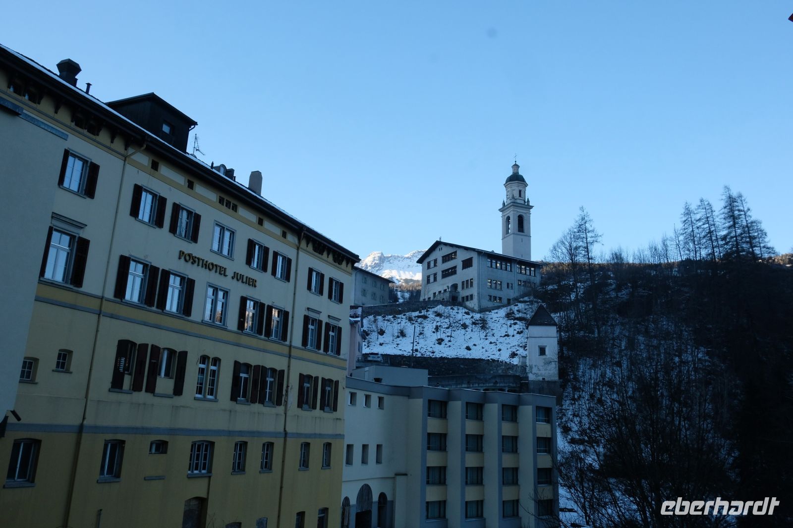 Nach dem Frühstück spazierten wir zum Bahnhof. Von dort fuhren wir mit dem Bernina-Express mit Fotostopp bis nach Tirano. In Alp Grüm hielt der Bernina Express länger und wir hatten hier Gelegenheit, auszusteigen und zu fotografieren. Der herrliche Sonnenschein und der schnell schmelzende Schnee luden zu farbenfrohen Fotos ein. Am Kreisviadukt Brusio erleben wir die hohe Kunst der Eisenbahntechnik, denn hier ermöglicht das angelegte Viadukt eine künstliche Streckenausweitung auf engsten Raum, damit die Bahn den Höhenunterschied meistern kann. In Tirano verließen wir den Zug und gingen zum Busbahnhof. Dort wartete unser Busfahrer Jan bereits, und so konnten wir sofort in Richtung St. Moritz zurückfahren. Bei einem kurzen Fotostopp am Viadukt von Brusio konnten wir sogar einen vorbeifahrenden Zug fotografieren. Am Bernina-Pass machten wir Mittagspause. In St Moritz hatten wir Gelegenheit einen Spaziergang zu unternehmen und einige Sehenswürdigkeiten kennenzulernen. Die Sonne schien, und so konnten wir St. Moritz genießen. Zurück ging unsere Fahrt über der Julierpass, auf dem wir nochmals einen Fotostopp einlegten, weiter nach Tiefencastel. Zum Abendessen wurde uns wieder ein reichliches 4-Gang-Menü von freundlichen Mitarbeitern gereicht, was den gelungenen Tag abrundete.