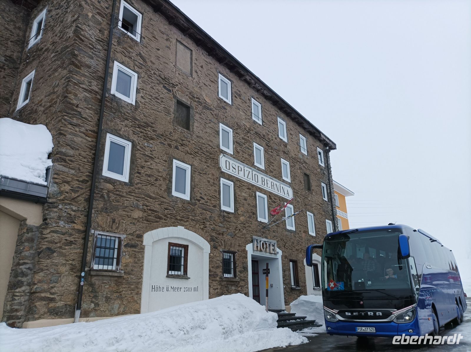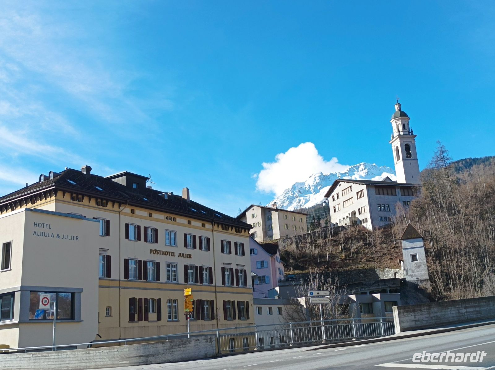 Nach dem Frühstück spazieren wir zum Bahnhof Tiefencastel und warten auf den Bernina-Express. Nach einer Verspätung und einem „hin und her“ erreichen wir unsere reservierten Plätze. Die Fahrt kann beginnen. Beeindruckend ist die Albula Strecke, bevor wir nach Pontresina kommen. Weiter geht die beeindruckende Bahnfahrt hinauf zum Berninamassiv. Beim Lago Bianco haben wir noch einmal einen schöne Blick in die Berge und fahren dann ca. 2.200 Meter hinab ins Puschlav und über den berühmten Kreisviadukt von Brusio. In Tirano endet die Bahnfahrt und Andreas wartet schon auf uns. Zurück fahren wir mit dem Bus und erleben den Winter in den Bergen sehr deutlich. Auf dem Berninapass (2.328 m) haben wir die Möglichkeit kurz zu halten und am Morteratsch-Gletscher nutzen wir die Chance für ein Foto. So langsam endet unsere Passfahrt und wir fahren nach St. Moritz. Am Bahnhof von St. Moritz beginnen wir mit einem Spaziergang. Unser Weg führt uns durch das 2004 fertiggestellte Parkhaus Serletta. Als Erstes blicken wir auf den See, der nur teilweise zugefroren ist, er lässt erahnen, dass das berühmte Pferderennen „White turf“ auf dem See vorbei ist. Im „Dorf“ angekommen, stehen wir vor dem Badrutt’s Palace Hotel. Vorbei an den Boutiquen erreicht man noch einen Rest des eigentlichen Dorfes und der schiefe Turm, Wahrzeichen des Ortes, ist Rest der 1980 abgebrochenen Mauritius Kirche. Ein jeder nutzt die Zeit für sich, bevor wir wieder mit dem Bus nach St. Moritz Bad und weiter zum Julierpass(2284 m)fahren. Nach dem Pass fahren wir durch das Oberhalbstein(rätoromanisch Surses), das 23 km lange Tal des Flusses Julia, um wieder nach Tiefencastel zu kommen. Ein leckeres Abendessen im Hotel rundet den schönen Tag ab.