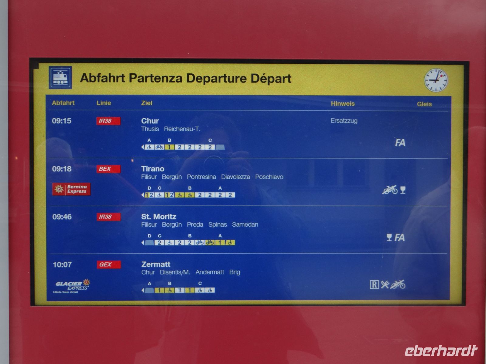 Um 8.30 Uhr brechen wir auf, um gemächlich den Anstieg zum Bahnhof zu nehmen. Heute fahren wir mit dem Bernina Express von Tiefencastel über den Berninapass nach Tirano. Die wichtigste Frage heute ist jene nach der richtigen Kleidung. Denn im italienischen Tirano kann es freundlich sein, in St. Moritz hingegen, das wir am Nachmittag aufsuchen werden, lagen die Temperaturen um die null Grad in den letzten Tagen. Wir werden sehen, ob wir gut gepackt haben.