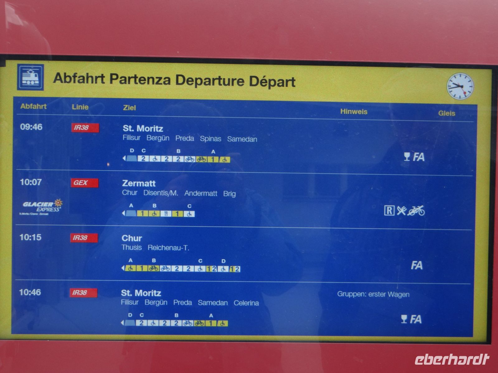 Die Strecke, die wir vor zwei Tagen mit dem Bus genommen hat, sieht vom Zug noch spektakulärer aus. Wir sitzen wieder im letzten Wagon, der noch schicker ist als jener gestern. Dabei sind alle Züge und Wagons picobello. Die zweite Klasse geht locker auch als erste Klasse durch. Und jeder Platz ist mit Kopfhörern ausgestattet, über die wir sehr interessante Informationen bekommen. Die Bahnfans kleben schon wieder am Ende des Zuges und die Türen haben nun den unschlagbaren Vorteil, dass man ihre kleinen Fenster öffnen und gute Fotos schießen kann. Das Rheintal ist bald erreicht, wir fahren in Chur ein, wo wir vom Ende des Zugs an den Anfang kommen – der Zug wechselt die Richtung.