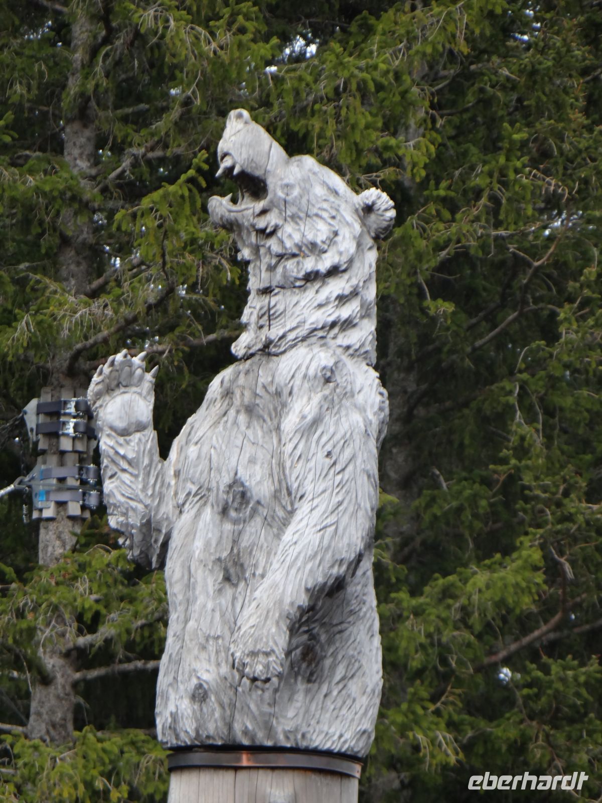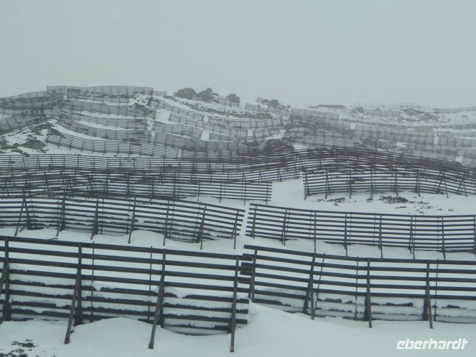 Heiko, der Unerschüttliche, und sein Bus mit Maja und Willi, durchpflügen die Eiswüste nun auf der anderen Seite des Berges. Die „Guccihandtasche“ winkt, ein für den Unkundigen vertrautes Zeichen, dass wir auf der richtigen Spur sind. Denn die Gondel haben wir auf dem Hinweg gesehen. Wir erreichen die Baumgrenze, es wird wieder wirtlicher, aus der Winterwüste wird wieder ein Wintermärchen.