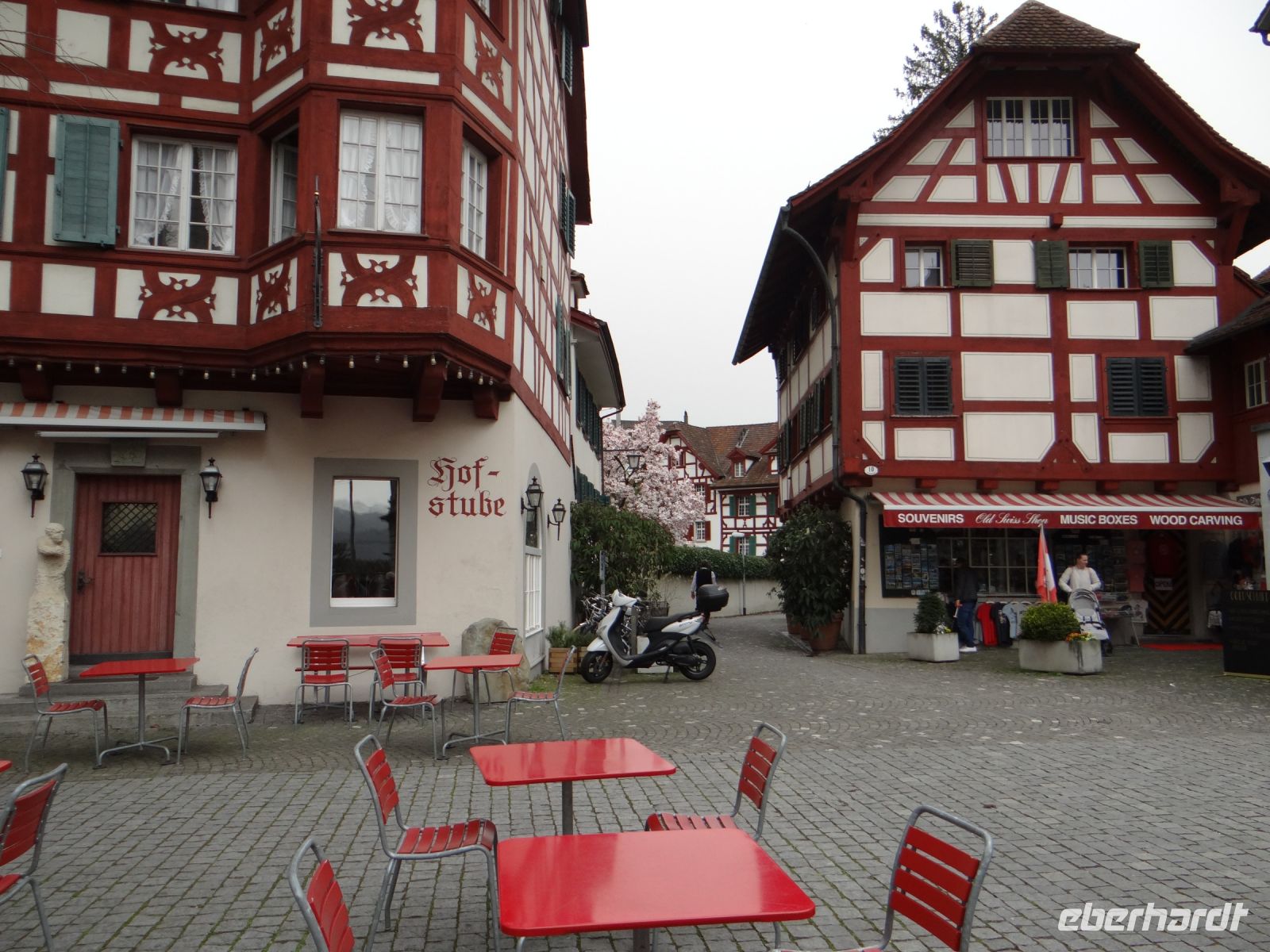 Nun geht es nach Küssnacht am Rigi, an der Hohlen Gasse steigen wir aus. Hier hat Wilhelm Tell den Tyrannen Gessler erschossen, von hier ging gewissermaßen die Freiheitsbewegung der Schweizer aus. Die Gasse ist rekonstruiert worden im besten Sinn. Denn zunächst gab es einen Asphaltbelag und da er schon mal da war, wollte man die Straße darüber führen. Zum Glück haben sich die Bürger dagegen gewehrt, eine Schule hat eine Spendenaktion durchgeführt und der Weg wurde, wie man ihn sich für die damalige Zeit vorstellt, wieder hergestellt. Er liegt wie ein Bühnenbild vor uns und windet sich leicht bergauf zu einer kleinen Kapelle. Nachdem wir wieder nach unten gelaufen sind, informiert eine hübsch gemachte Präsentation über den Weg, der ein wichtiges Stück auf einem langen Handelsweg von Süddeutschland nach Italien war. Es war damals leichter, die Waren über den Vierwaldstätter See zu fahren, denn die Hänge waren zum Teil unpassierbar.