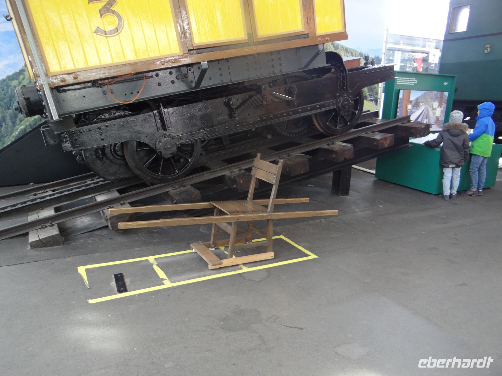 Wir fallen fast vom Bus in die Zahnradbahn. Und einen Schritt weiter könnte man das Schiff besteigen. So nah ist alles beieinander. Es ist ruhig an der Bahn, eine Gruppe hat abgesagt und so können wir uns im Abteil ausbreiten. Der Zug ist gerade zwei Jahre alt. Das Beste ist die Holzliege neben dem Führerstand. Wir haben sie für uns alleine und blicken den Schienen und der Landschaft nach.