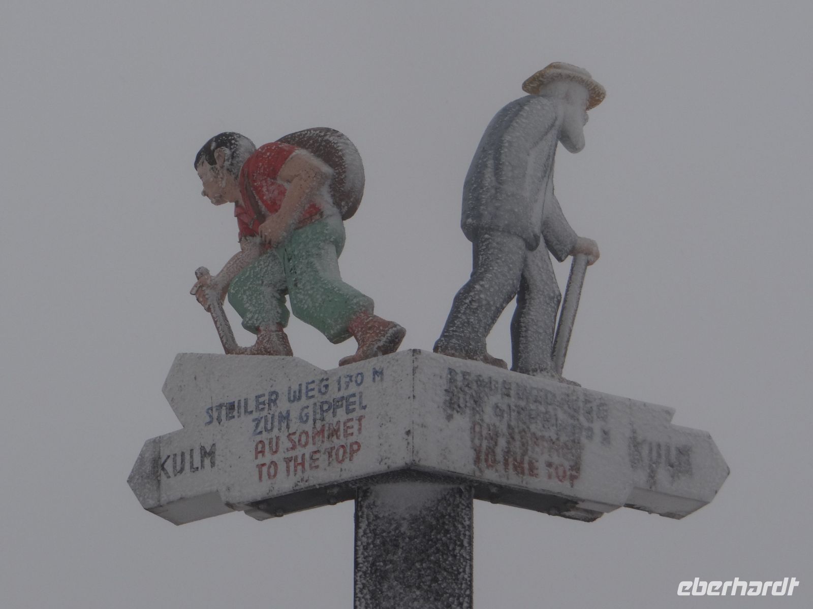Es geht durch den Frühling, Obstbäume blühen, Tulpen, Osterglocken, Hyazinthen, die Wiesen sind sattgrün. Dann verlieren wir uns in den Wolken und dann kommt der Schnee. Das erinnert an unseren zweiten Tag mit dem Bernina Express. Wir nehmen es gelassen, steigen auf Rigi-Kulm aus, um gleich zu entscheiden, dass wir um 12 und nicht um 13 Uhr wieder runterfahren. Zum Glück geht das, obgleich dann nur ein Wagen fährt anstatt zwei. Die Tapferen unter uns erklimmen den Gipfel, dessen Aussicht genauso weiß ist wie ein paar Meter weiter unten. Der Schnee knirscht unter den Schuhen. Einige Spaßvögel haben eine Minischneemann auf den Holztisch vor dem Bistro gesetzt.