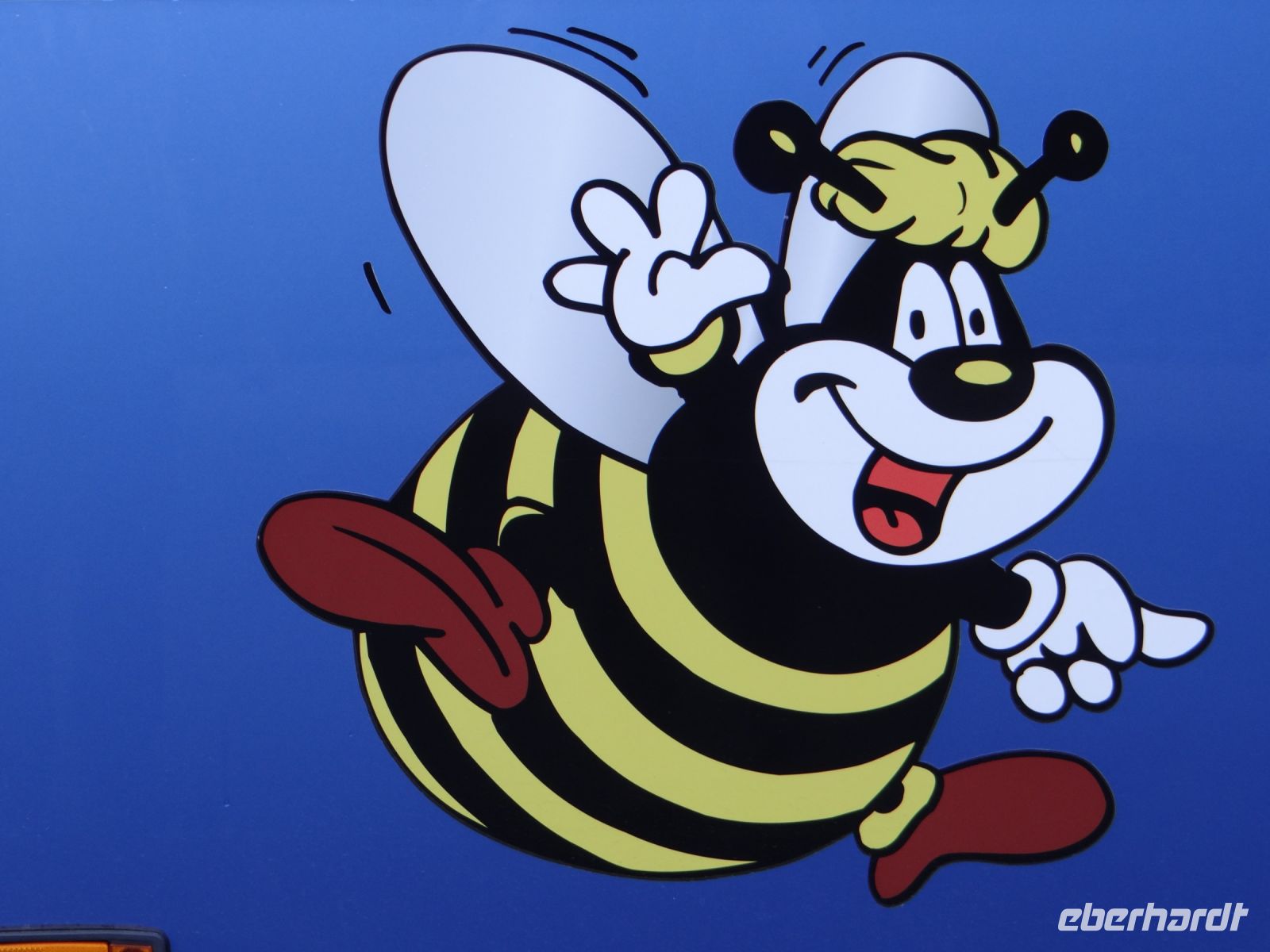 Das rote Gondelbähnchen bringt uns wieder sanft nach unten. Unser lilafarbener Bus mit Maja und Willi und ihren Bienenfreunden leuchtet von unten herauf. Angekommen!