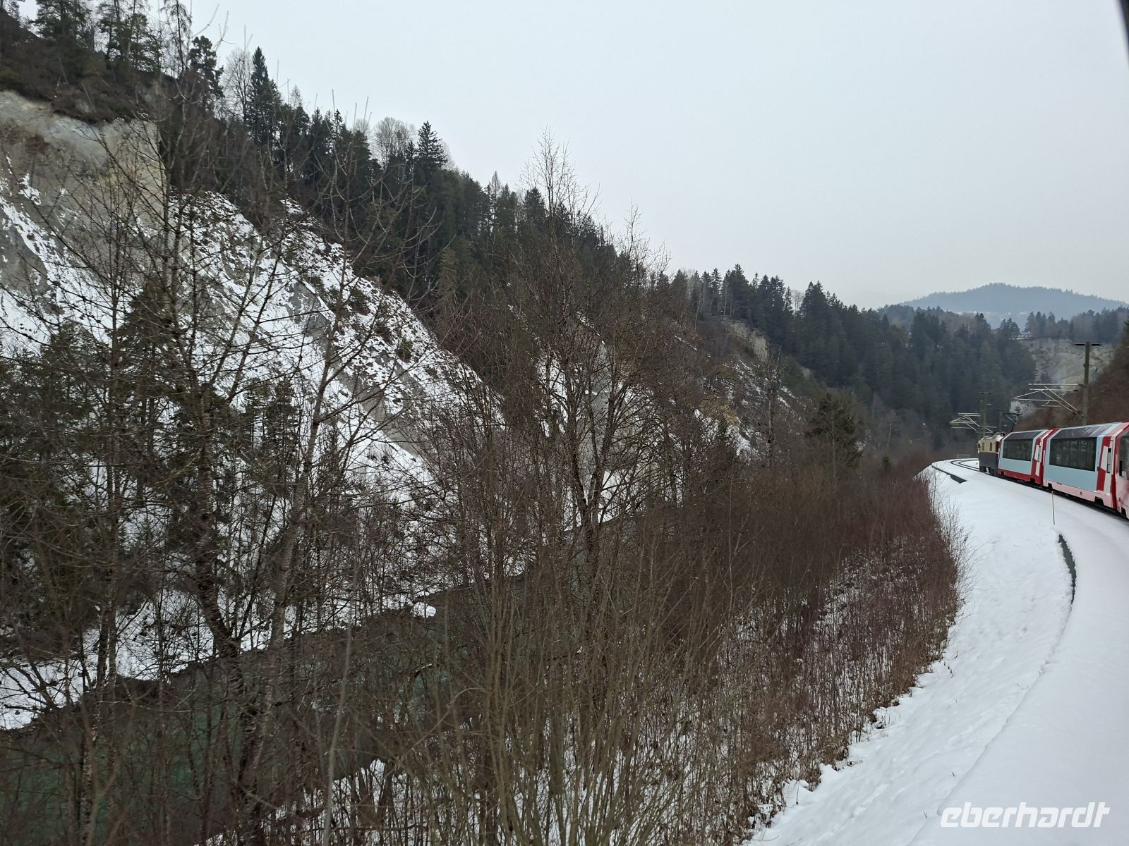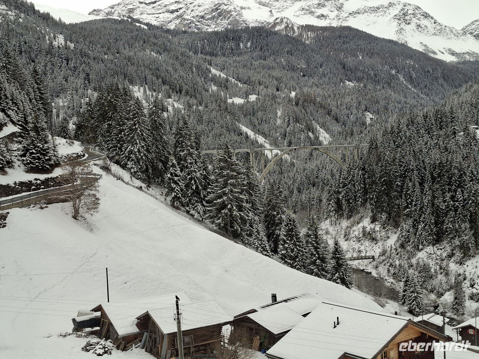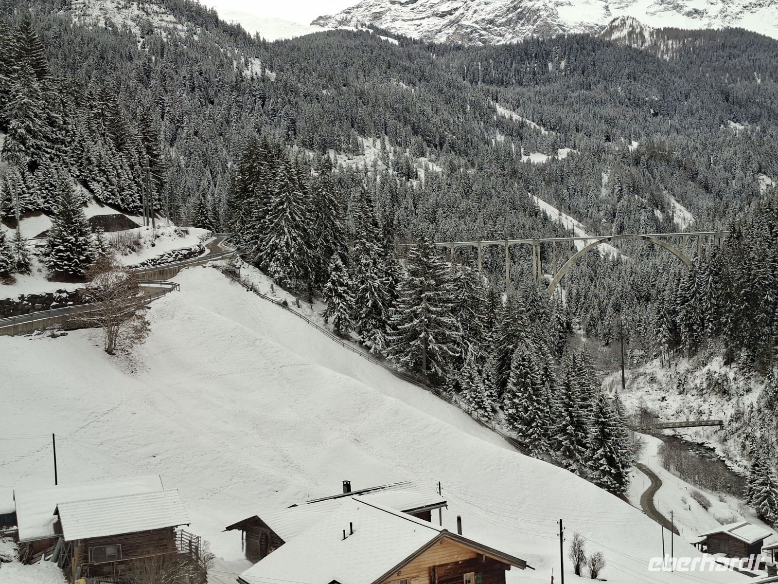 Zunächst hieß es am Morgen Koffer packen, denn unsere Reise führte uns nun weiter in die Ostschweiz, nach Graubünden. Entlang der Südseite des Vierwaldstättersees erreichten wir nach kurzer Fahrzeit das Städtchen Altdorf. Hier legten wir einen Halt am berühmten Tell-Denkmal ein. Die Bronzestatue zeigt Wilhelm Tell mit seinem Sohn Walter und erinnert an den legendären Freiheitshelden der Schweiz. Gleich daneben befindet sich das sogenannte „Türmli“, ein mittelalterlicher Wehrturm, der einst Teil der Stadtbefestigung war und heute das historische Ambiente des Platzes unterstreicht. Anschließend setzten wir unsere Fahrt über die alte Gotthardstraße fort. Entlang der Reuss ging es durch die eindrucksvolle Schöllenenschlucht mit ihren steilen Felswänden und tosenden Wassermassen hinauf nach Andermatt. Leider zeigte sich das Wetter an diesem Tag von seiner trüben Seite – dichte Wolken und schlechte Sicht ließen nur erahnen, wie spektakulär diese Landschaft bei Sonnenschein sein muss. In Andermatt erfolgte der Umstieg in den berühmten Glacier Express, einen der bekanntesten Panoramazüge der Welt. Mit seinen großen Fenstern bietet der langsamste Schnellzug der Welt atemberaubende Ausblicke auf die alpine Bergwelt. Trotz des winterlichen Wetters war die Fahrt ein besonderes Erlebnis. Über den schneebedeckten Oberalppass führte die Strecke hinab nach Disentis ins Vorderrheintal. Weiter ging es durch die eindrucksvolle Rheinschlucht, den sogenannten „Swiss Grand Canyon“, bis nach Chur. Von dort brachte uns der Zug weiter nach Filisur, wo bereits unser Bus auf uns wartete. Nach kurzer Fahrt erreichten wir schließlich unser Hotel „Albula & Julier“, das für die kommenden drei Nächte unser gemütliches Domizil in Graubünden sein sollte.