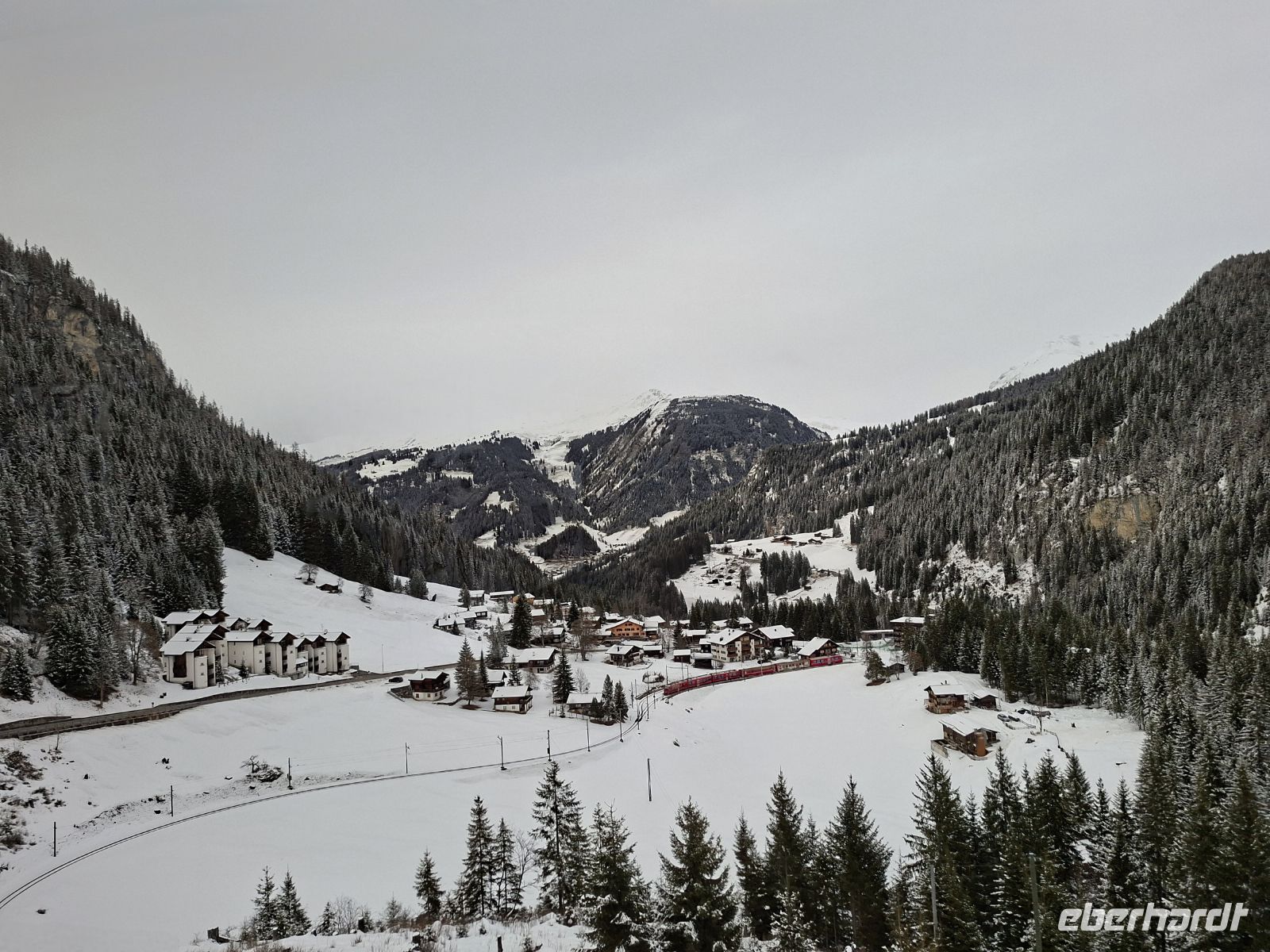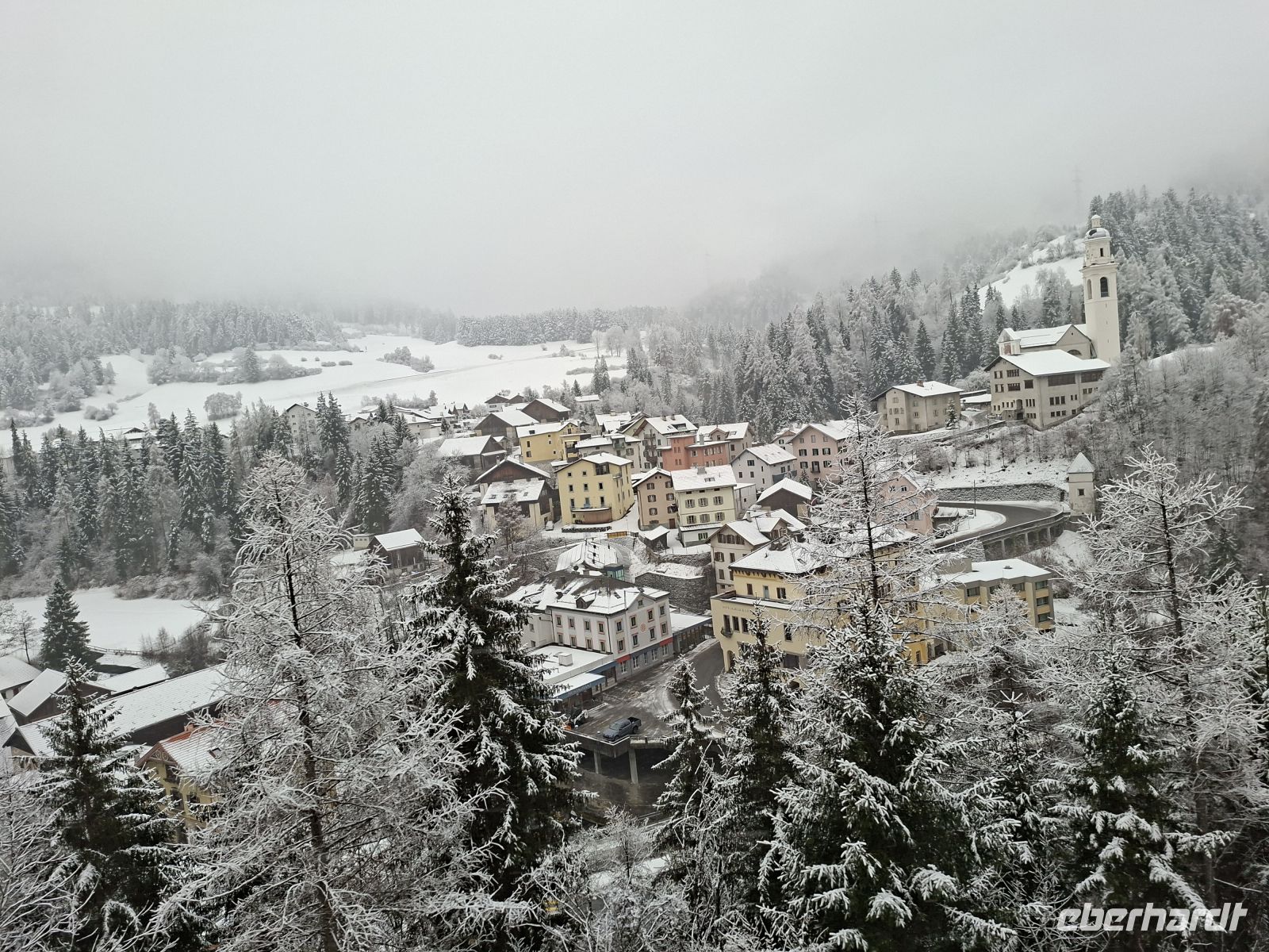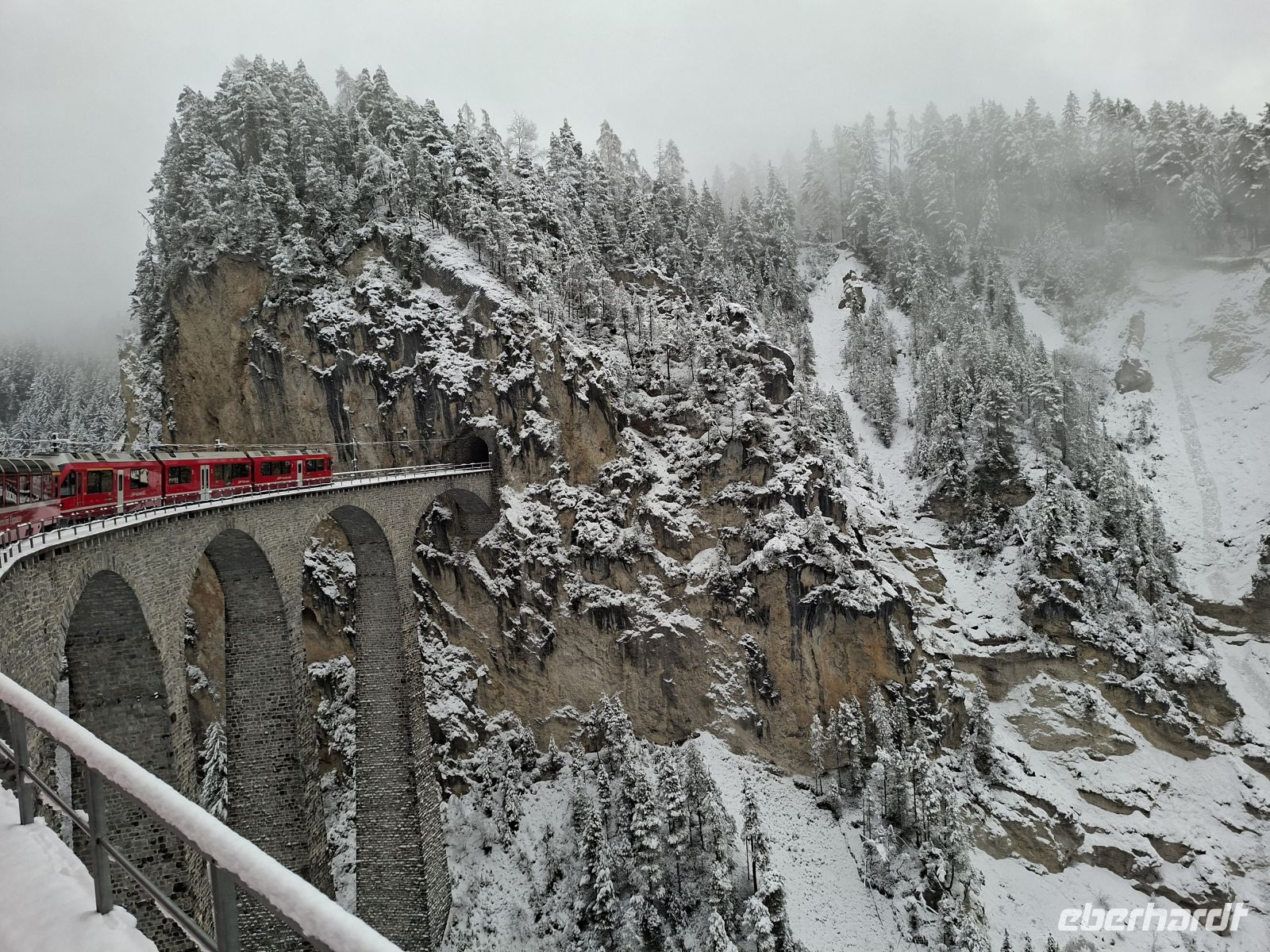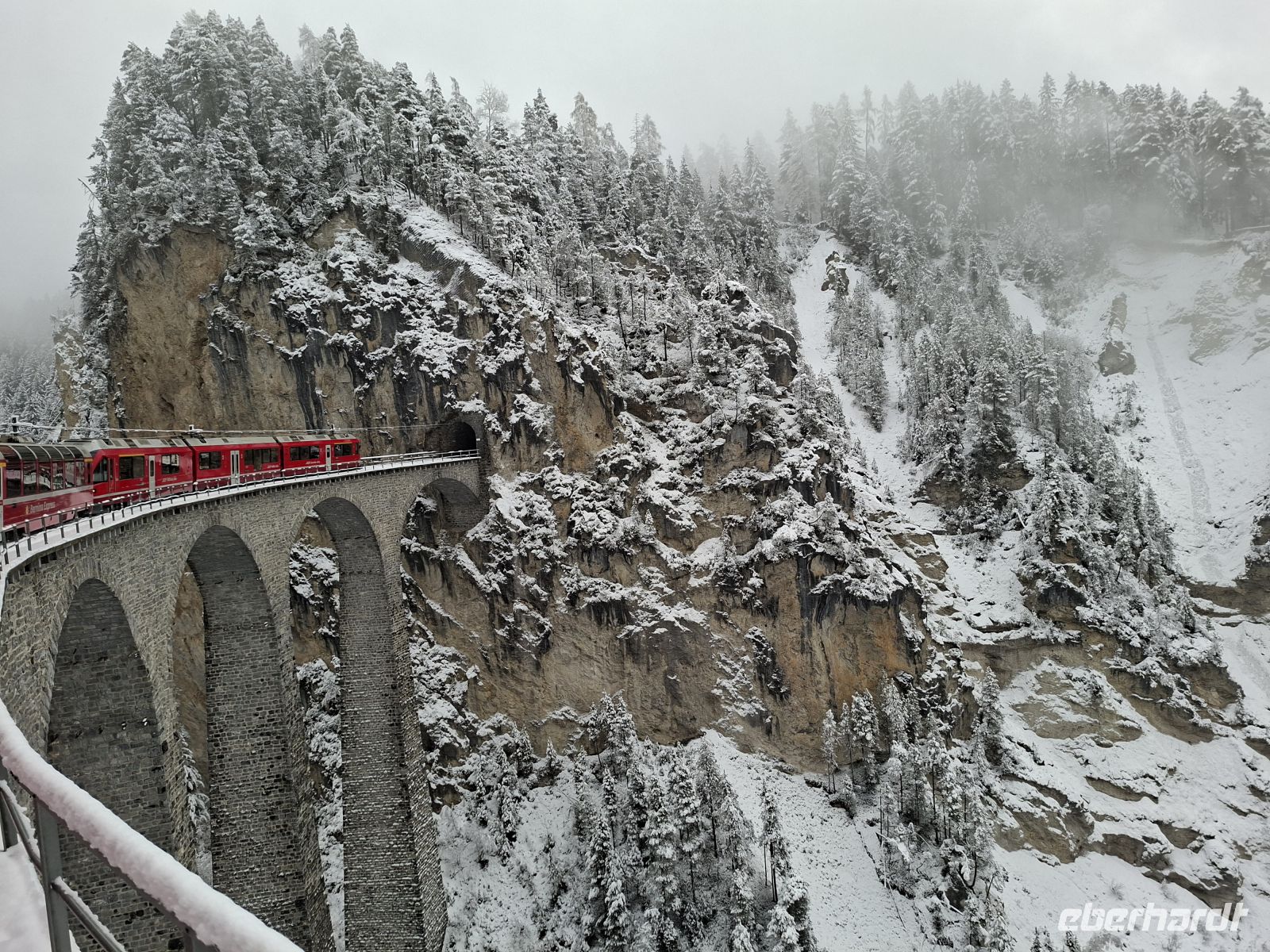 Zunächst hieß es am Morgen Koffer packen, denn unsere Reise führte uns nun weiter in die Ostschweiz, nach Graubünden. Entlang der Südseite des Vierwaldstättersees erreichten wir nach kurzer Fahrzeit das Städtchen Altdorf. Hier legten wir einen Halt am berühmten Tell-Denkmal ein. Die Bronzestatue zeigt Wilhelm Tell mit seinem Sohn Walter und erinnert an den legendären Freiheitshelden der Schweiz. Gleich daneben befindet sich das sogenannte „Türmli“, ein mittelalterlicher Wehrturm, der einst Teil der Stadtbefestigung war und heute das historische Ambiente des Platzes unterstreicht. Anschließend setzten wir unsere Fahrt über die alte Gotthardstraße fort. Entlang der Reuss ging es durch die eindrucksvolle Schöllenenschlucht mit ihren steilen Felswänden und tosenden Wassermassen hinauf nach Andermatt. Leider zeigte sich das Wetter an diesem Tag von seiner trüben Seite – dichte Wolken und schlechte Sicht ließen nur erahnen, wie spektakulär diese Landschaft bei Sonnenschein sein muss. In Andermatt erfolgte der Umstieg in den berühmten Glacier Express, einen der bekanntesten Panoramazüge der Welt. Mit seinen großen Fenstern bietet der langsamste Schnellzug der Welt atemberaubende Ausblicke auf die alpine Bergwelt. Trotz des winterlichen Wetters war die Fahrt ein besonderes Erlebnis. Über den schneebedeckten Oberalppass führte die Strecke hinab nach Disentis ins Vorderrheintal. Weiter ging es durch die eindrucksvolle Rheinschlucht, den sogenannten „Swiss Grand Canyon“, bis nach Chur. Von dort brachte uns der Zug weiter nach Filisur, wo bereits unser Bus auf uns wartete. Nach kurzer Fahrt erreichten wir schließlich unser Hotel „Albula & Julier“, das für die kommenden drei Nächte unser gemütliches Domizil in Graubünden sein sollte.