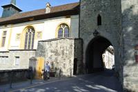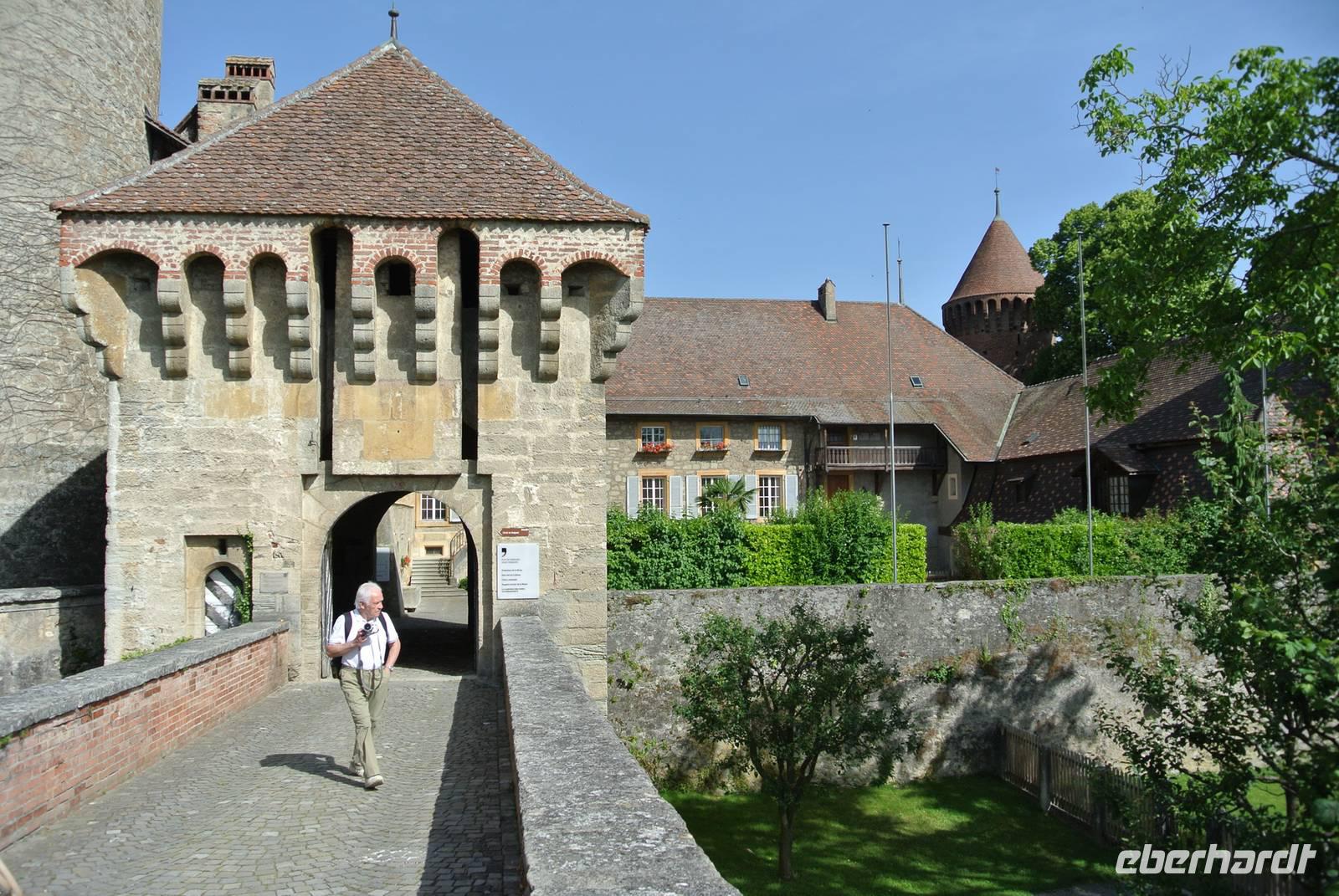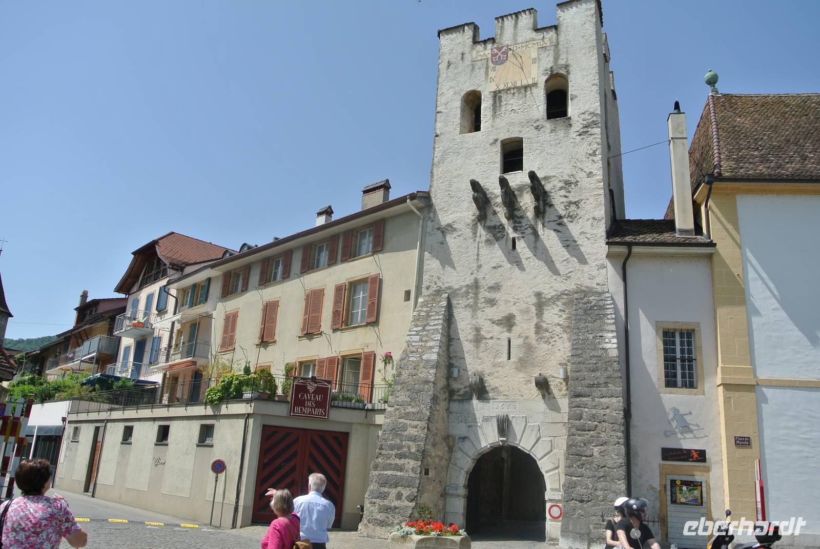 Um 08:15 Uhr fuhren wir nach Estavayer le Lac, wo wir um 09:10 Uhr auf einem Parkplatz vor einem Einkaufszentrum nahe der Stadtmauer ankamen. Wir machten einen Spaziergang zum Stadttor, an dem wir uns mit unseren sehr kompetenten, deutschsprechenden Stadtführer, Max Wehrle trafen. Einem Schweizer wie er im Buche steht.