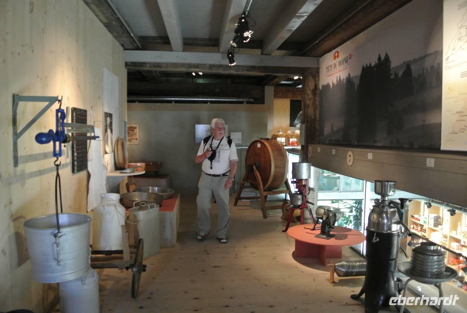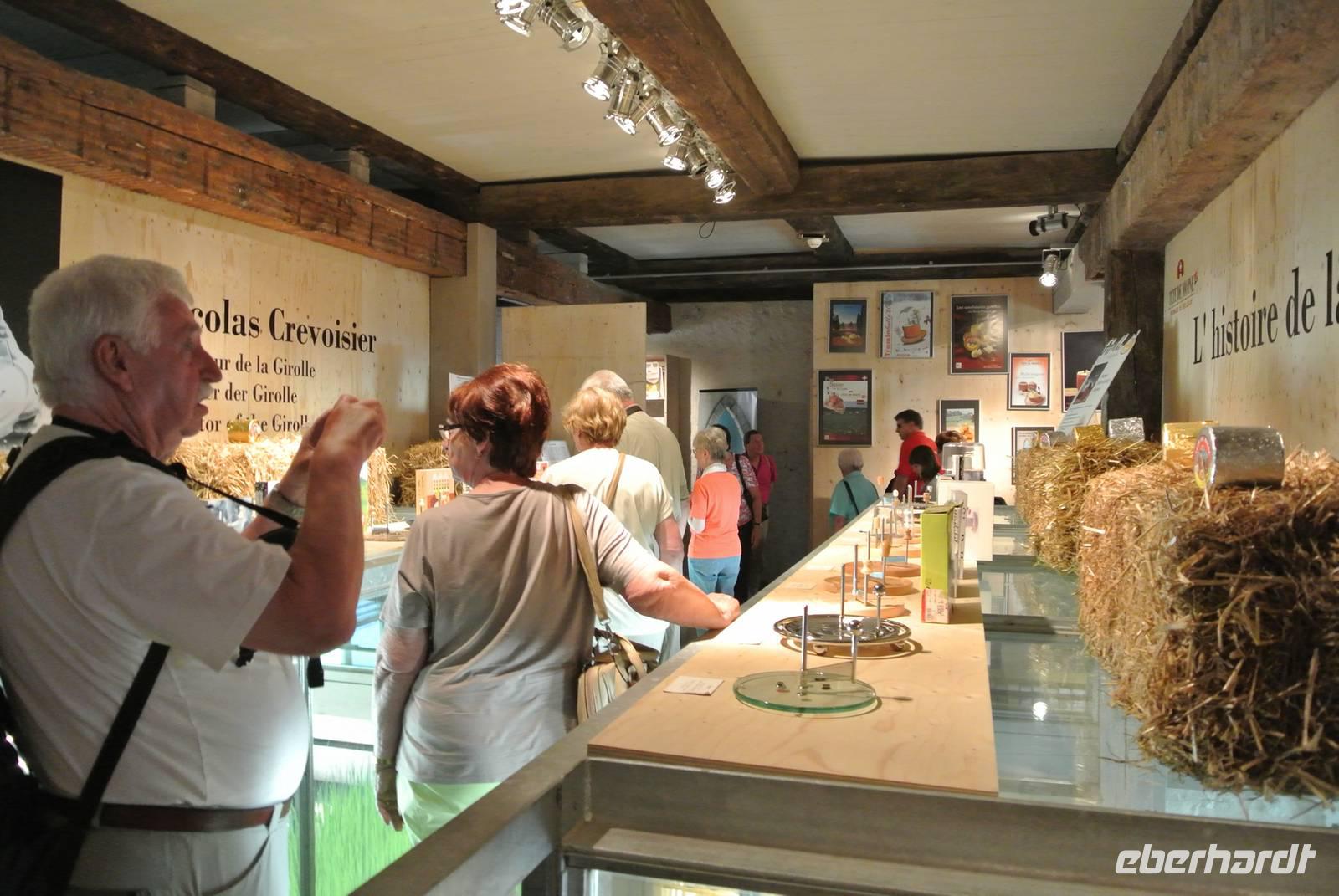 Von 12:15 - 13.15 Uhr erklärte uns ein Käsemeister die Geschichte und die Herstellung des „Tete de Moine" Käses. („Mönchkopf-Käse"). Danach unternahmen wir eine Führung durch die Ausstellung der Käserei mit vielen verschiedenen Käsehobeln. In einer abschließenden Verkostung in einem speziellen Probierraum, konnten wir den besonderen Käse mit Wasser und Brot - aber vorzugsweise auch mit dem ebenfalls offerierten guten Wein - ausgiebig probieren.