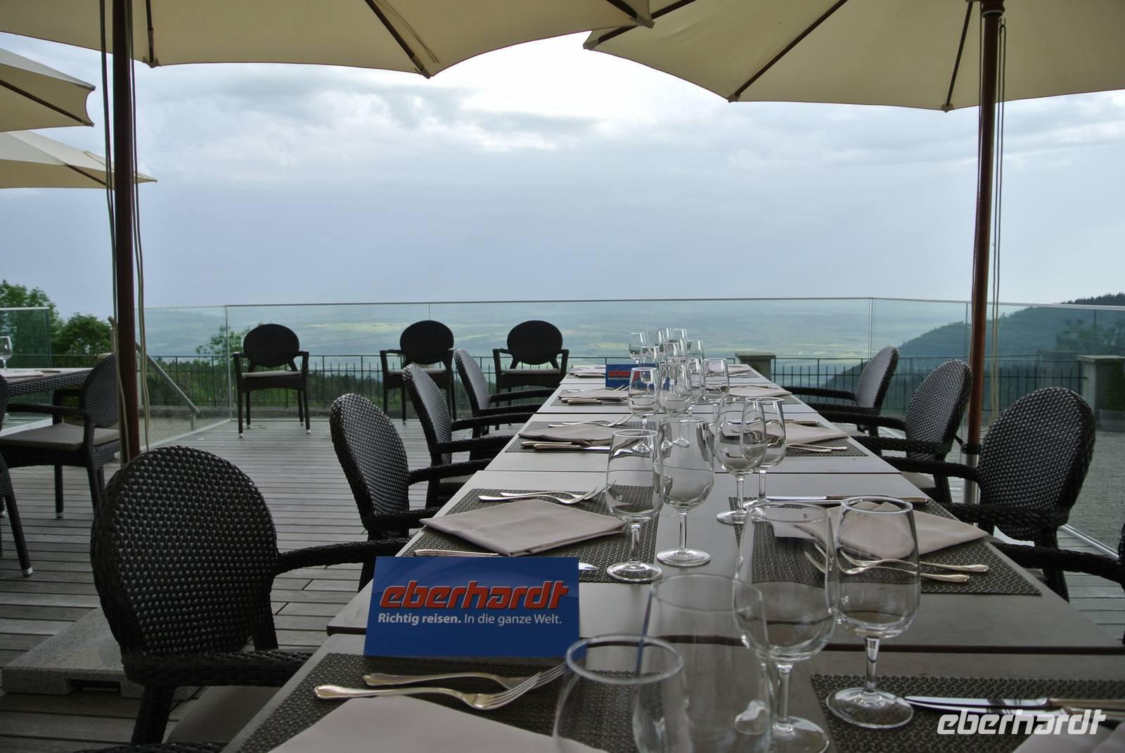 Das 3-Gänge Menü war aber gut und schmackhaft. Um ca. 22:15 Uhr genossen wir dann aber die tolle Atmosphäre des Hotels und die herrliche Berg- und Talsicht bei angenehmen Temperaturen von der sehr schönen Terrasse.