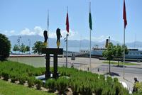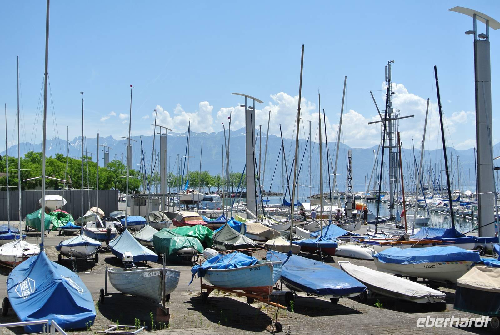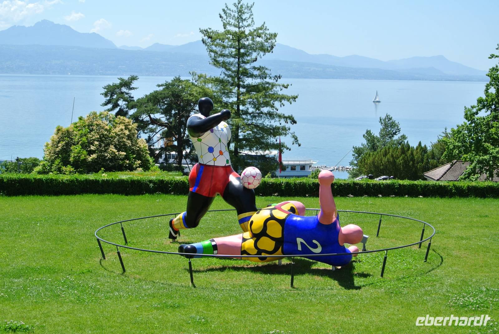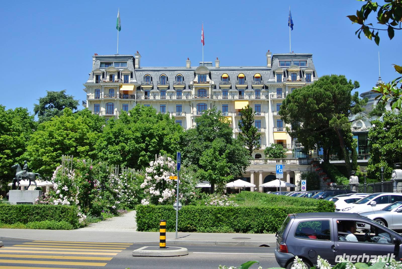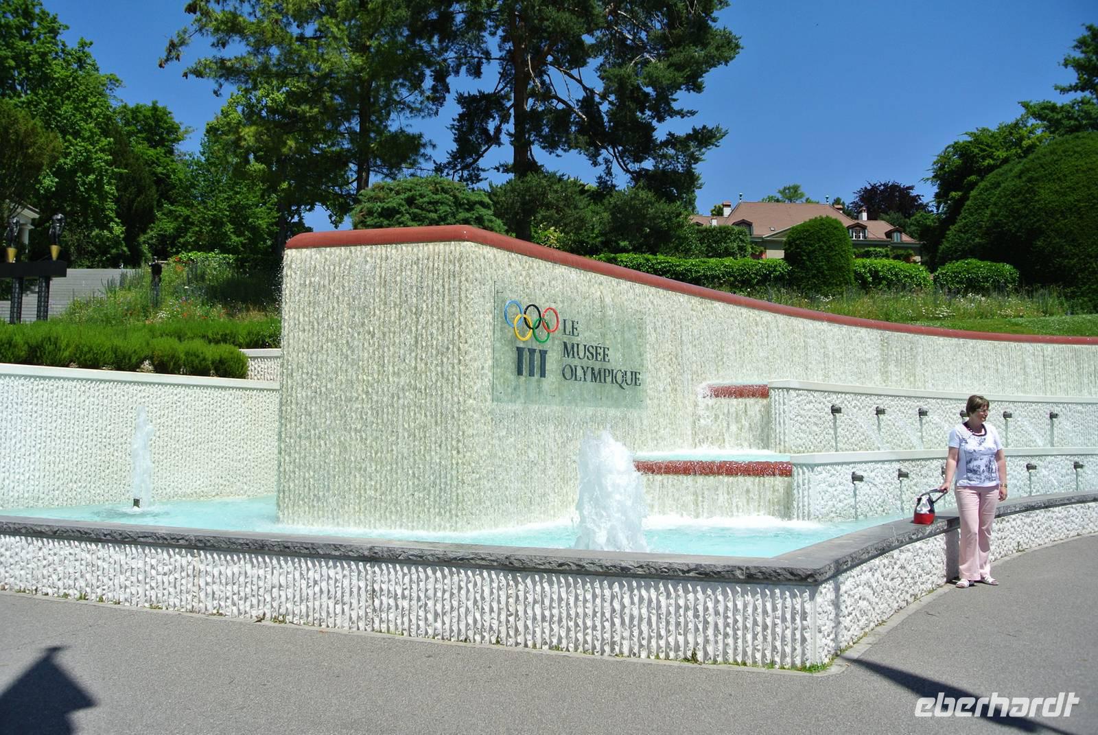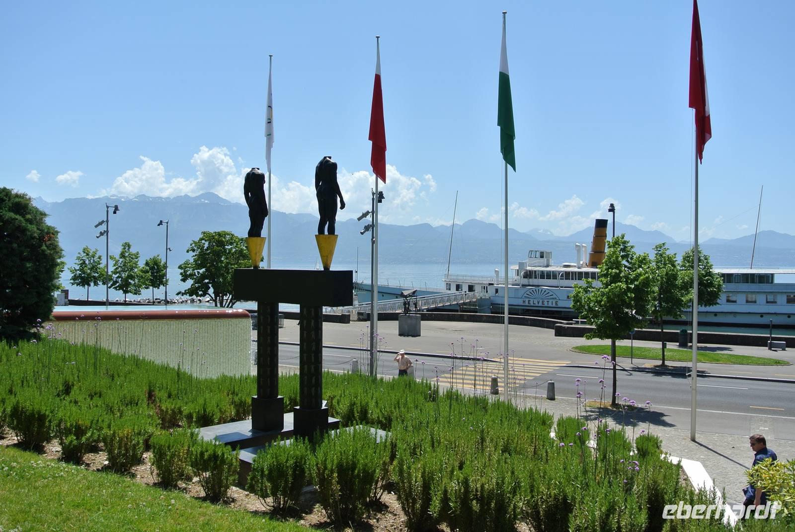 Dort machten wir bis 13:55 Uhr einen sehr interessanten Spaziergang durch die Parkanlage auf die Ausschichtsterrasse des Museums, wo wir nochmals die schöne Aussicht auf die Seepromenade und den Genfer See mit seiner grandiosen Bergkulisse genossen. Nach einem Aufenthalt vor bzw. in der Vorhalle des olympischen Museums, gingen wir auf der herrlichen 2, 5 Km langen Uferpromenade entlang und an mondänen Hotels, Restaurants, Yachthäfen etc. vorbei zum Busparkplatz Ouchy.