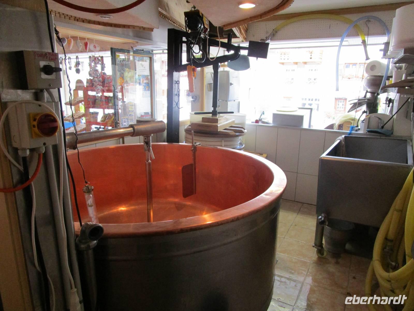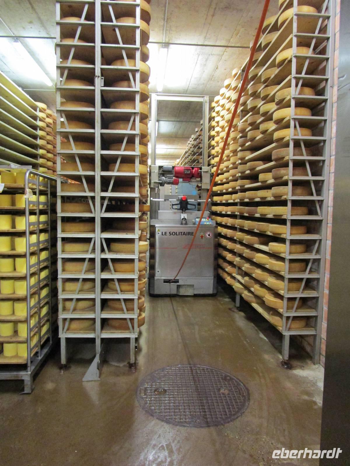 Wieder fahren wir in einem Längstal des Jura. 2 große LKW, mit Heu beladen, fahren vor uns her. Ein Überholen ist auf der engen, kurvenreichen Strecke schwierig. Aber die Fahrer finden eine Lücke und lassen uns passieren. In der Nähe von La Chaux-de-Fonds herrscht Nebel, der Blick auf die Alpenkette vom Gasthof Vue des Alpes ist heute erst recht nicht möglich. In St.Imier finden wir unsere Käserei. Es ist ein Familienbetrieb, 7 des 25 Beschäftigten gehören der Spielhofer-Famile an. Der Juniorchef führt uns durch die Produktionsanlagen und zu den Reifekellern. Schaukäsereien bieten oft nur Einblicke durch Glasscheiben. Nicht hier. Wir müssen uns allerdings hygienegerecht verkleiden. Die Ausführungen des Juniorchefs sind sehr ausführlich, auch er spricht ein nettes Schwizerdütsch gefärbtes Hochdeutsch. Hauptproduktion ist der im nahen Kloster Bellelay erfundene Tete de Moin. Der „Mönchskopf" verdankt seine Entstehung einem naschhaften Mönch, der heimlich vom Käse dünne Stückchen abraspelte und dabei feststellt, dass der Geschmack dadurch noch besser war. Dann wurde das rotierend Messer, die Girolle erfunden, die kleine Röschen vom Laib abdreht. Ein Potpourri von verschiedenen Käsen und ein Glas Chasselas schloss die Veranstaltung ab. Betriebsführungen können schön sein.