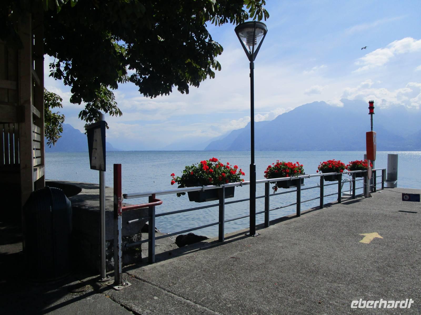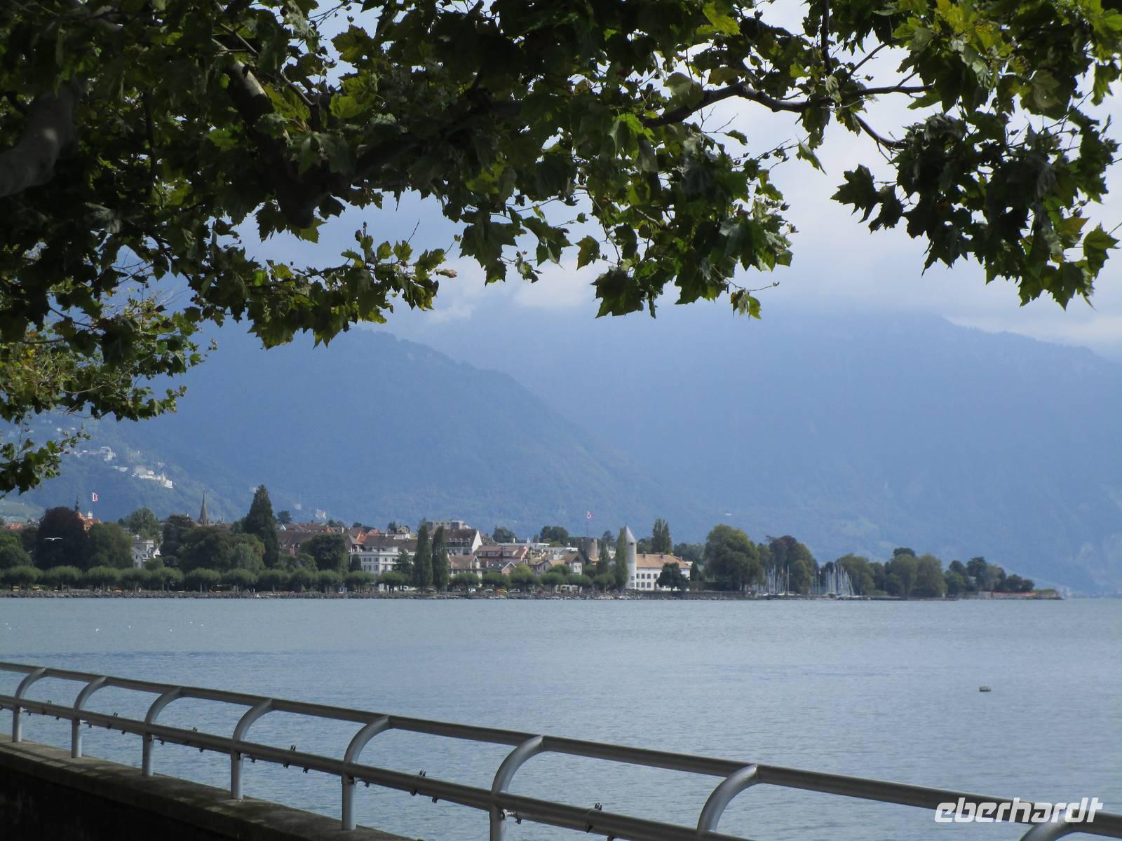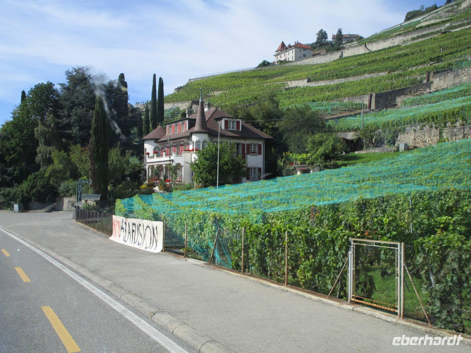 Wir haben noch etwas Zeit, um unsere Rückreise auf das Ufer der Lac Léman ausdehnen zu können. Bei strahlendem Sonnenschein bummeln wir über die Uferpromenade von Vevey, dem Ort, in dem Charlie Chaplin 25 Jahre bis zu seinem Tode verbrachte, nachdem er aus den USA ausgewiesen worden war. Bei der Weiterfahrt sehen wir auch das Hauptquartier von Nestlé. Nach dem Weinbau am Neuenburger See und dem Bielersee sehen wir auch hier Weinbergterrassen. Es ist das berühmte Anbaugeiet von Lavaux. Wir fahren durch kleine Weindörfer. Auf der anderen Seite des „größten Sees" der Schweiz türmen sich die Savoyer Alpen auf. Dort ist Frankreich, dass zwei Fünftel des Seeufers belegt. Über Lausanne kommen wir dann wieder nach Yverdon und Les Rasses. Am Abend unternehmen wir eine Fahrt mit Kleinbussen zur Alp Suchet. Am Anfang war gar nicht so recht einzusehen, dass wir unseren Bus nicht benutzten. Aber dann wurden die Wege sehr eng, der Wald lichter und auf 1486 m Höhe erreichten wir eine Berggaststätte, die ein bekanntes Ziel im Jura darstellt. Es ist nicht nur die Sicht in Richtung Genfer See und Savoyen - die leider ausfiel - es ist auch das vorzügliche Käsefondue, die die Ausflügler anzieht. 2 Sorten Gruyére- und ein Vacherin-Käse werden vorher aufgeschmolzen und über kleine Brenner auf Temperatur gehalten. Dann taucht man auf eine Gabel aufgespießtes Brot in die Masse, einige Umdrehungen und schon ist der Leckerbissen fertig. Ein schöner Abschluss des Tages.
