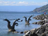 Der Tagesausflug beginnt am Neuenburger See. Am Südende des 218 km² großen Sees liegt die Stadt Yverdon, die später den Zusatz „les-Bains" - Bäderstadt erhielt. In der Stadt waren Kelten und Römer, aber wir werden noch sehen, die Besiedlung ist schon viel eher erfolgt. Im Mittelalter war der Ort bedeutender Umschlagsplatz für Salz aus der Freigrafschaft Burgund, das über den Neuenburger See weiterverschifft wurde. Jeannine Dufour führt uns durch die kleine Altstadt und zeigt uns auch Innenhöfe, die man sonst übersehen hätte. Am Schloss, eine trutzige Burg aus Savoyer-Zeit, steht das Denkmal Pestalozzis, der darin 2 der von ihm gegründeten 4 Schulen einrichtete. In einem Park am Seeufer, der erst nach der Absenkung des Seeniveaus entstand, stehen Menhire in Reihenanordnungen, die vor etwa 6000 Jahren hier aufgestellt wurden.