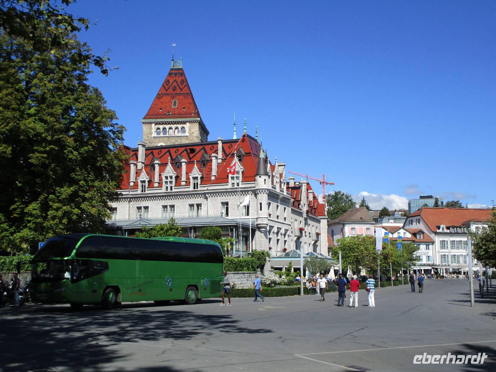 In einer Stadt am Fuße des Gebirges befindet, sondern hoch über dem größten See der Schweiz, dem Neuenburger See. Er ist zwar kleiner als der Lac Leman („Genfer See") und der Bodensee, aber er gehört der Schweiz ganz allein. 1200 m über dem Meeresspiegel hatte der Unternehmer Edouard Baierlé 1898 ein Hotel im Geschmack der Zeit, der Belle Epoque, bauen lassen, in dem die Gäste die klare Höhenluft genießen konnten. Natürlich wurde später viel angebaut, ein weiterer Flügel, eine Schwimmhalle, ein Fitnessraum, eine Aussichtsterrasse. Eine ideale Ausgangsposition für die Ausflüge der nächsten Tage, wenn auch der Buschauffeur bei der Fahrt nach oben über Serpentinen mächtig am Lenkrad drehen muss. Im Belle-Epoque-Saal nehmen wir in aller Ruhe unser Abendessen ein.