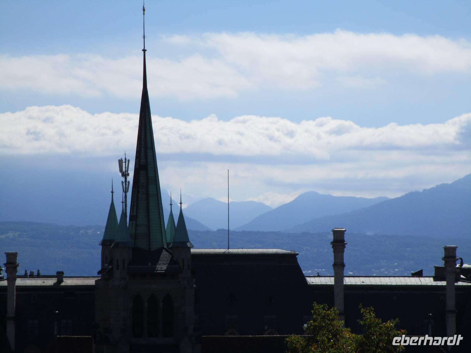 Am Morgen bietet sich ein unvergessliches Schauspiel. Zwar ist die Ebene noch in weißen Wolken verborgen, aber darüber zeichnet sich in einmaliger Klarheit die Kette der Berge ab, darunter ein besonders großer Gipfel in strahlendem Weiß. Wir wollten es erst nicht glauben, aber es war der Mont Blanc, 110 km von hier entfernt.