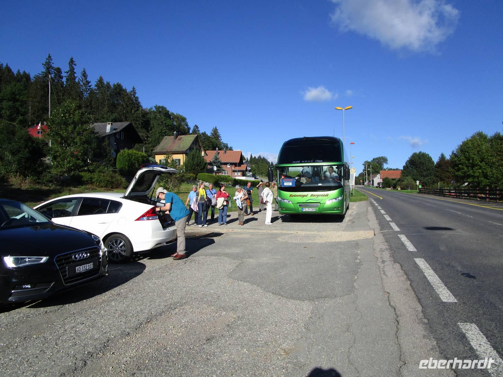 Über die Autobahn kommen wir nach Yverdon zurück, dann die Serpentinen hinauf und über den „Frank-Terpe-Weg" zum Hotel (Unser einfallsreicher Fahrer hat eine Zufahrt zum Hotel gefunden, von dem aus man noch einmal einen schönen Blick auf den fast 800 m tiefer liegenden Neuenburger See und sein Orte hat).