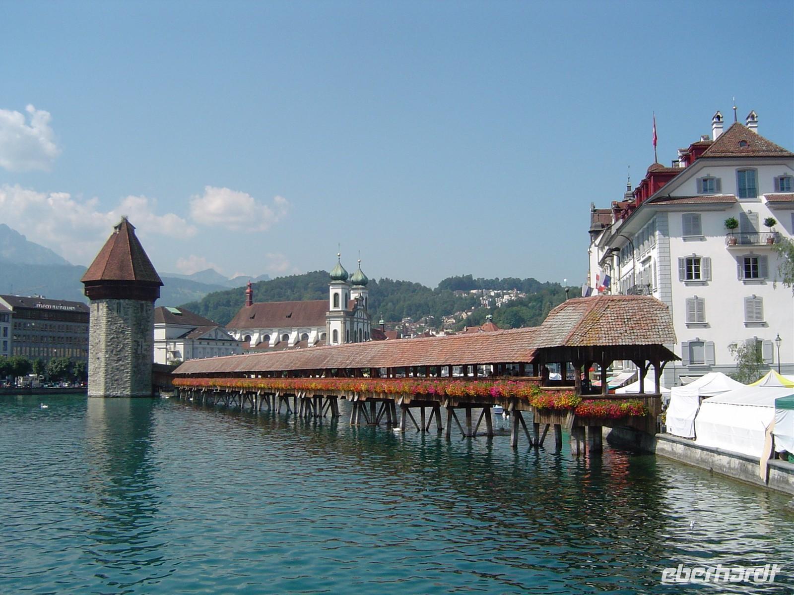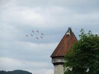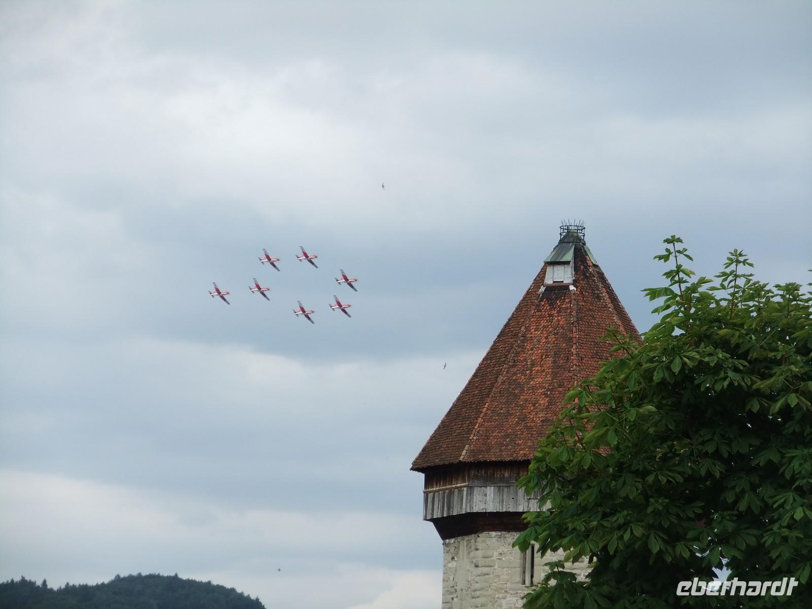 Zum Abschluss der Reise führt uns Christina durch die Altstadt von Luzern. Wir gehen über die geraniengeschmückte Kapellbrücke, die leider einen großen Teil ihrer mittelalterliche Gemälde durch einen Brand verloren hat. Das ist eine Stadt zum Bummeln, viele alte Häuser der Zünfte sind sehr gut erhalten. Da ist auch noch eine zweite gedeckte Brücke, die Spreuerbrücke. Viel Mittelalter, aber am Himmel dröhnen die Maschinen der Patrouille Suisse mit ihren waghalsigen Manövern, die für das Seefest am kommenden Tag üben.