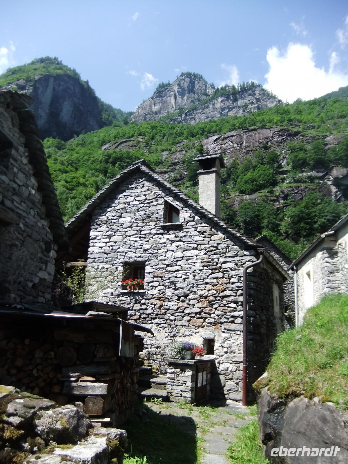 Granithäusern, sie sind meist nur im Sommer bewohnt. Es gibt in fast allen Häusern keinen Strom, obwohl in der Nähe aus Wasserkraft genügend gewonnen wird. Vieles ist verboten: Parabolspiegel, Grillplätze, Holzzäune. Das Valle Bavona ist das bestgeschützte Tal der Schweiz.