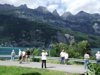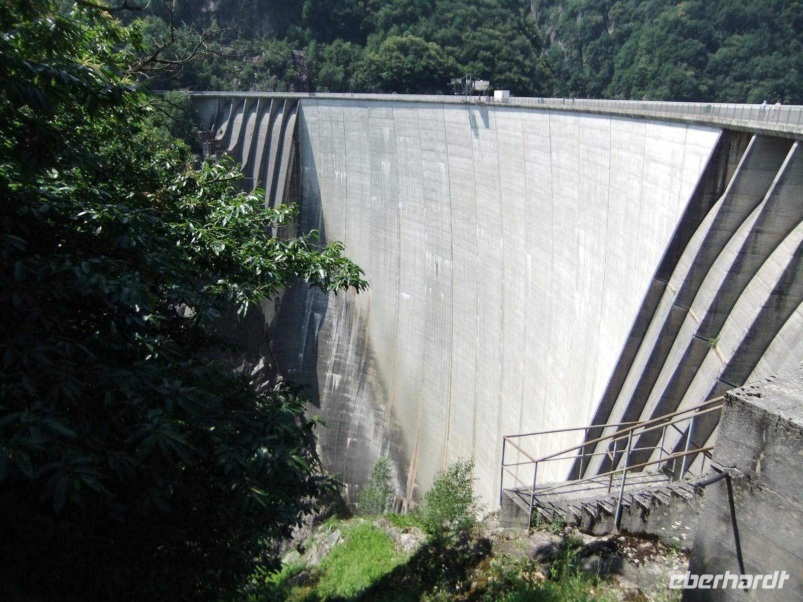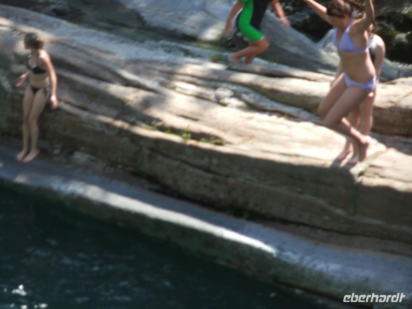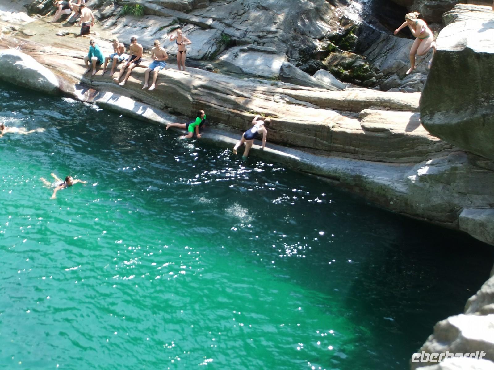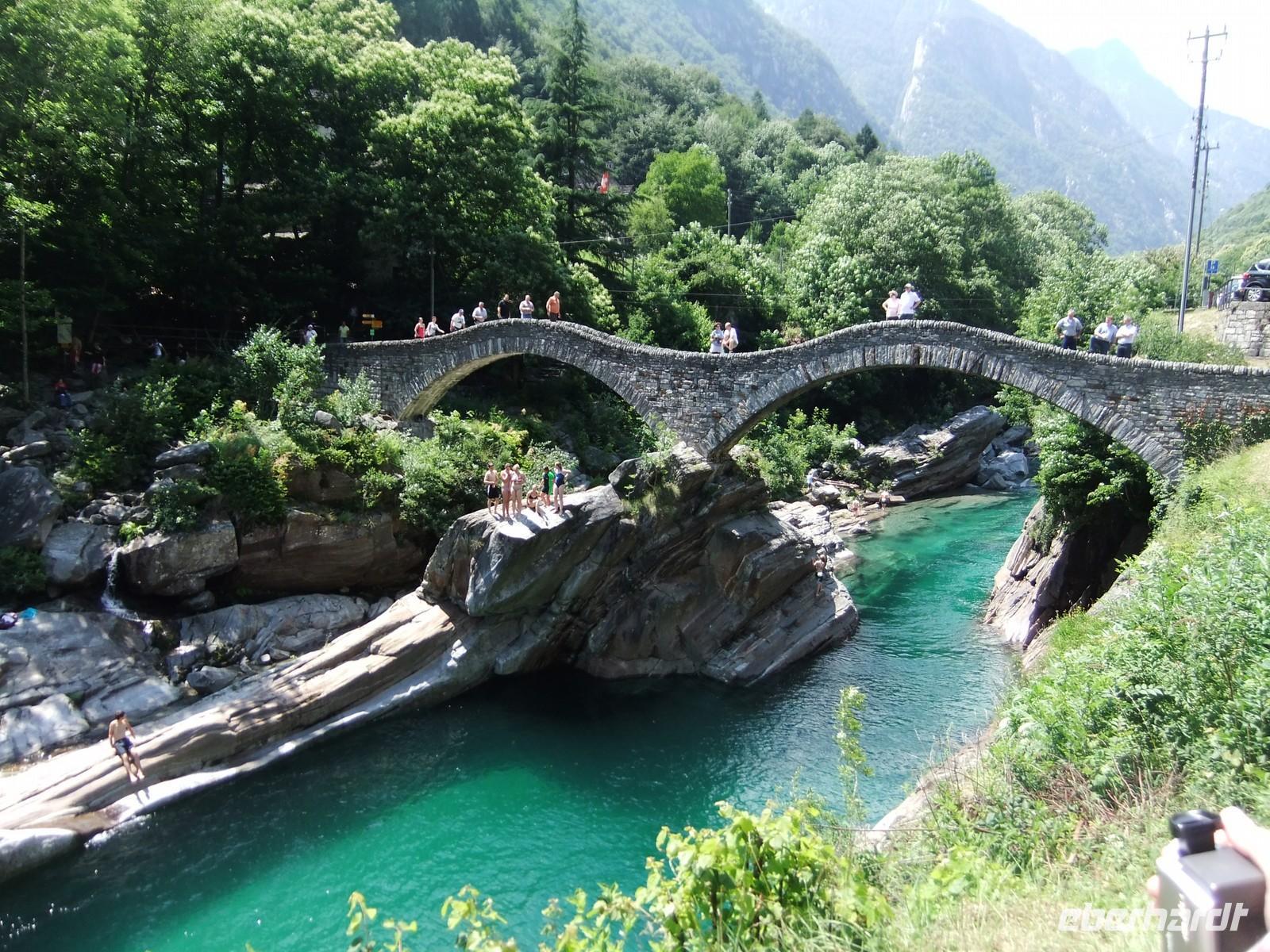Nach einer Mittagspause an der Maggia geht es wieder nach Locarno zurück. Da wir den Ort schon am Vortag besichtigt haben, bleibt genügend Zeit noch ein weiteres Hochtal zu besuchen, das Tal des Verzasco. Der Bus fährt bis Lavertazzo, dort schwingt sich eine Römerbrücke mit 2 Bögen über den Fluss. Aber die Hauptattraktion ist eine mehr als 10 m hohe Klippe an der Brücke, von der sich Jugendliche - meist sind es die Mädchen - in das grasgrüne Wasser stürzen. Für noch Mutigere steht die 220 m hohe Staumauer des Vorgono-Stausees zur Verfügung, eine Herausforderung für Bungee-Springer. James Bond hat das hier gemeistert.