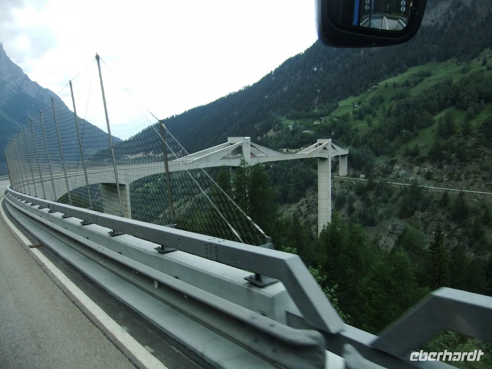 In Domodossola steht schon unser Bus wieder bereit. Wir überqueren erneut die Alpen auf einer Straße, die Napoleon so ausbauen ließ, damit auch seine Kanonen befördert werden konnten. Der Weg über den Großen Bernhard war doch zu mühselig. Nachdem 1880 bereits der 15 km lange Gotthard-Eisenbahntunnel erfolgreich die Wege Mitteleuropas nach dem Süden verkürzte, kam 1905 der 19,8 km lange Simplon-Eisenbahntunnel dazu. Die eigentlichen Helden des Tunnelbaues sind die italienischen Bauleute, von denen mancher den Bau nicht überlebte oder an den Spätfolgen der schweren und gesundheitsschädlichen Arbeit starb.