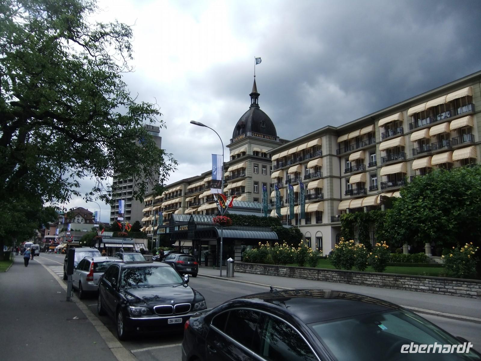 Am Thuner See entlang geht es nach Interlaken - inter lacis - der Stadt zwischen den 2 Seen, die die Aare durchfließt. Ist Luzern schon ein Muss für die Japaner (und Absatzmarkt für Souvenirs aus der Schweiz in Form erzgebirgischer Räuchermänner), so ist es Interlaken vielleicht noch mehr. Das Dreigestirn Eiger-Mönch-Jungfrau zieht ganze Scharen hierher in die Ausgangbasis zu den Eisriesen und - siehe oben - man verkauft Luft, Wasser und Berge sehr gut.