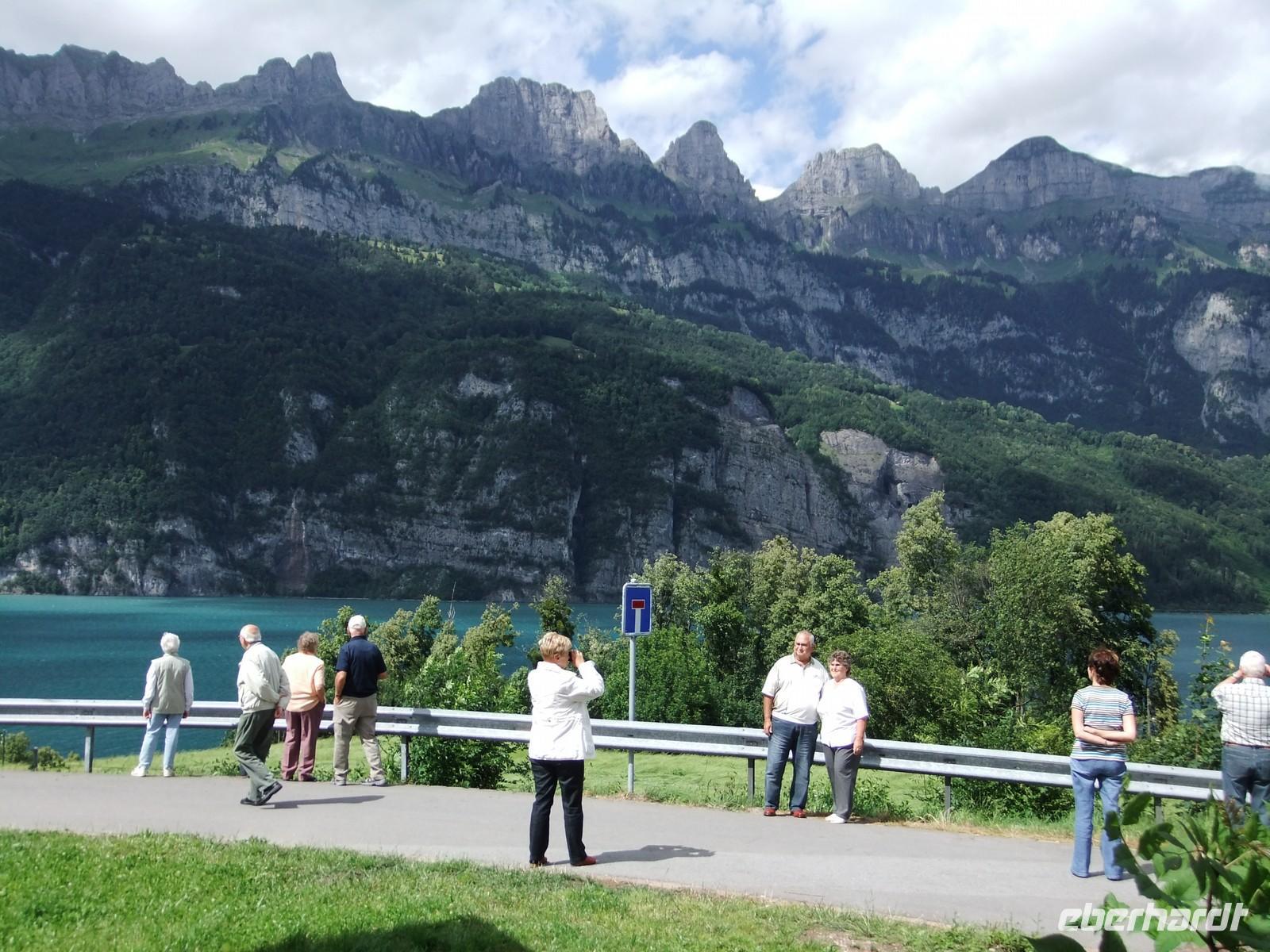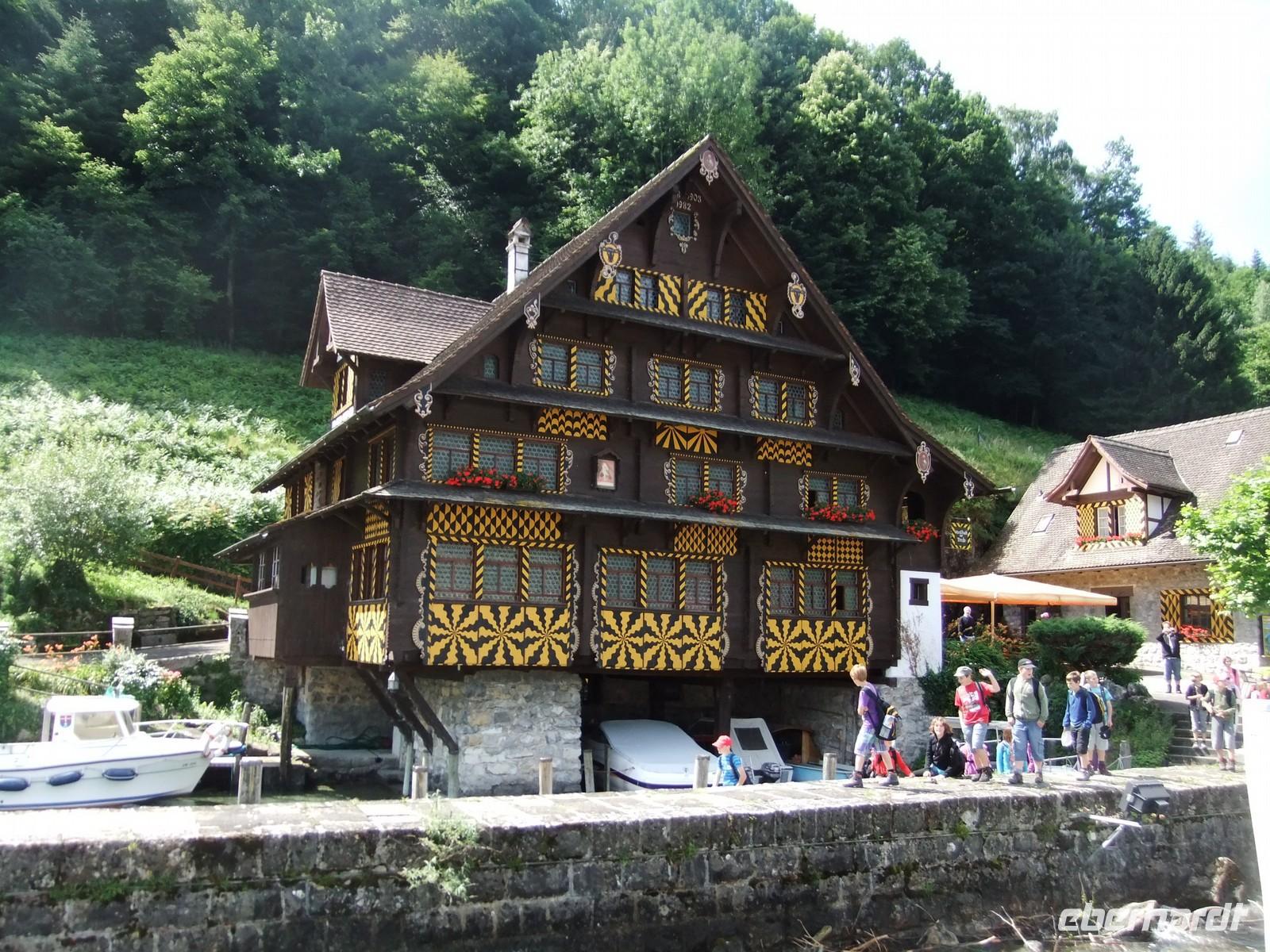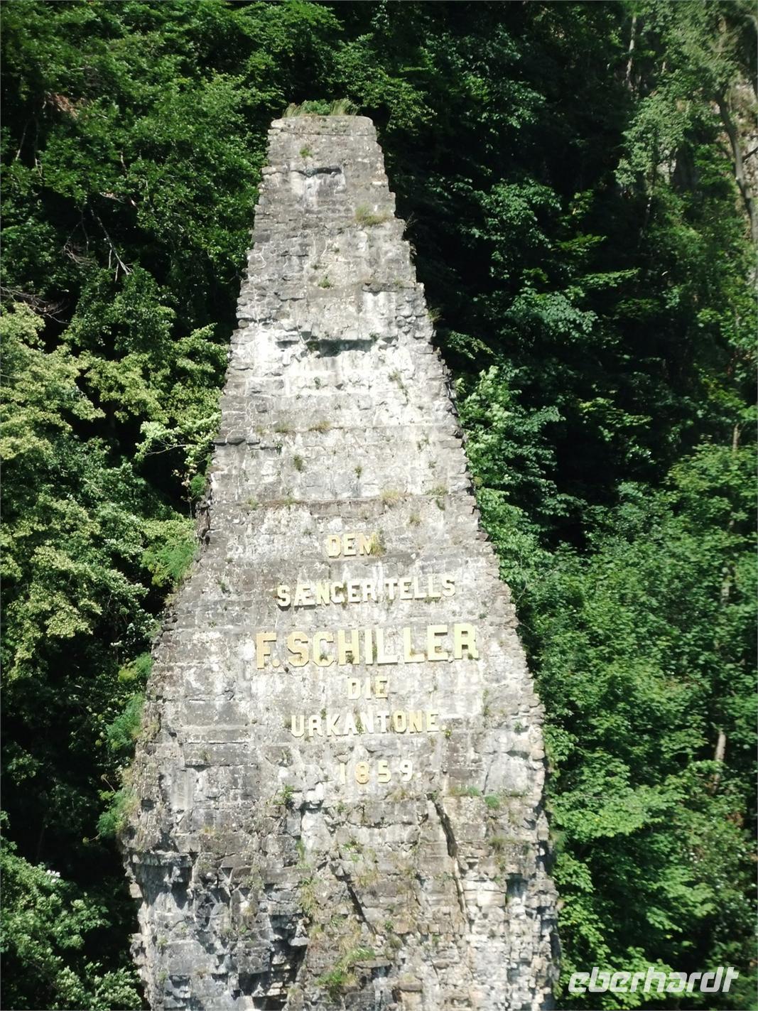 erge näher heran, werden größer. Hier ist die Heimat Wilhelm Tells, des Schweizer Nationalhelden. Hier grüßte er den Hut nicht, wurde in Flüelen gefangen, auf das Boot gebracht, rettete das Schiff vor dem Untergang und sprang an der Tellplatte in die Freiheit. Nehmen wir einmal an, es hätte ihn so gegeben, wie es Schiller beschreibt, dem die dankbaren Eidgenossen in der Nähe der Rütliwiese ein Denkmal setzten. Historisch belegt sind dafür die Zusammenkünfte der Abgesandten der Urkantone auf dieser Wiese 1291 und 1308. Aus dem Bund ging die Schweizer Konföderation hervor. Mich beeindruckt besonders, dass ein Land mit 4 verschiedenen Sprachen und Kulturkreisen als "einig Volk von Brüdern" seit über 700 Jahren zusammenhält, während in den letzten 100 Jahren alle "multinationalen" Staaten Europas zerfallen sind (Österreich-Ungarn, die Sowjetunion, die Tschechoslowakei, Jugoslawien - ich wage nicht an Belgien zu denken).
