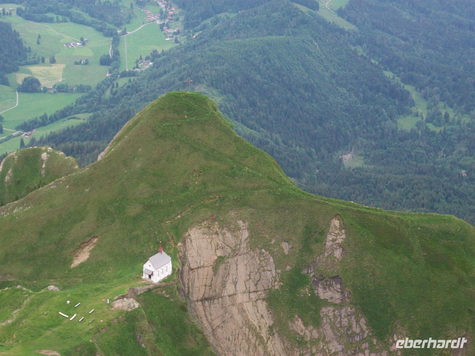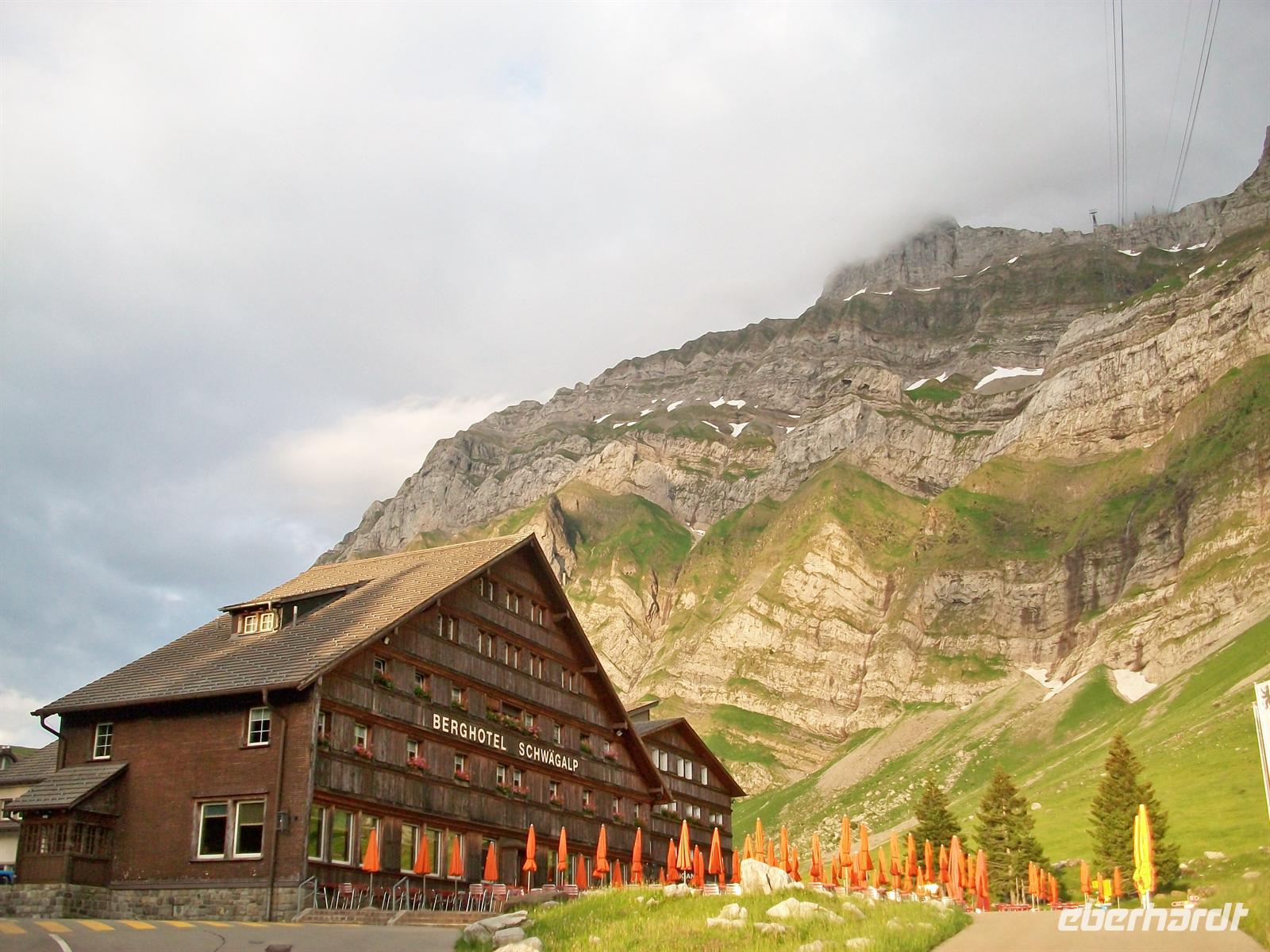 Dann nehmen wir die Fahrt wieder auf, bald sind wir auf der Landstraße unterwegs, durchqueren den Ort Urnäsch; unser Auge erfreuen die leuchtend grünen Wiesen mit den farbigen Tupfern der Sommerblumen, den Kühen des Alpenlandes kräftigende Nahrung gebend. Schon von hier sehen wir die mächtige Wand des Säntisgebirges, gekrönt von dem Mast des Fernsehturmes an der höchsten Spitze dieser Erhebungen. In letzten Serpentinen schrauben wir uns hinauf zur Schwägalp, deren Berghotel schon von weitem zu sehen ist. Beim Öffnen der Bustür empfängt mich das Gebimmel zahlreicher Kuhglocken, eine angenehme Musik dieser Berge.