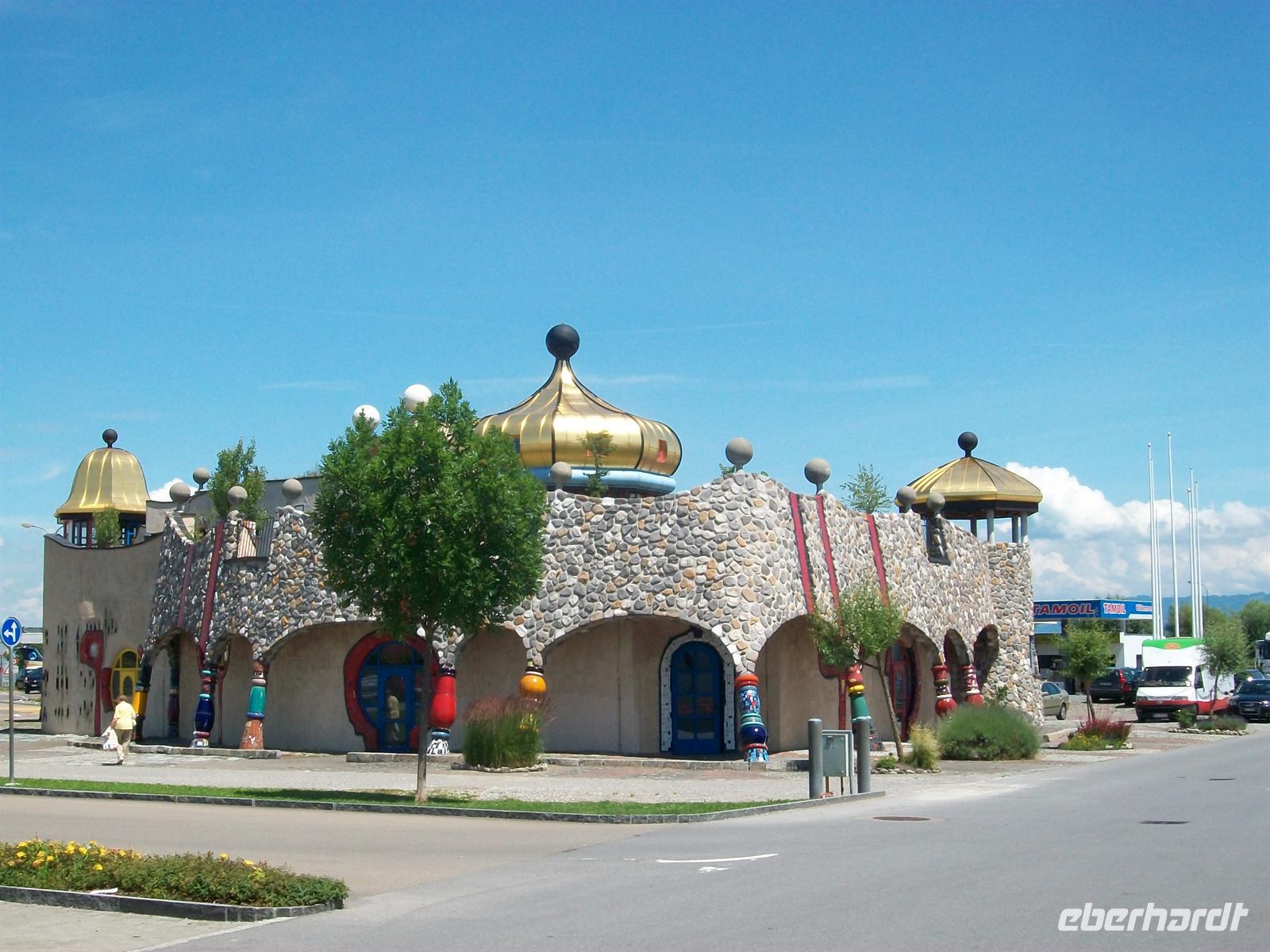 Die Landstraße führt uns zum Ort Altenrhein, schon von weitem sticht uns ein Gebäude in die Augen das gar nicht so richtig hier herpassen möchte. Der Betrachter reibt sich verwundert die Augen, nein es ist kein Trugbild und hier ist auch nicht Disneyland! Es ist eine Markthalle deren Architekt Friedensreich Hundertwasser war. Selbstverständlich machen wir hier einen Fotostopp.