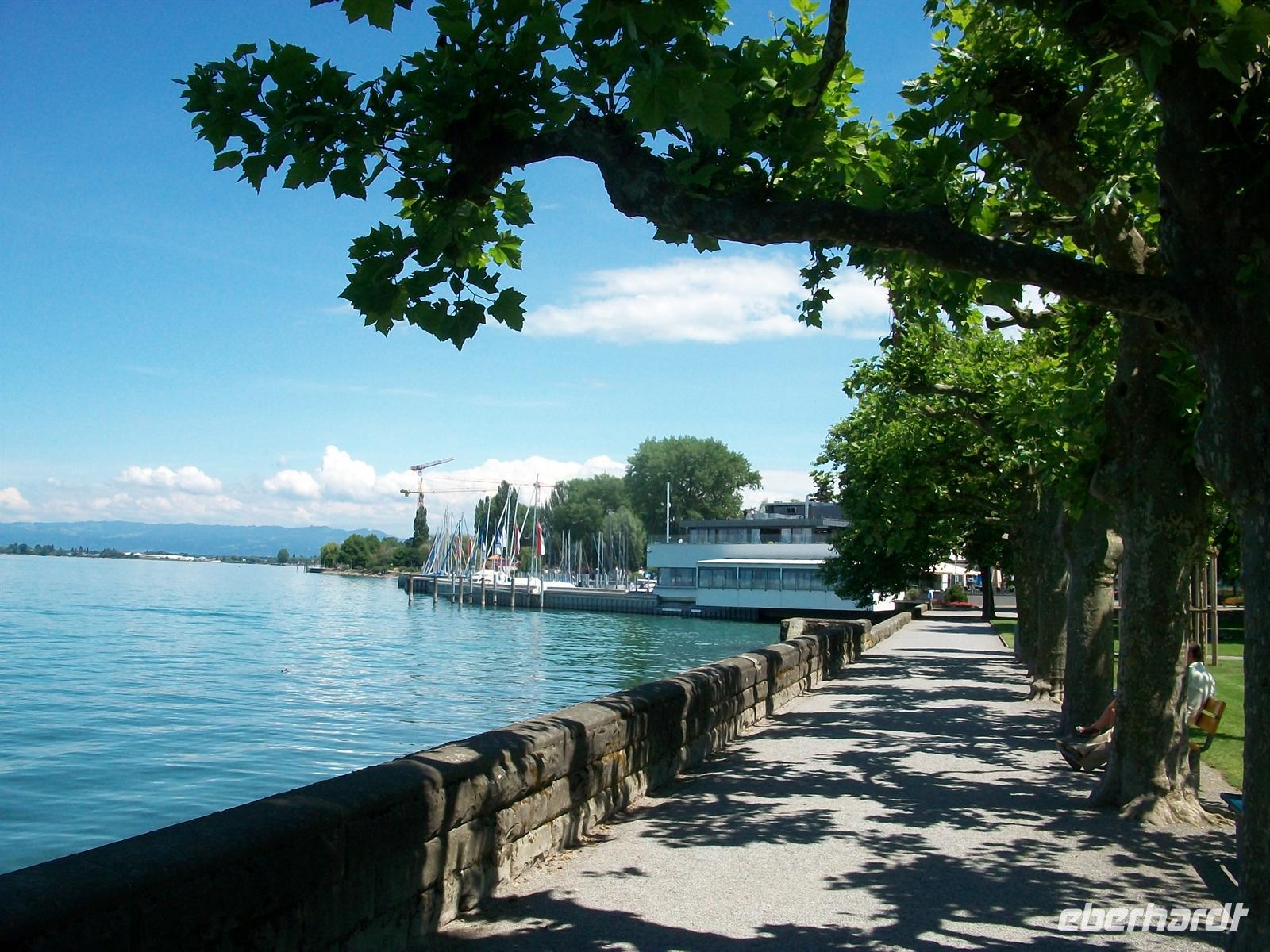 Dann führt uns der weitere Weg immer entlang des Bodensees, seine mächtige Wasserfläche glitzert in der Nachmittagssonne und im Ort Rohrschach legen wir eine einstündige Pause zum Bummeln ein. Viele Bänke laden an der Uferpromenade zum Sitzen ein, von hier schweift der Blick ans gegenüberliegende Ufer, über dem Wasser fliegen in großen Kreisen Wasservögel die sich an diesem angenehmen Sommertag genauso wohlfühlen wie wir.