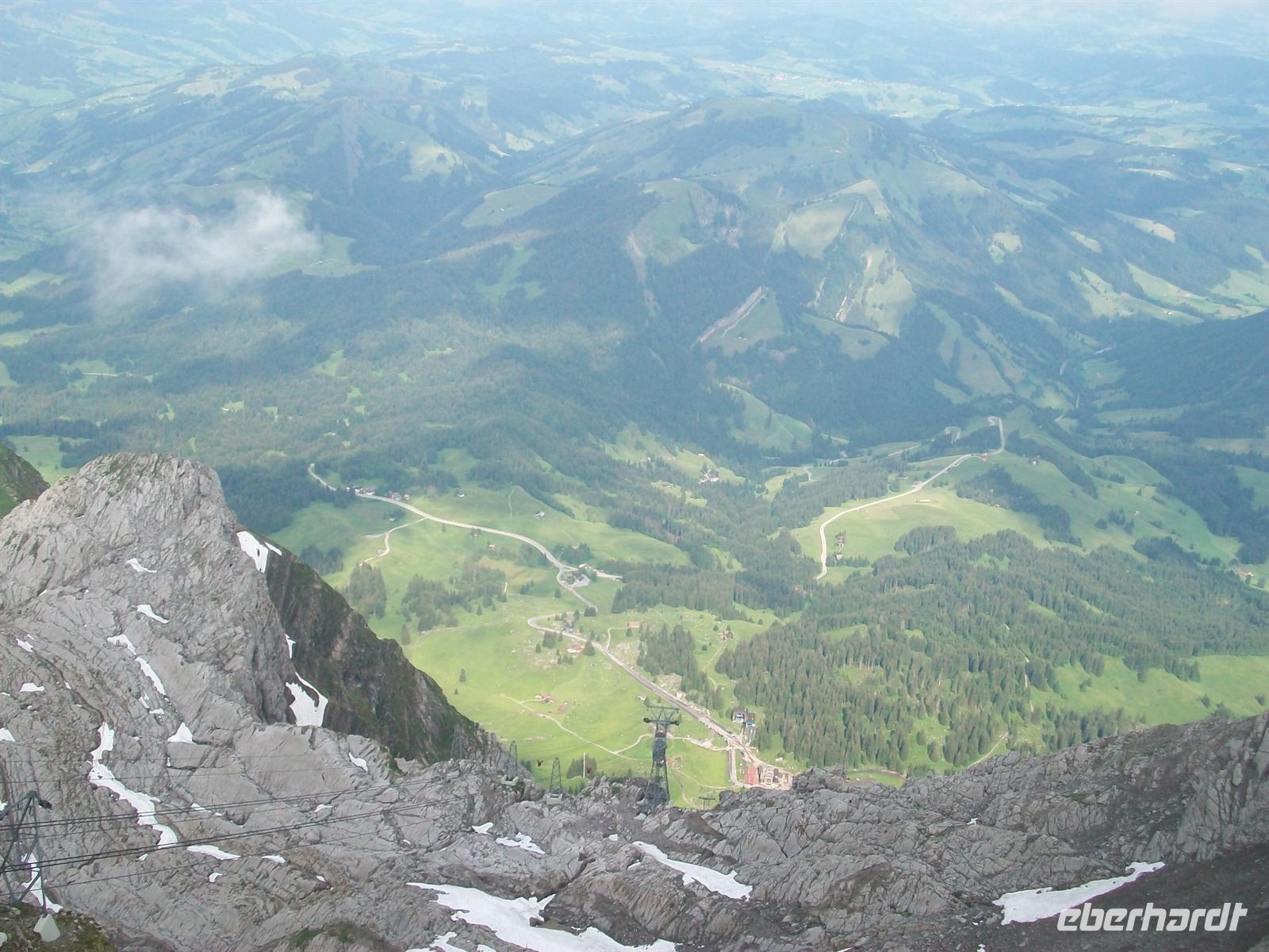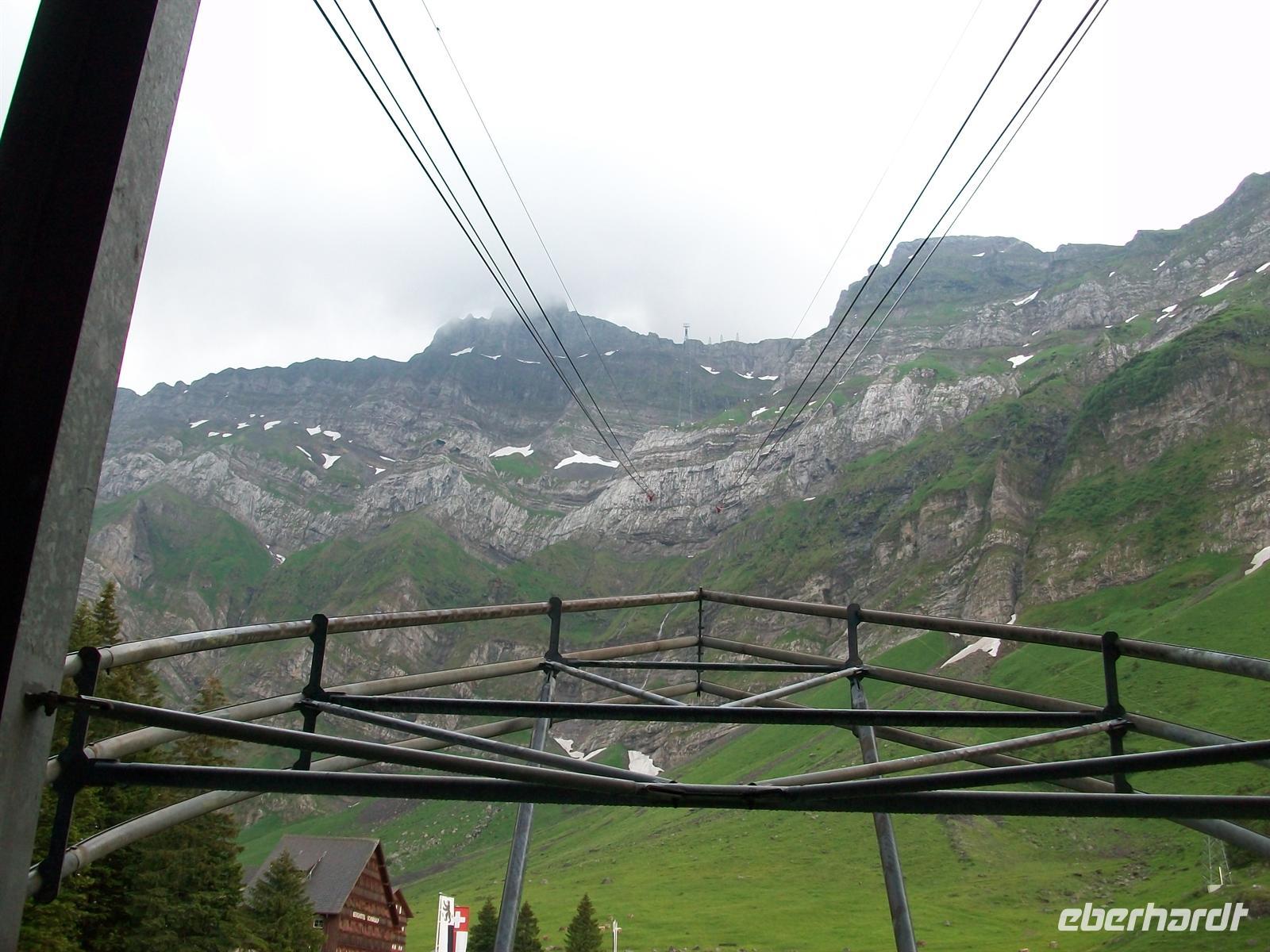 zehnminütigen Auffahrt haben wir einen schönen Ausblick auf die Schwägalp und die umliegenden Berge. Wie Miniaturen liegen die Häuser unter uns.