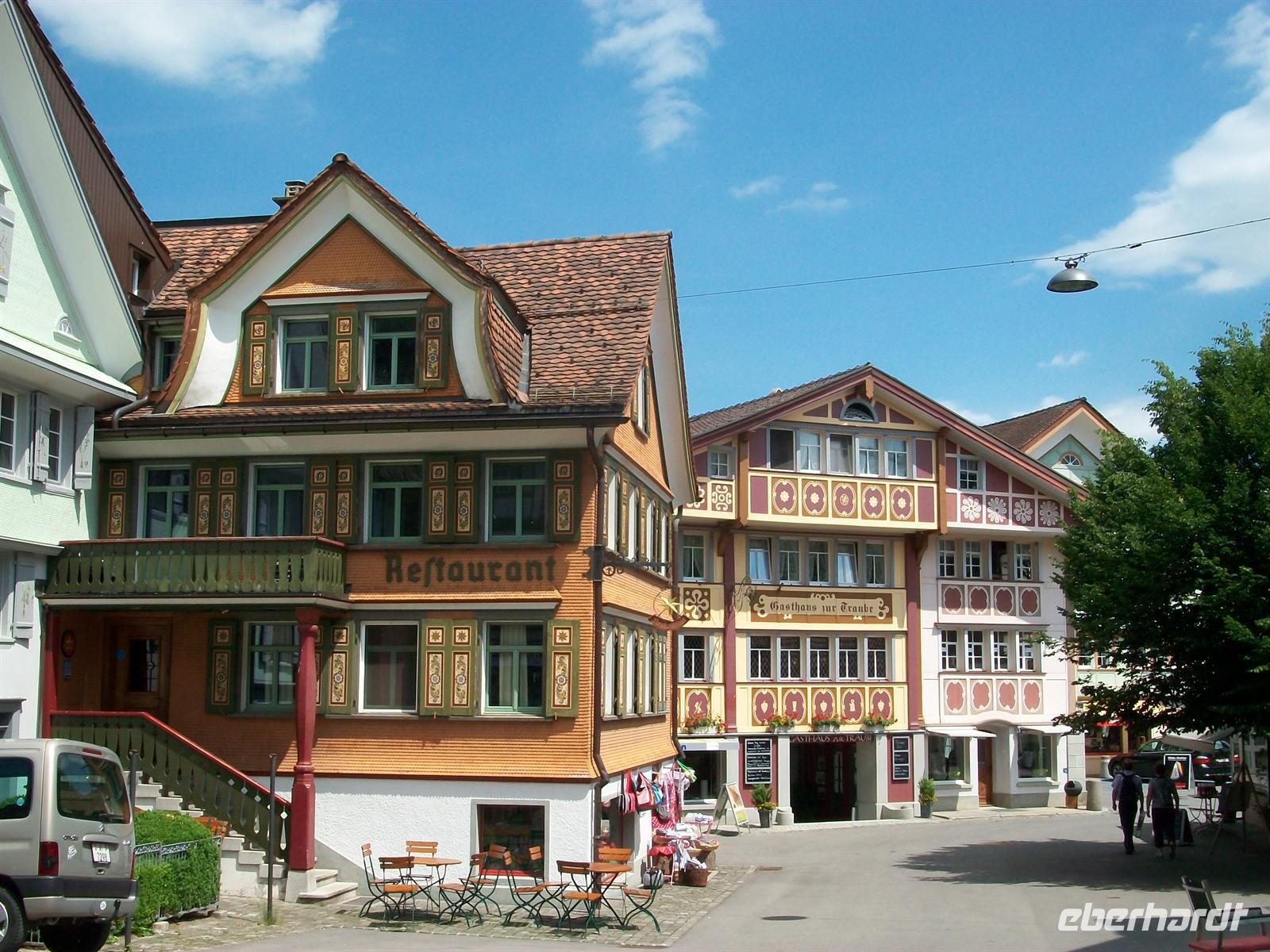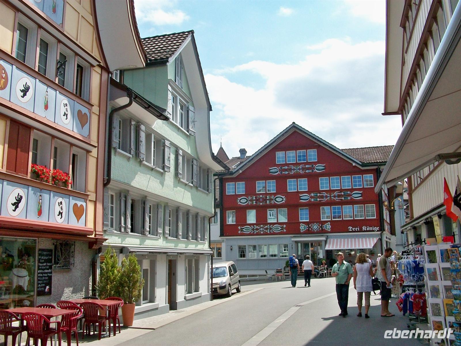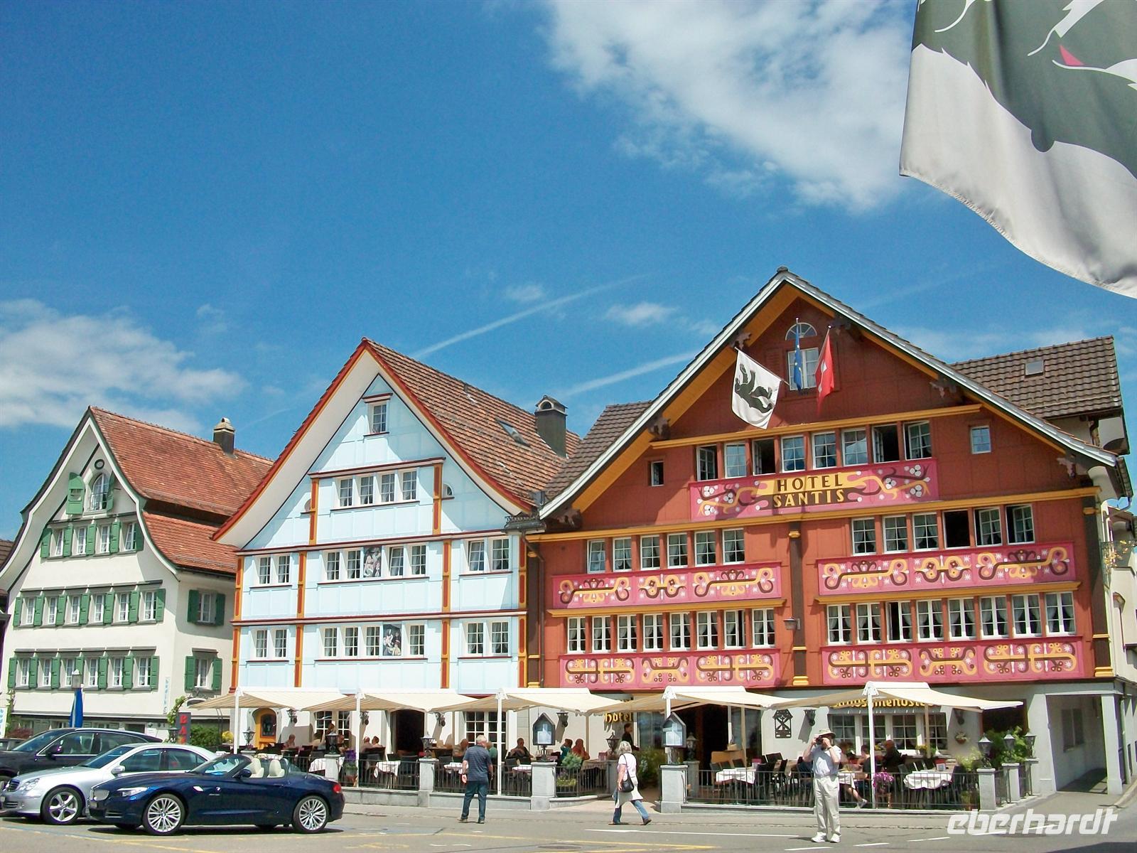 Nach der Abfahrt sitzen wir bald wieder im Reisebus um den äußerst reizvollen Ort Appenzell zu besuchen. Er gab der ganzen Region den Namen, wir kommen kurz vor zwölf an und werden uns eine gute Stunde hier aufhalten. Die Sonne hat sich nun endgültig Bahn gebrochen und bescheint auf unserem Rundgang durch den Ort die überaus schön bemalten Holzhäuser mit ihrem verschwenderischen Blumenschmuck.