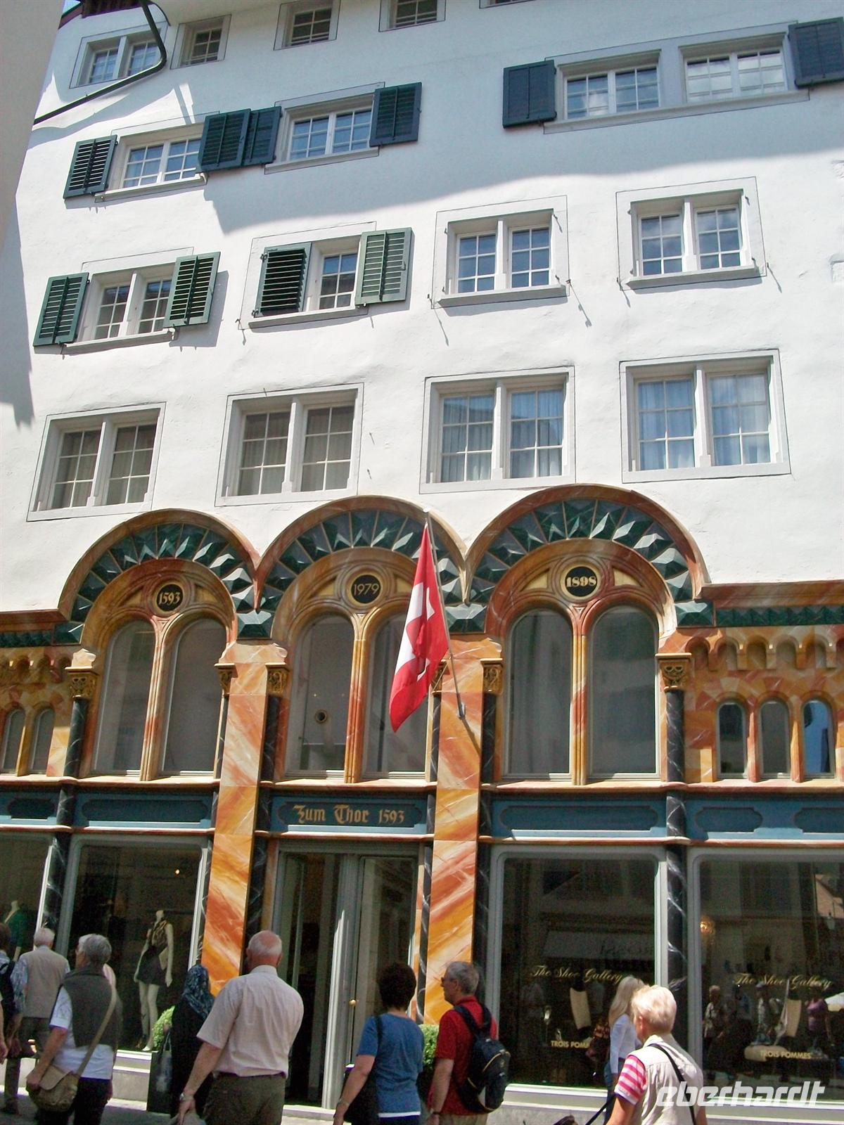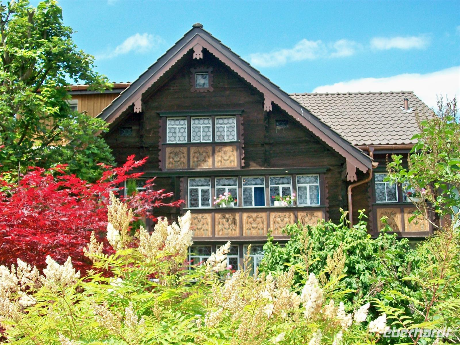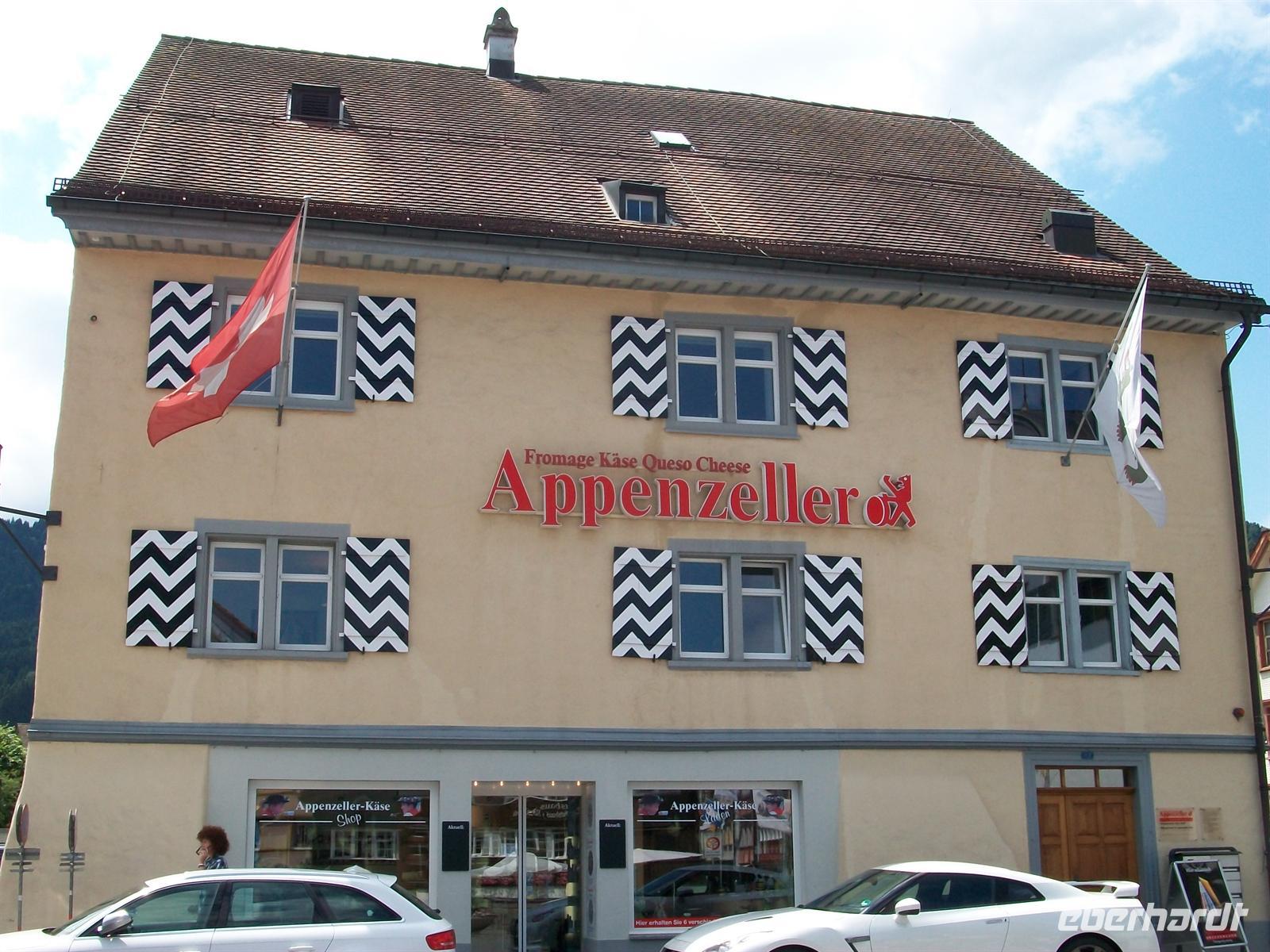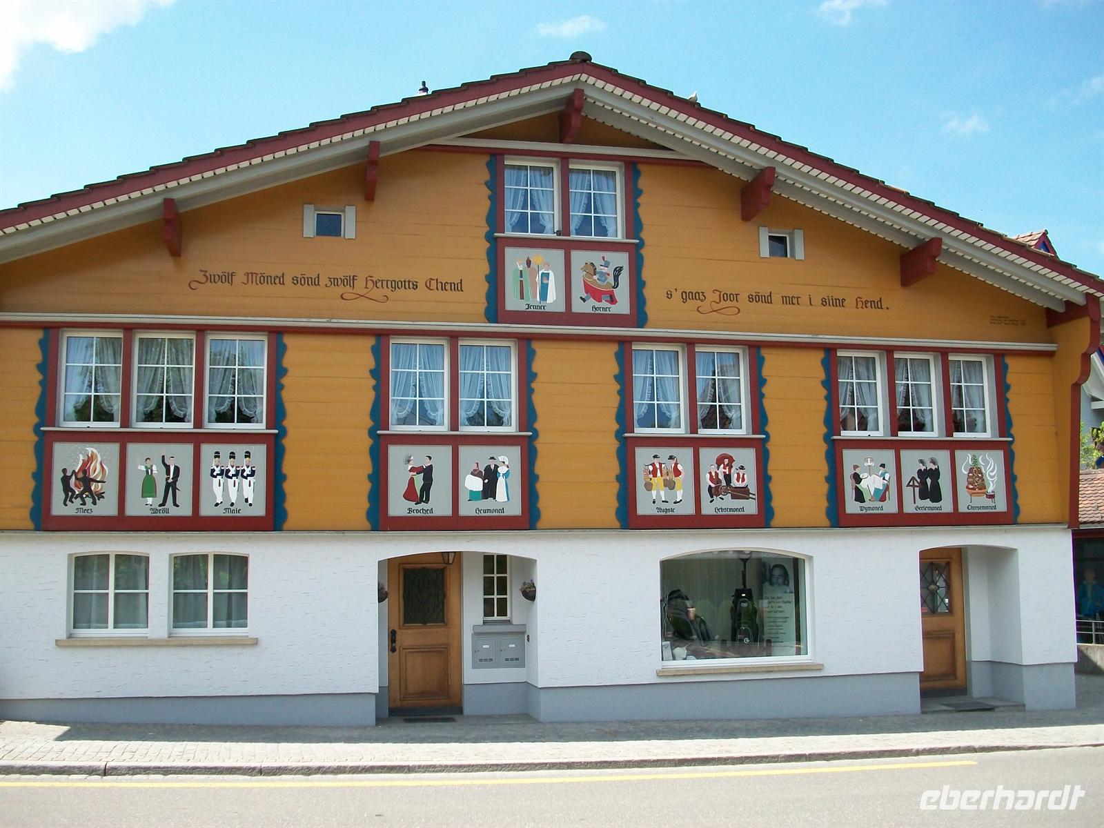 Nach der Abfahrt sitzen wir bald wieder im Reisebus um den äußerst reizvollen Ort Appenzell zu besuchen. Er gab der ganzen Region den Namen, wir kommen kurz vor zwölf an und werden uns eine gute Stunde hier aufhalten. Die Sonne hat sich nun endgültig Bahn gebrochen und bescheint auf unserem Rundgang durch den Ort die überaus schön bemalten Holzhäuser mit ihrem verschwenderischen Blumenschmuck.