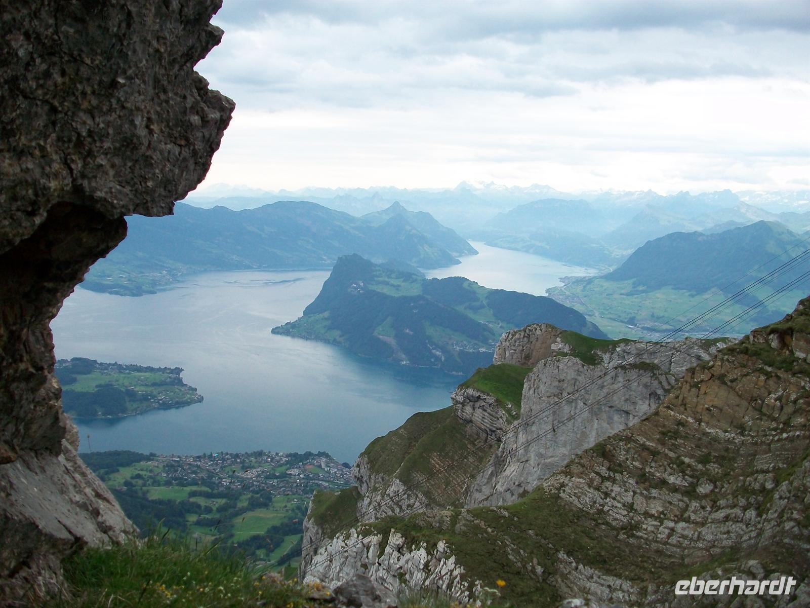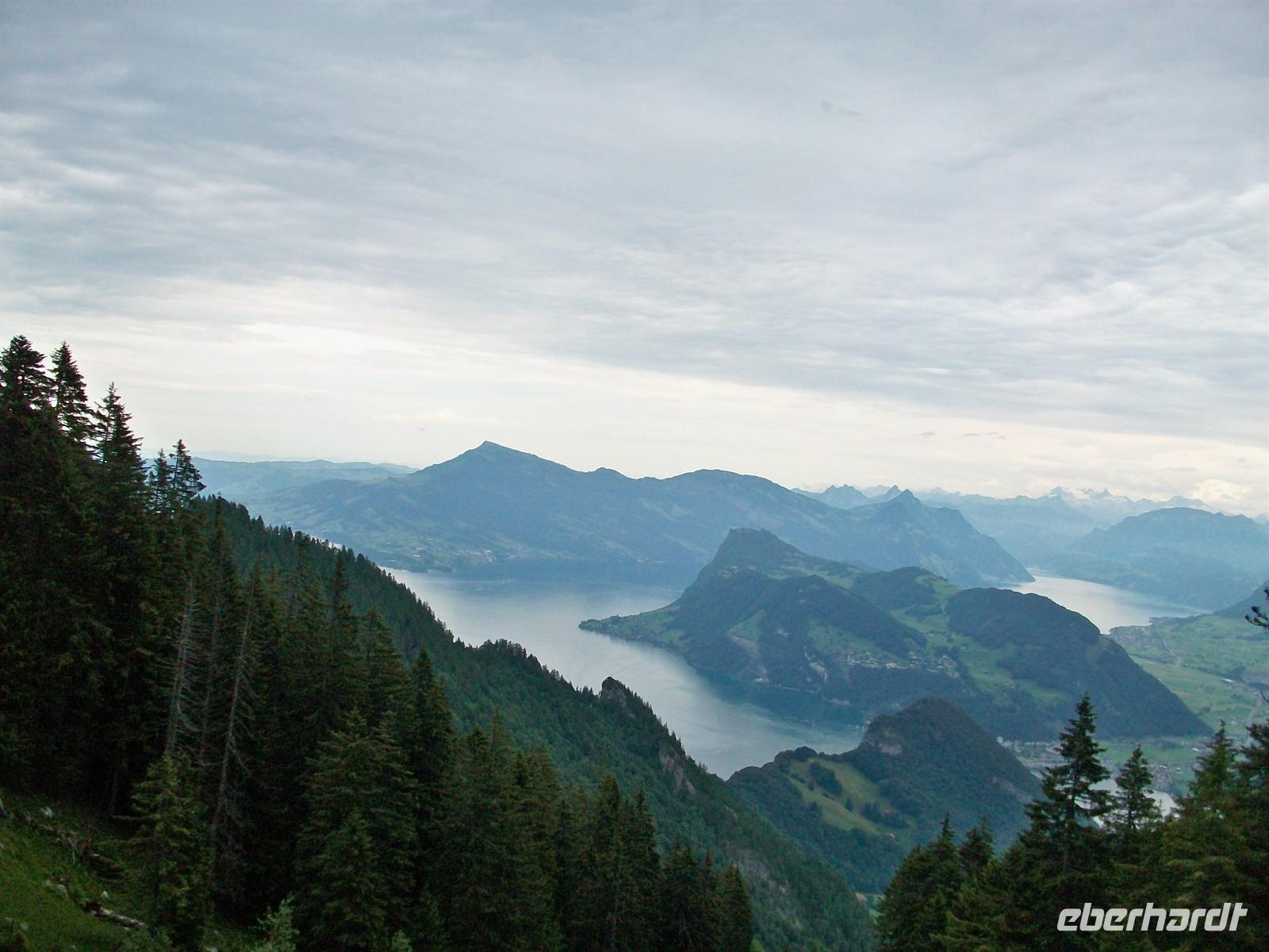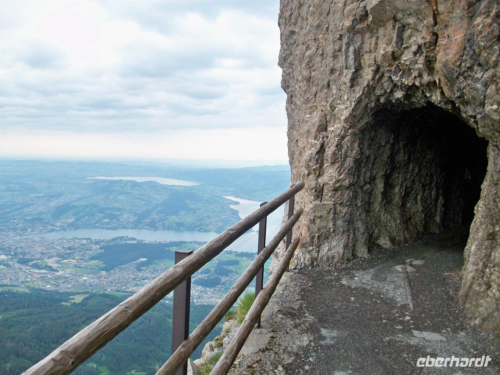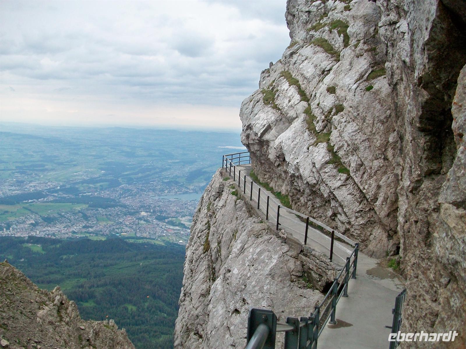 Es sind jedoch größere Wolkenformationen unterwegs die bald die Sicht einschränken werden, doch bis dahin bleibt noch Zeit für die zahlreichen Wege und Aussichtspunkte mit Blick in die Berge und hinunter zur mächtigen Wasserfläche des Vierwaldstätter See und dem Ort Luzern. Von unten ziehen nun die wabernden Gespinste lockerer Wolken herauf und bald ist der Gipfel des Pilatus eingehüllt in einen undurchdringlichen kalt- feuchten Nebel.