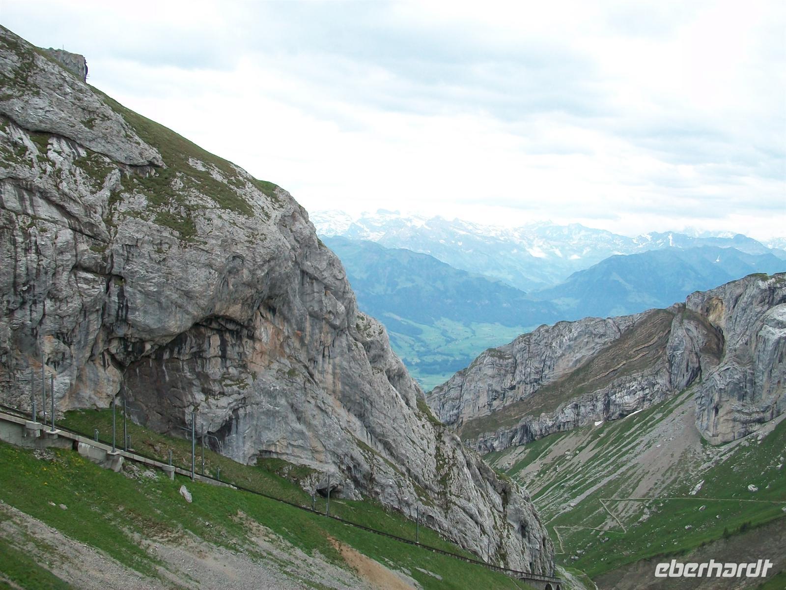 Pünktlich 11.00 Uhr pfeift der Fahrdienstleiter den Zug ab, die Fahrt mit Hilfe der Zahnradtechnik aufwärts beginnt. Nur die ersten Meter verlaufen im Freien, das mächtige Felsmassiv mit seinen Gletschermassen kommt ganz nahe, dann verschwinden wir im Berg.