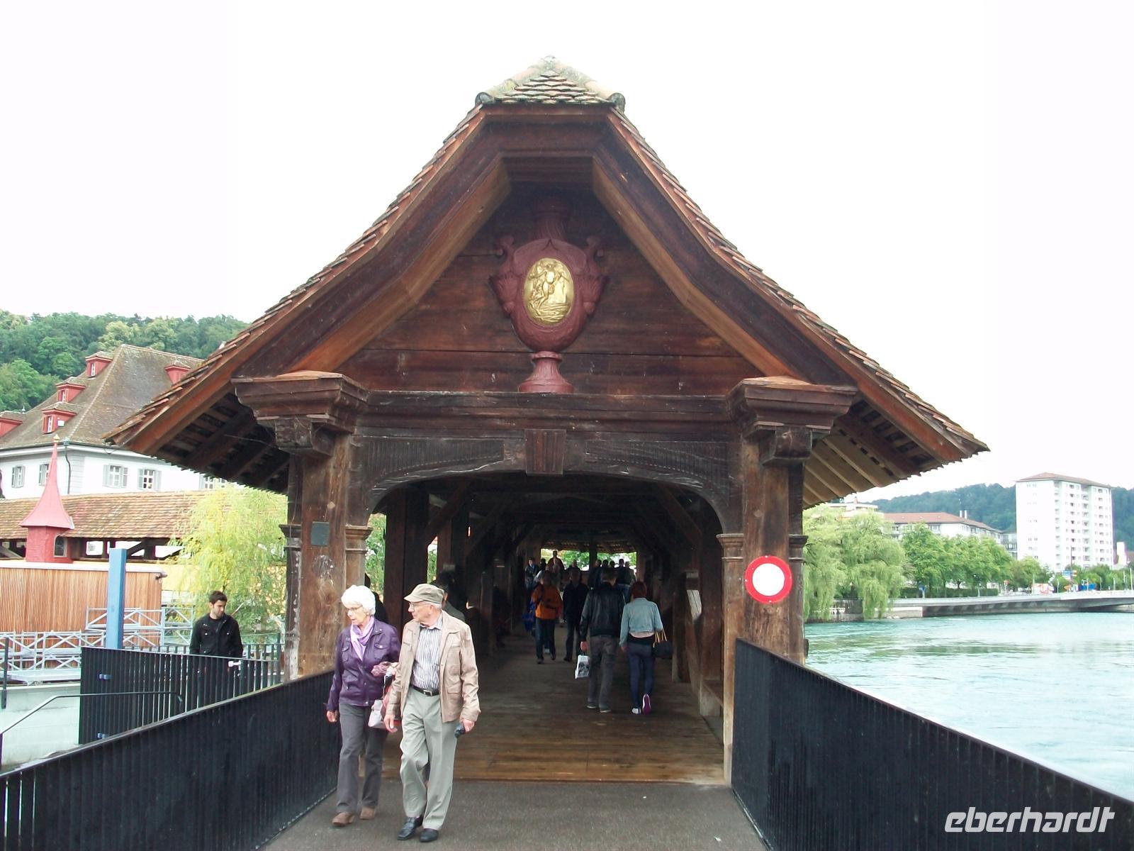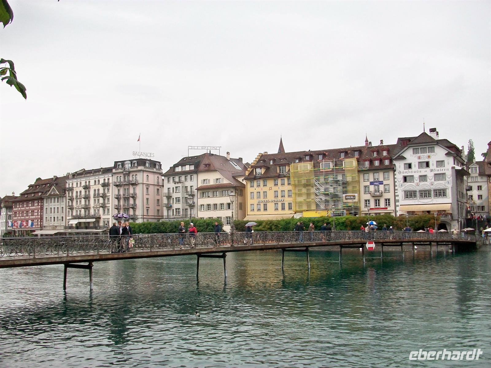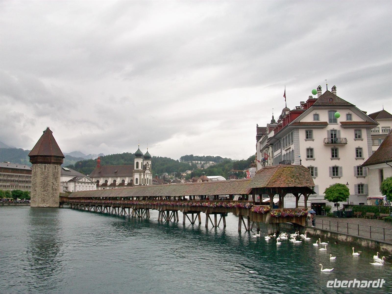 Halb zwölf treffen wir unsere Stadtführerin und dann sind wir schon unterwegs zu den Höhepunkten dieser Stadt. Wir überqueren die Kapellbrücke mit ihrem hübschen Blumenschmuck, schauen in die überaus reichlich ausgestattete Jesuitenkirche hinein und durchstreifen im Anschluss die pittoreske Altstadt mit ihren gepflegten Bürgerhäusern und schönen Fußgängerzonen. Da dieser historische Kern vollständig erhalten blieb ist es auch immer eine Zeitreise; schon Goethes Augen ruhten seinerzeit auf diesem schönen Ensemble.