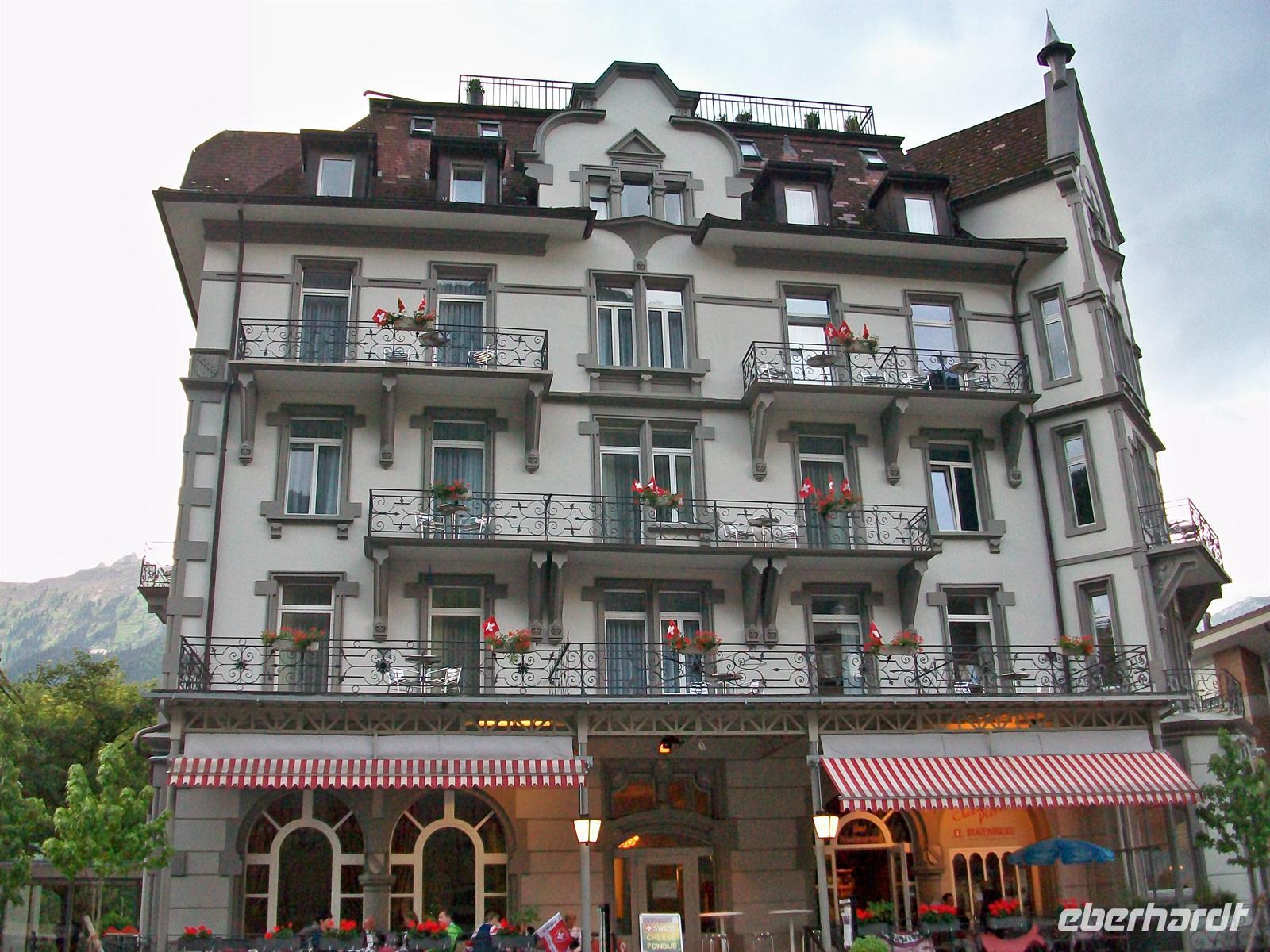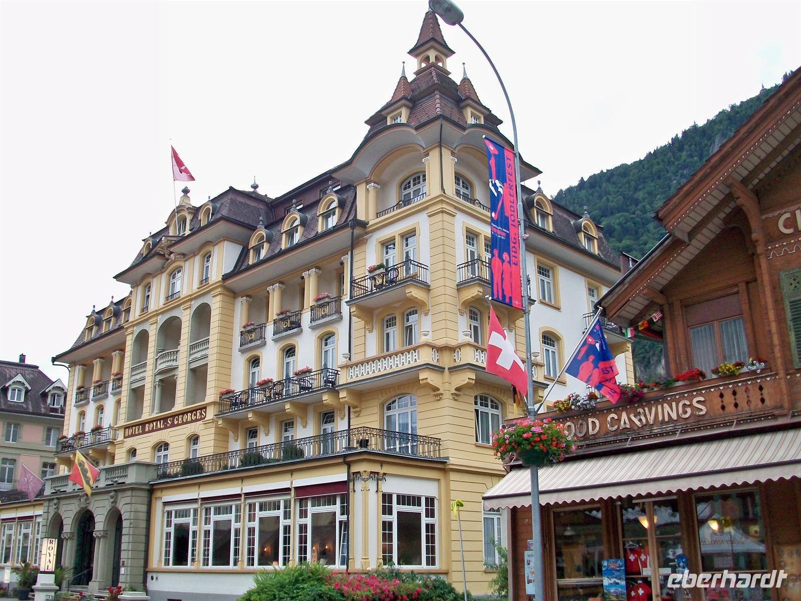 An diesem Tag ist Interlaken im Ausnahmezustand. Ich bin auf dem Weg zum Bahnhof um für die Reisegäste die Festtagsabzeichen zu holen die als Eintrittskarte gelten. Im Festzelt vor dem Hotel war die ganze Nacht Betrieb; einige junge Männer die durchgezecht haben, sind heute Morgen in einem recht bedenklichen Zustand.